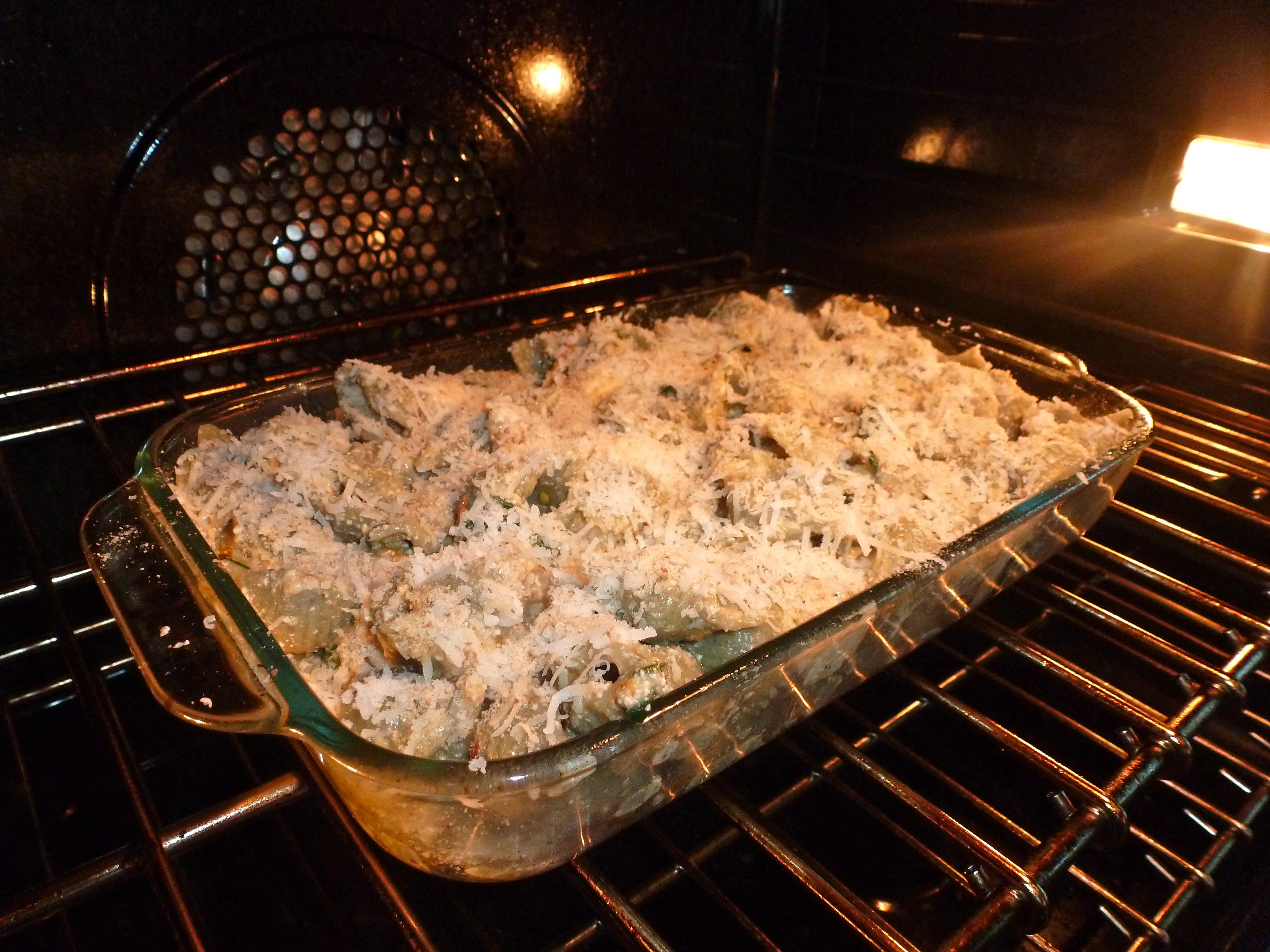 The mixture went into a glass pan, and I sprinkled the top with fresh parmesan cheese. I also added some Italian breadcrumbs, just because I had some. Into the oven at 350 degrees, and then I had 25 minutes or so to sit around and drink more wine. Hooray!