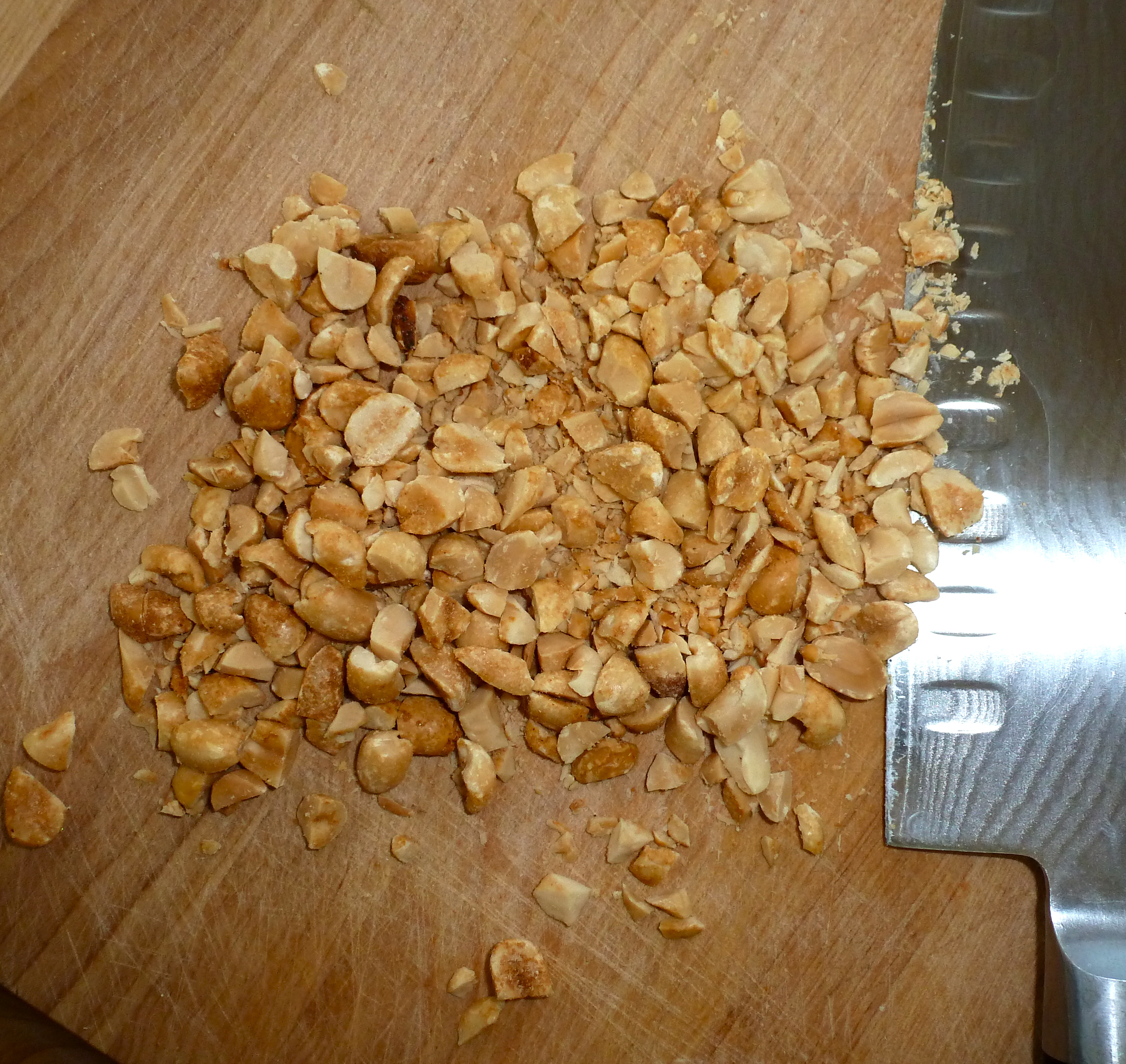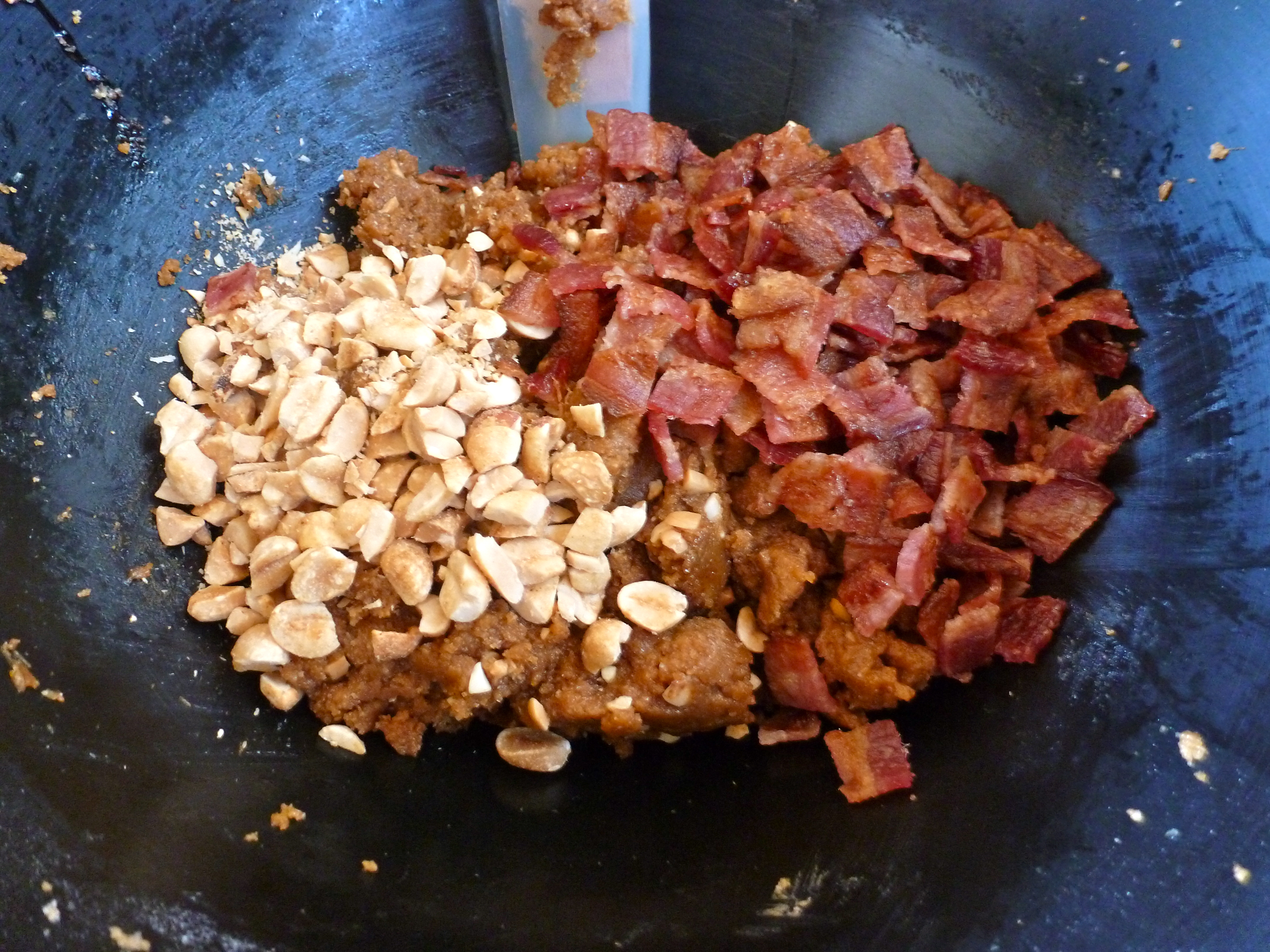 That’s really it! The dough was a tad dense, not fluffy. I folded in some chopped roasted peanuts and the bacon crumbles. This was crazy! This was GOOD.