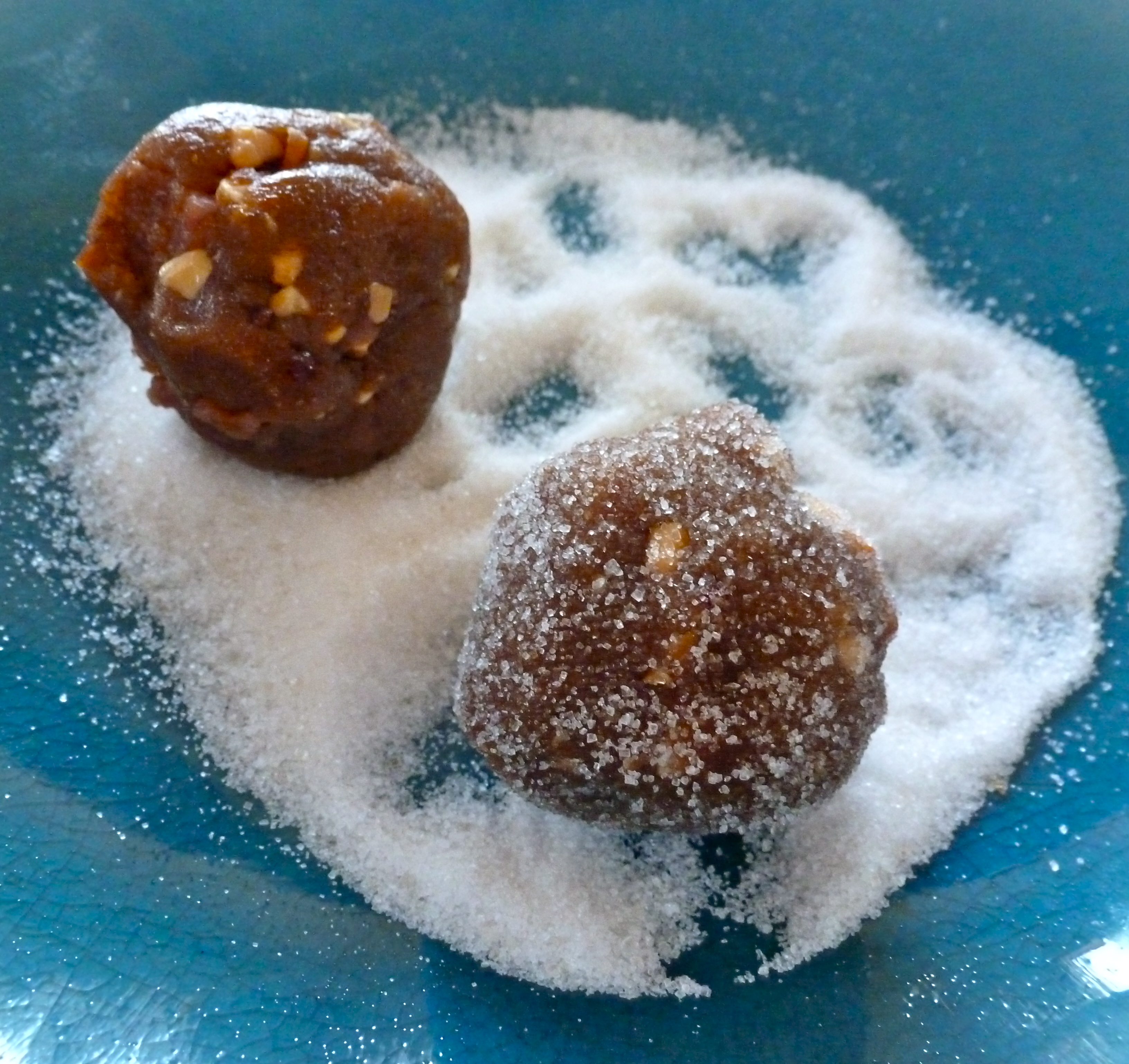 I formed the dough into little balls. It was kind of crumbly, as the recipe warned it might be. The little dough balls rolled around in a pile of sugar and then got criss-crossed, old school style, before baking.