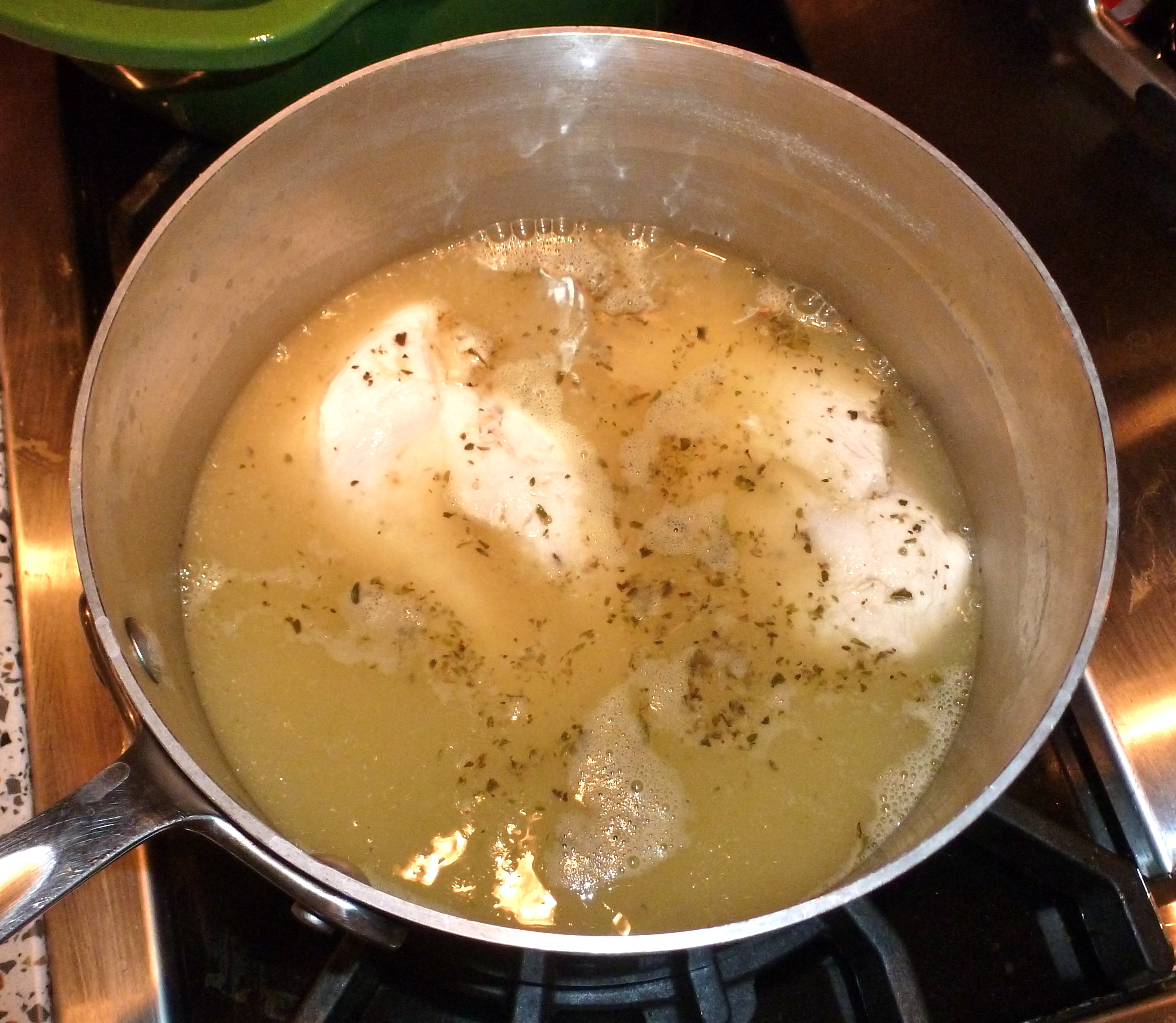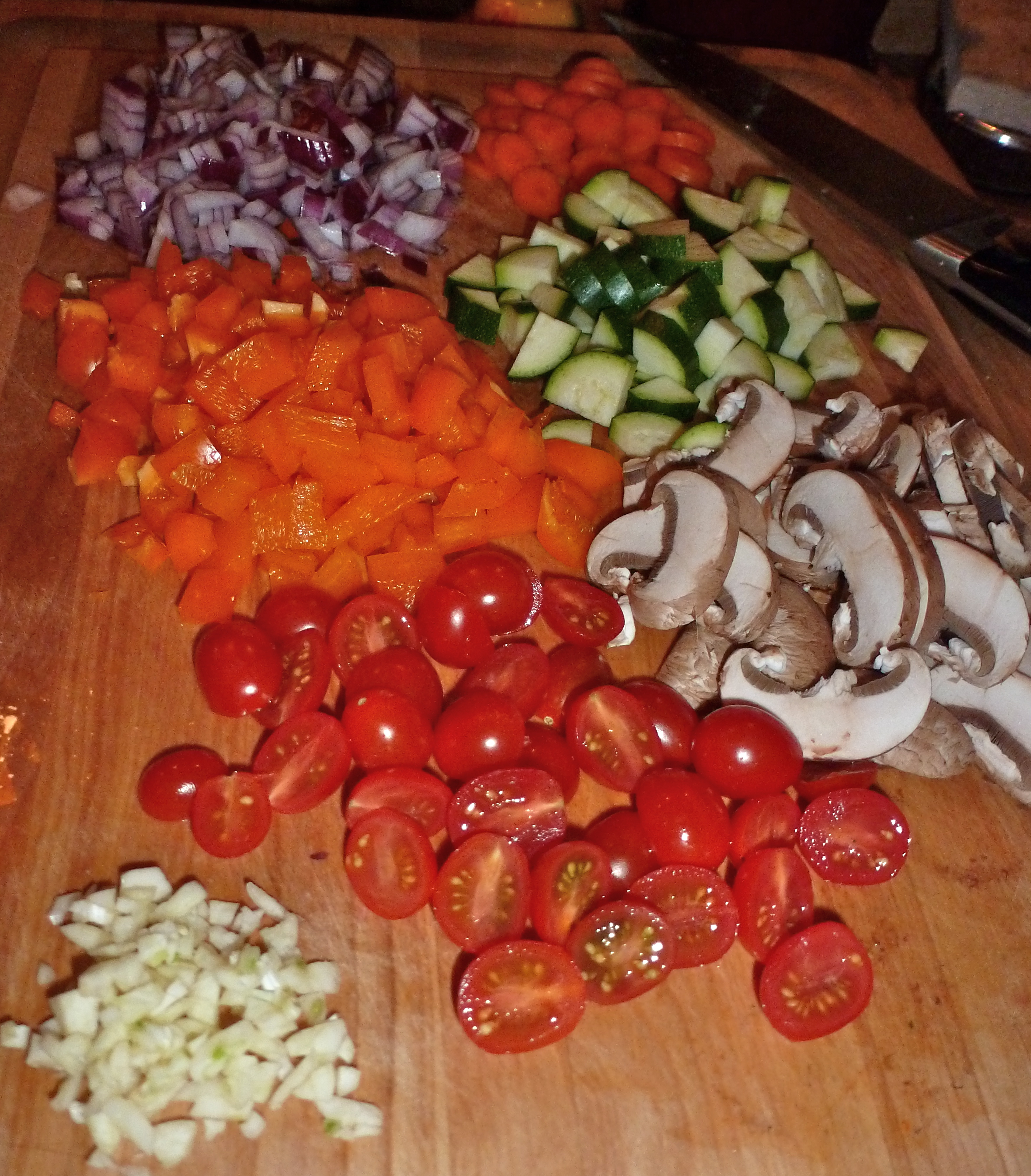 First, I poached two chicken breasts in stock (seasoned with a bit of garlic salt and a lot of oregano) and chopped them up. I got the brown rice started on the stove. Then, I prepped all of the delish veggies.