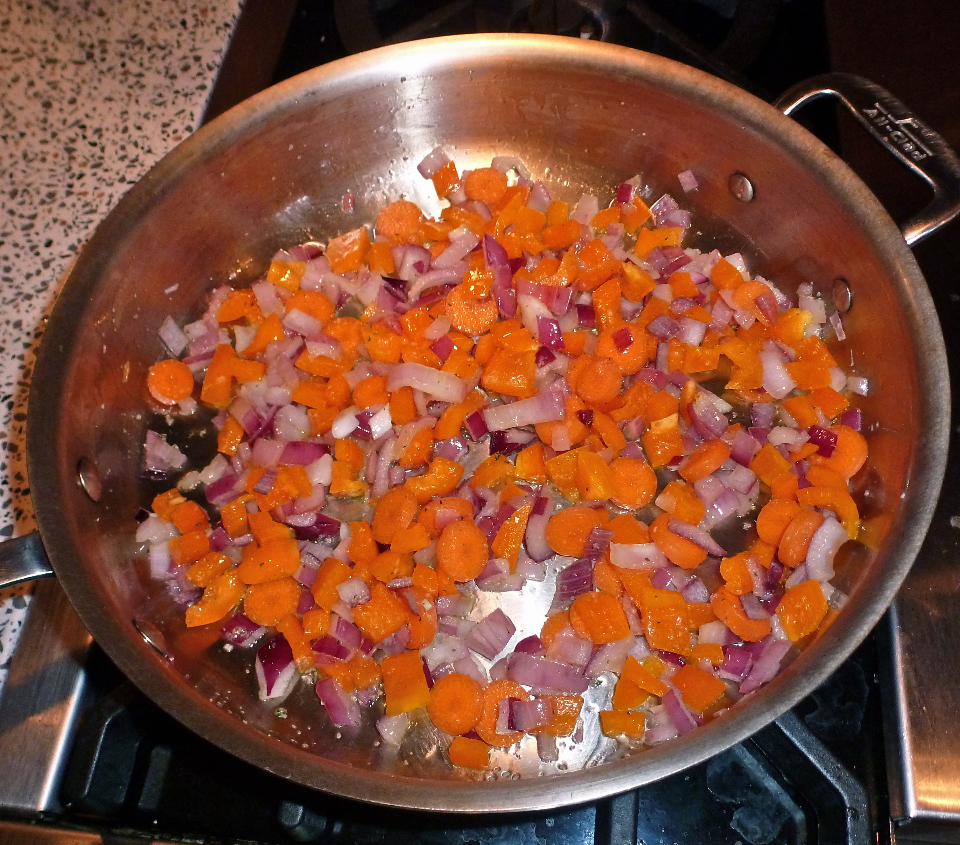 Next came the stovetop portion of the process. Into some hot oil went the onion, carrot, and orange bell pepper.