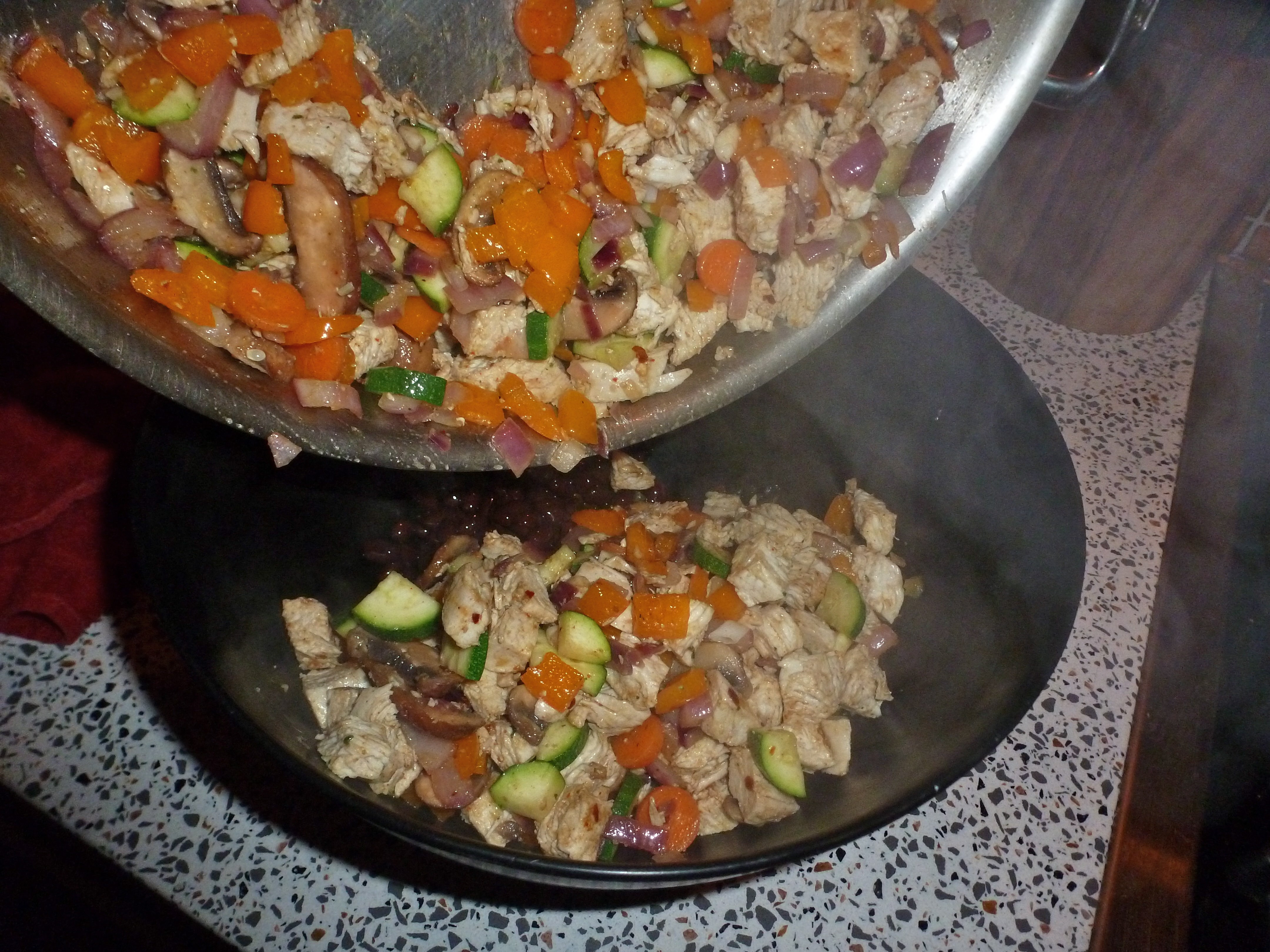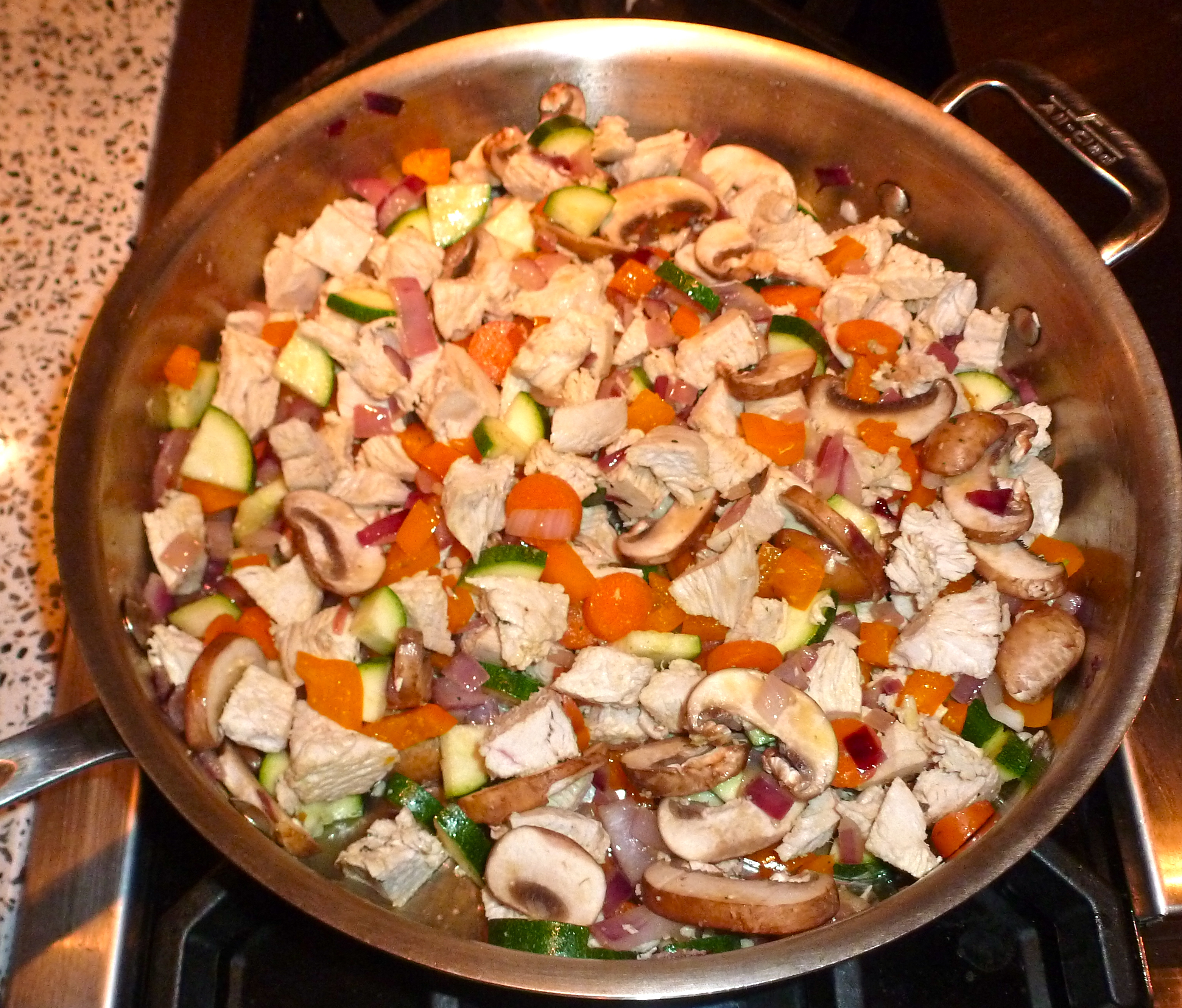 Next came the mushrooms, zucchini, garlic, the chopped chicken, and some spices (cumin, cayenne pepper, crushed red pepper).