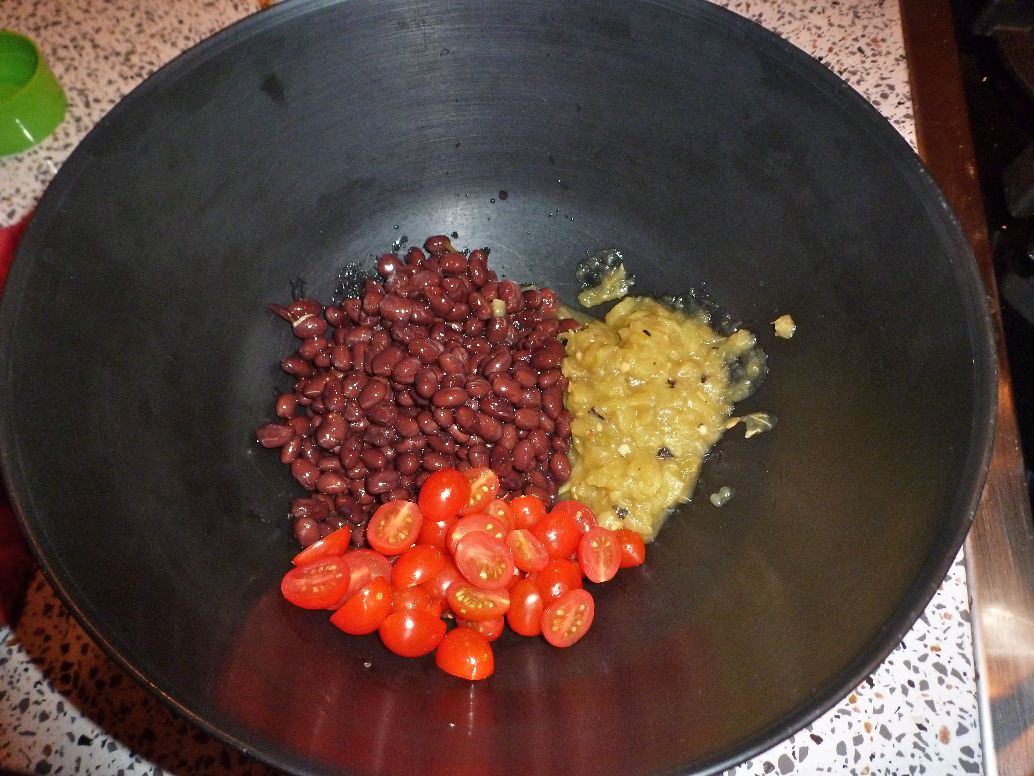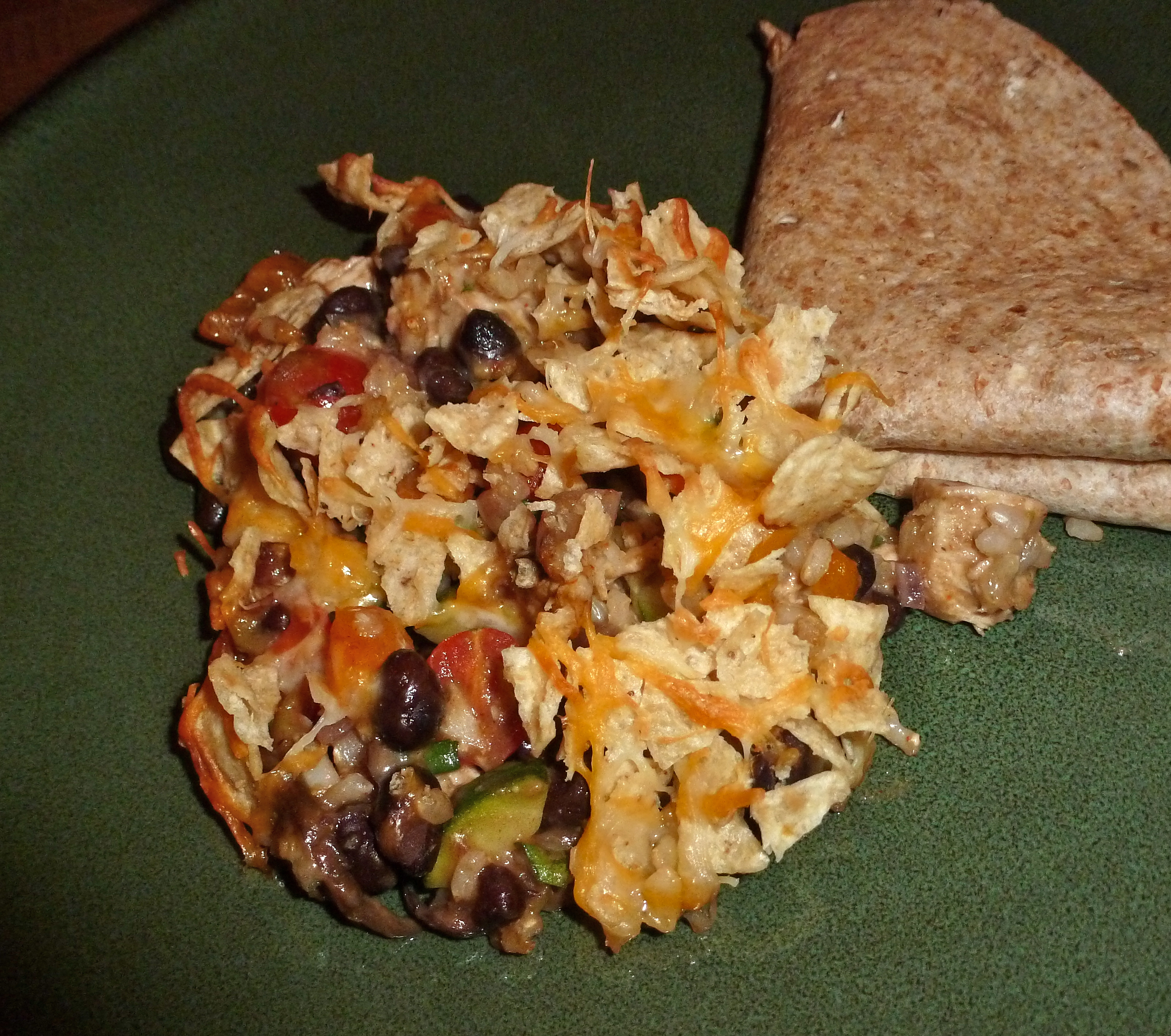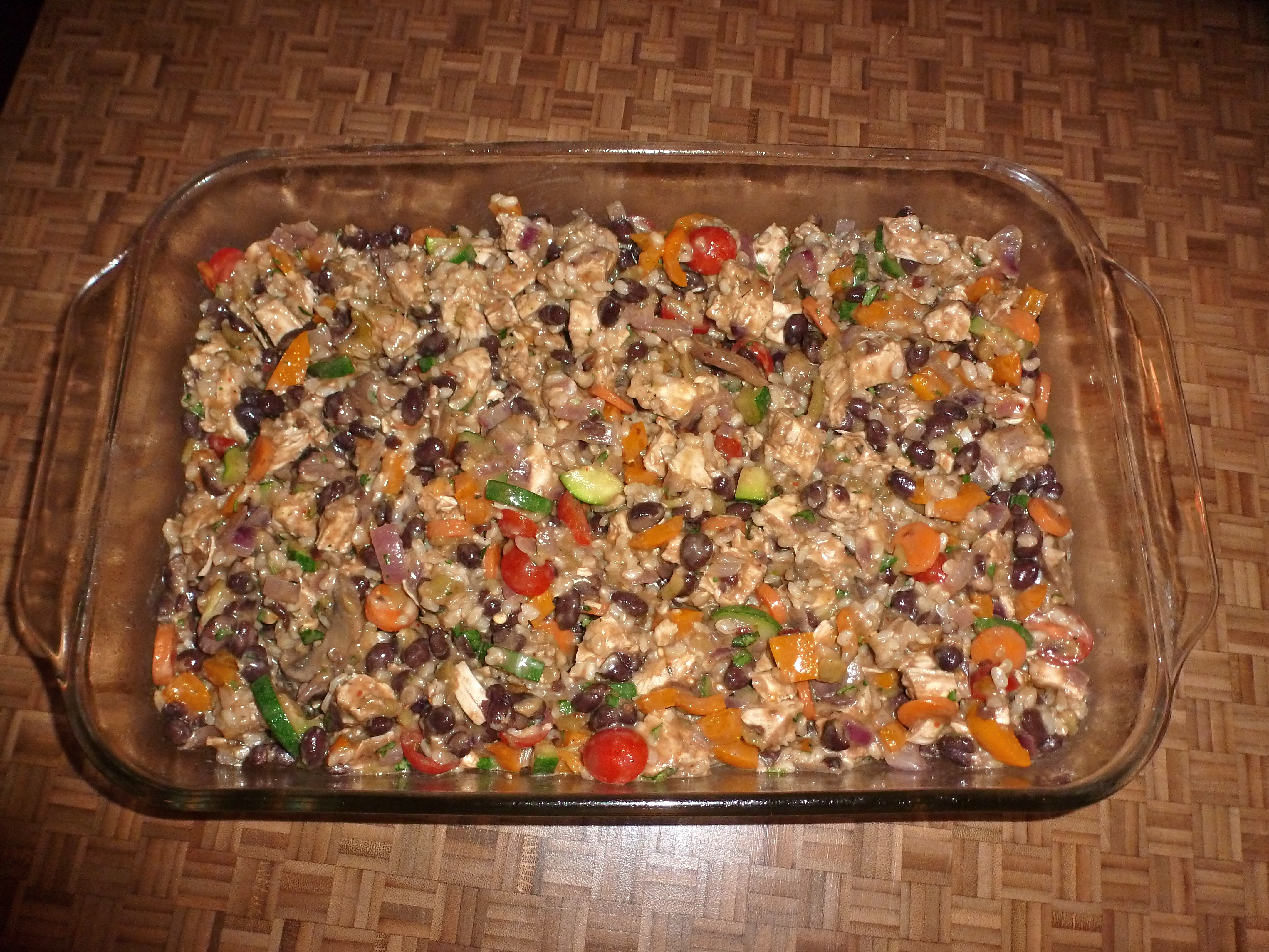 Black beans, diced green chiles, and halved cherry tomatoes waited in a big bowl to be joined by the chicken mixture. I added the brown rice, and stirred in some shredded cheese, too. It’s a casserole, after all.