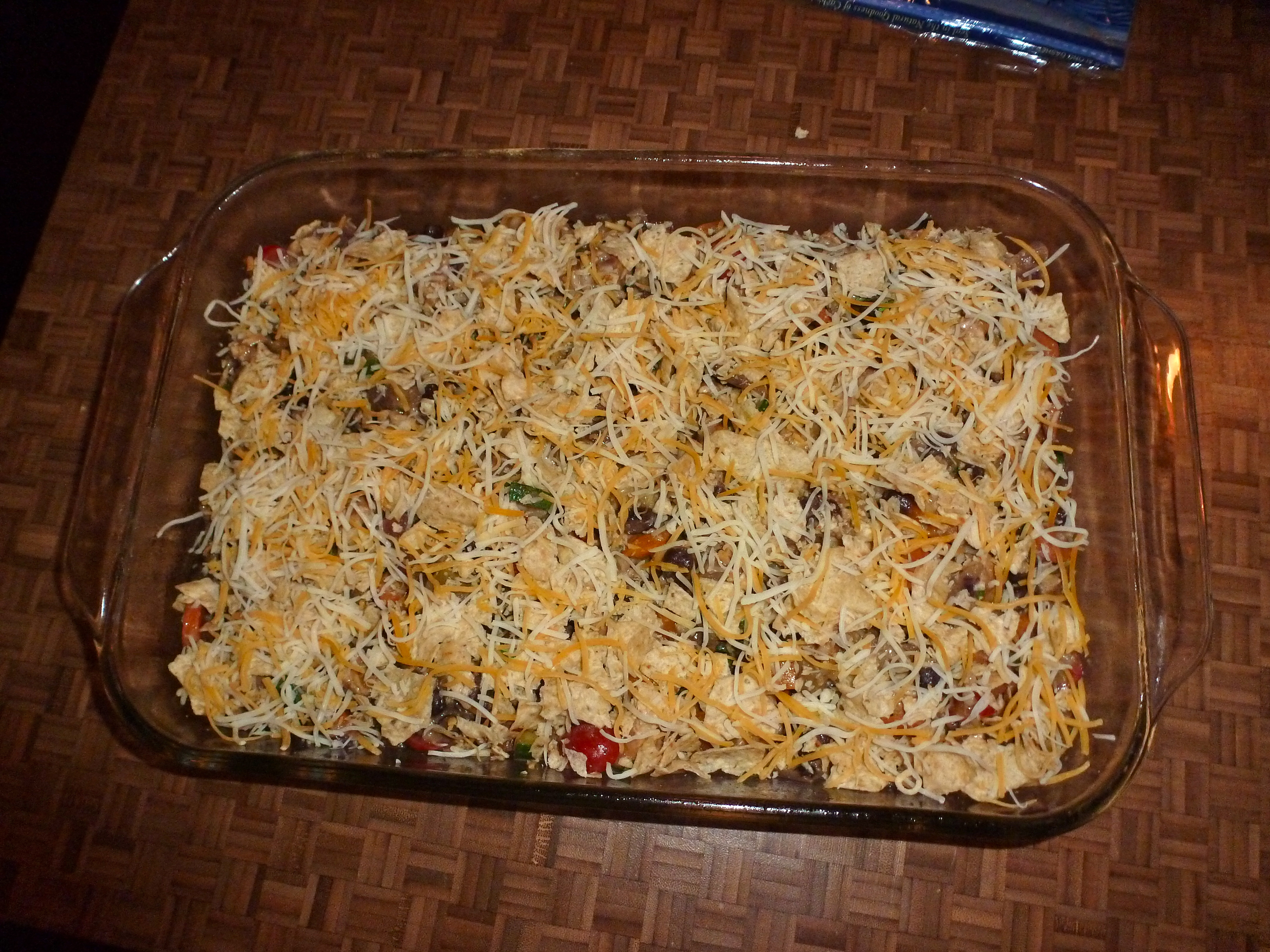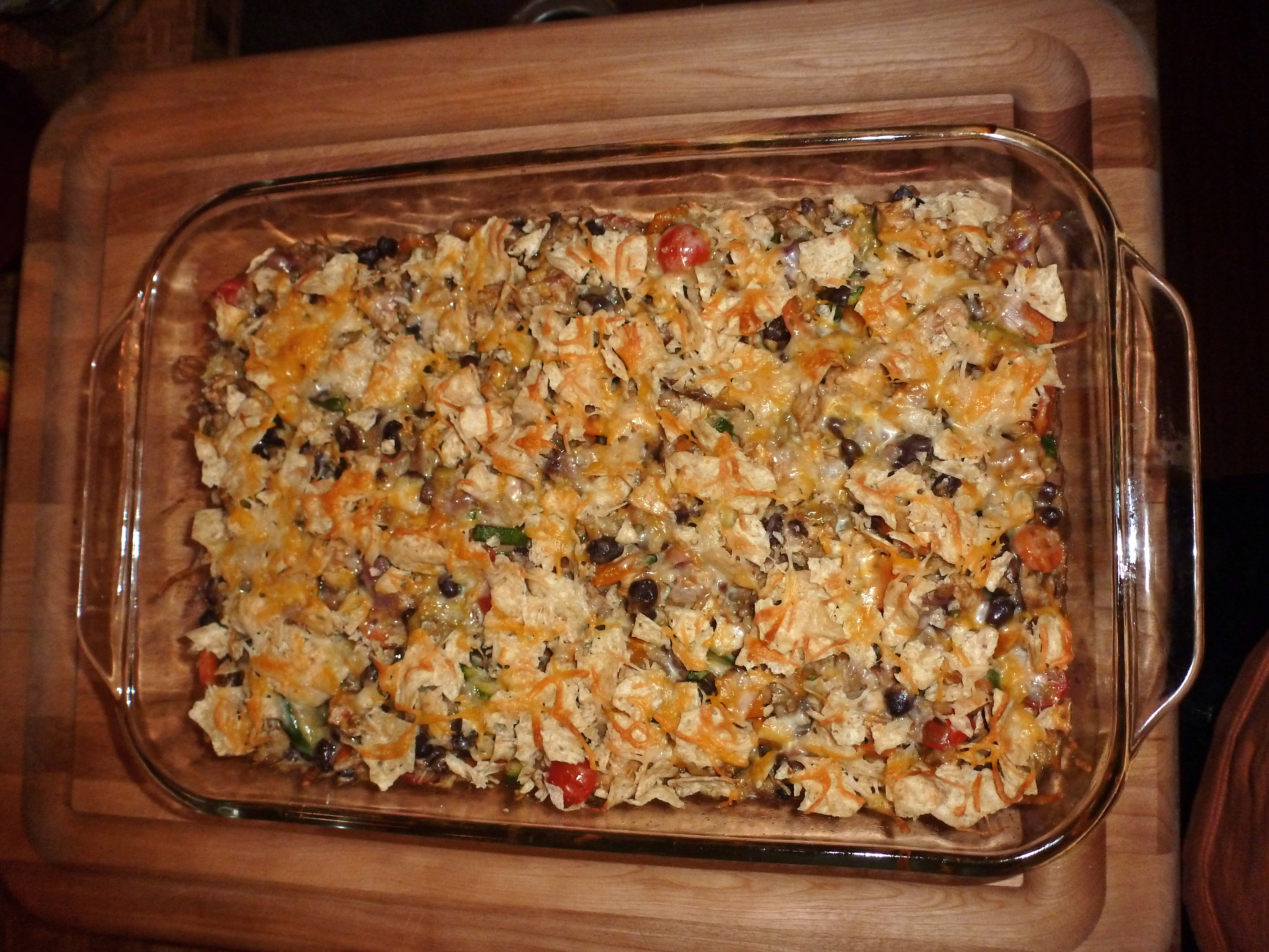 This deliciousness went into a glass pan, and I topped it with some crushed tortilla chips for CRUNCH and a sprinkling of cheese on top. It baked for maybe 25 minutes, until the cheese was melted and getting a teensy bit brown (yum).