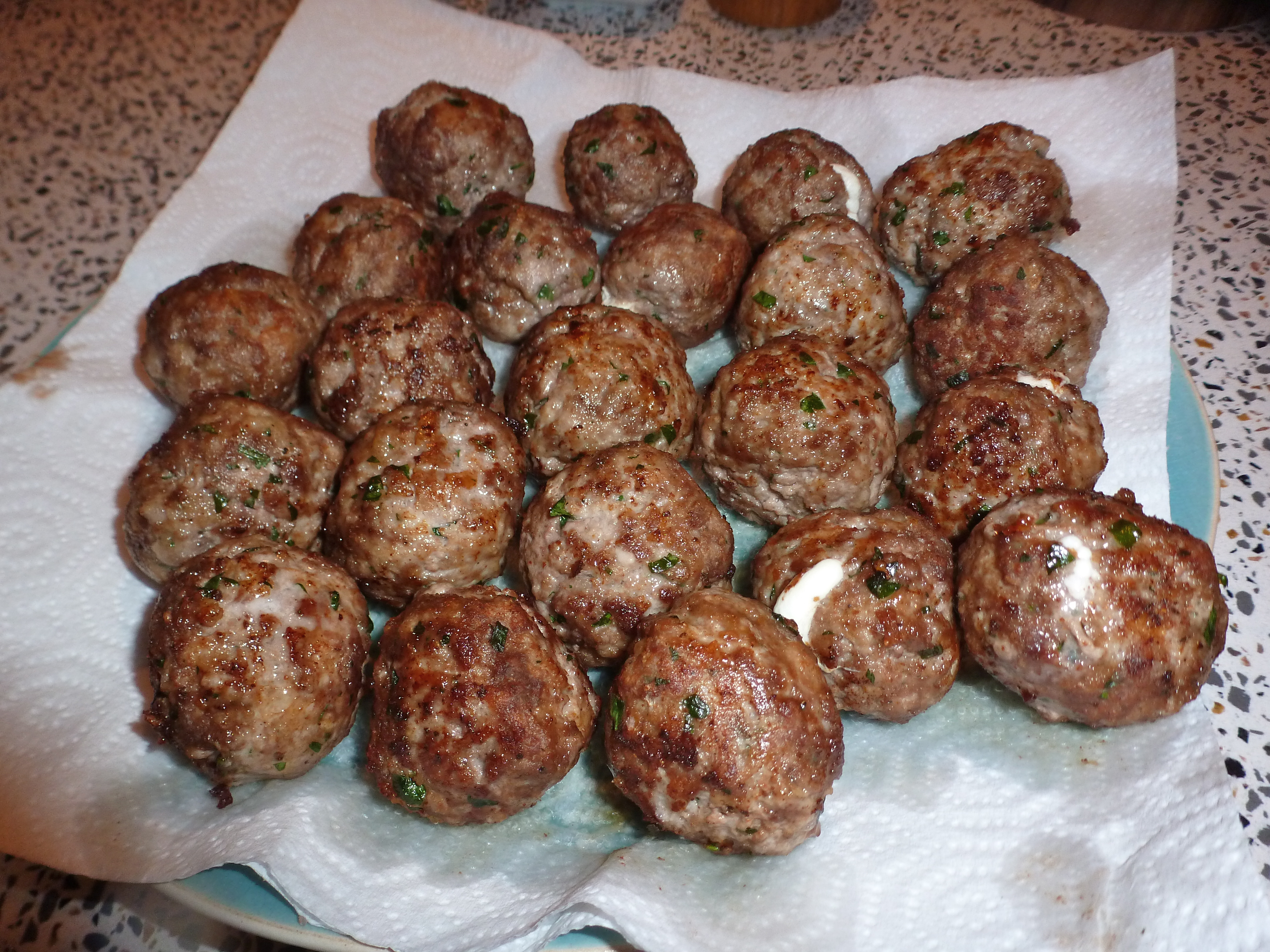 See that meatball to the far right, with sneaky mozzarella cheese already dripping out? That’s what happens when you don’t seal the little mozz square in there well enough. It’s not a biggie- it just fries up in the oil. Bonus.