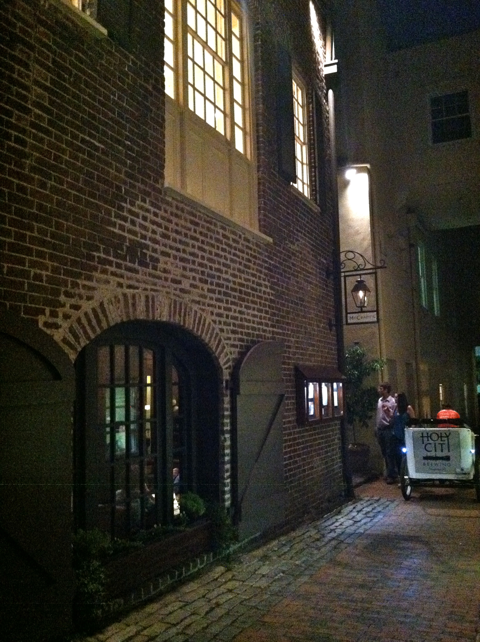 For dinner, at Ali’s urging, we took a rickshaw (pedi-cab) to McCrady’s Restaurant. The ride to the restaurant was awesome, through side streets of Charleston in the cool evening air. We had a cocktail at the bar before dinner, taking in the scene. Only one word can describe it: classic. It was dark, gorgeous, and they served cocktails from another era.
