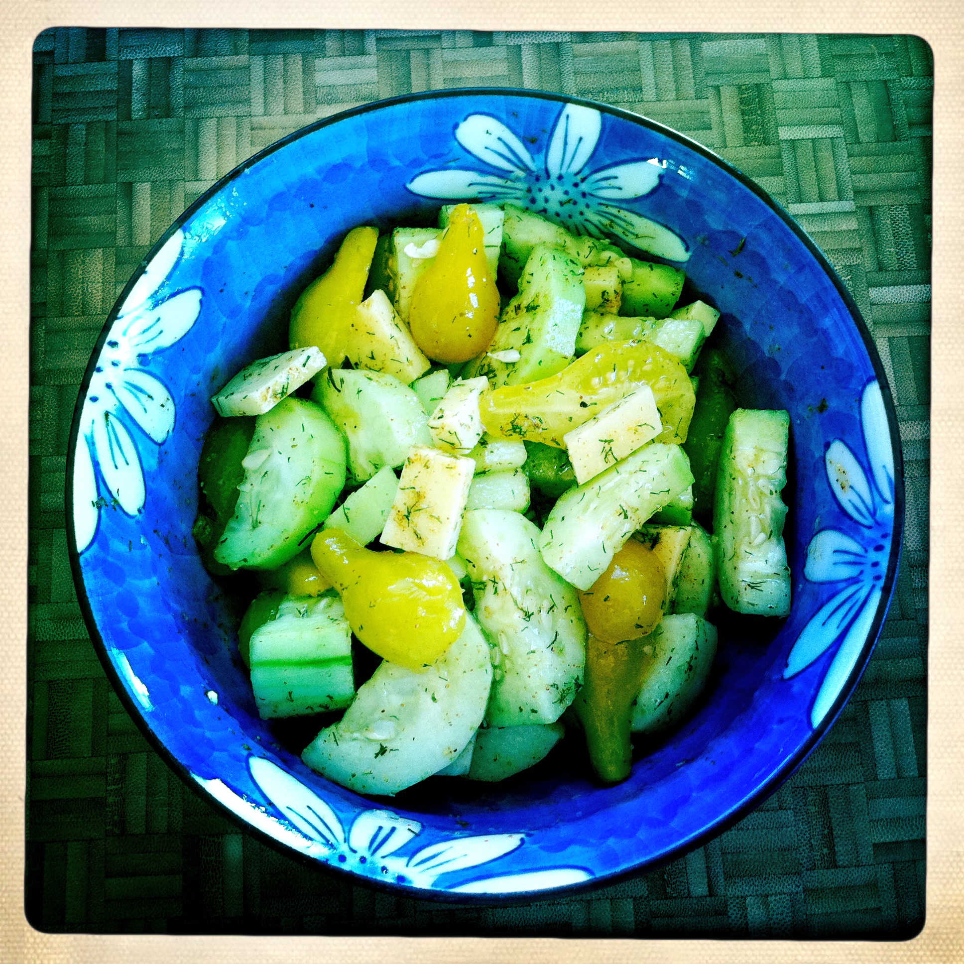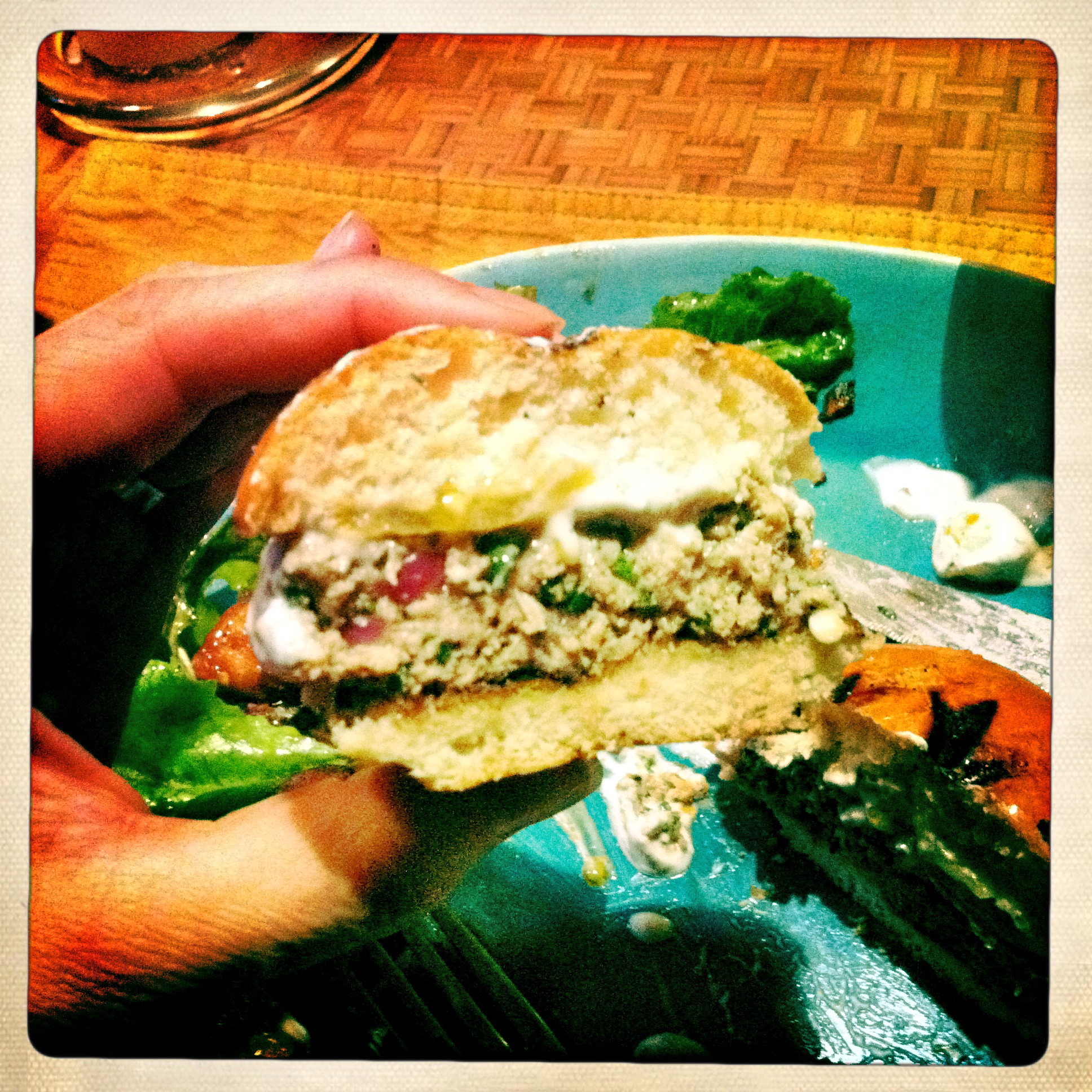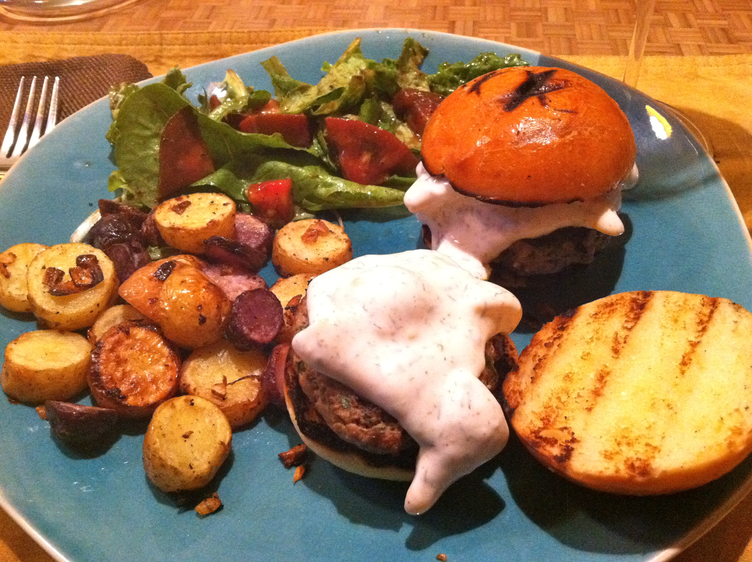“For the mini-burgers, John combined ground lamb, chopped fresh mint, chopped fresh cilantro, chopped garlic, dried oregano, Worcestershire sauce, an egg, some breadcrumbs, salt and pepper, and LOVE. (His words.) For the sauce, I mixed together plain Greek yogurt, dried dill, garlic salt, pepper, quartered cherry tomatoes, and lemon juice. You’ll have to wing it on the amounts, because that’s what we did. But the result was delectable.”