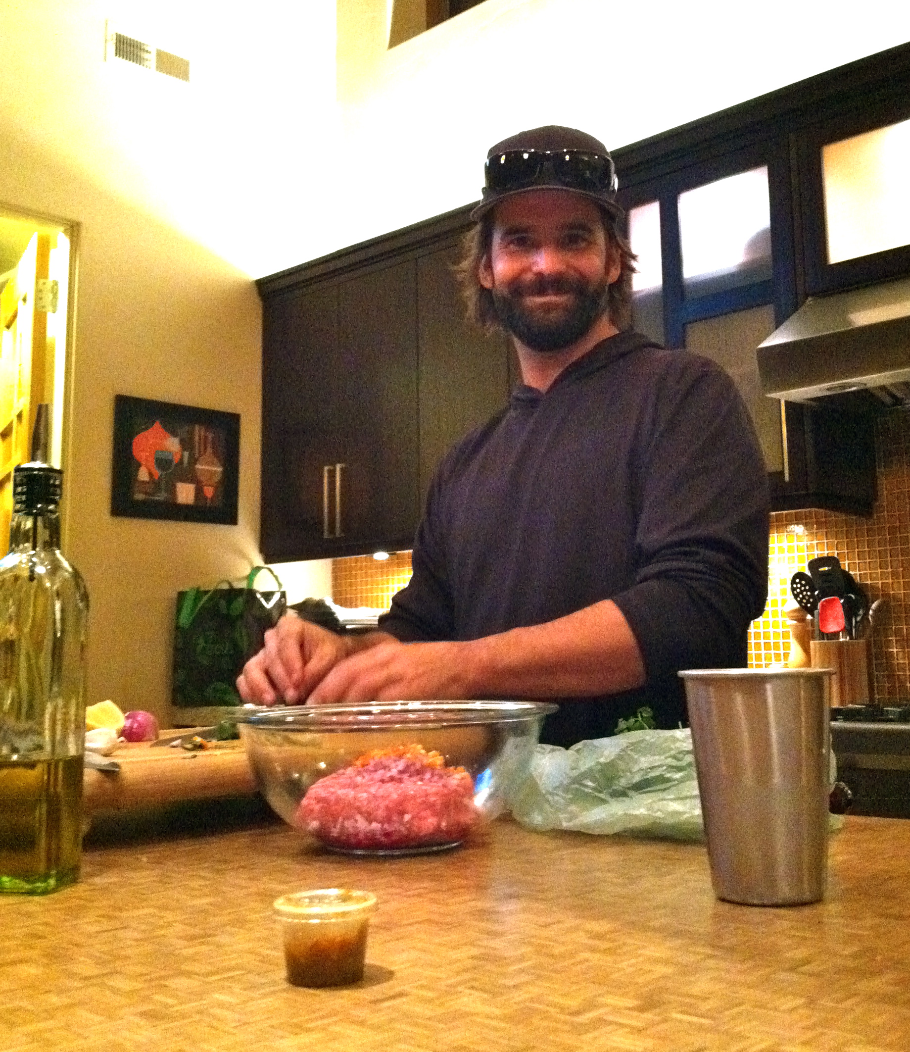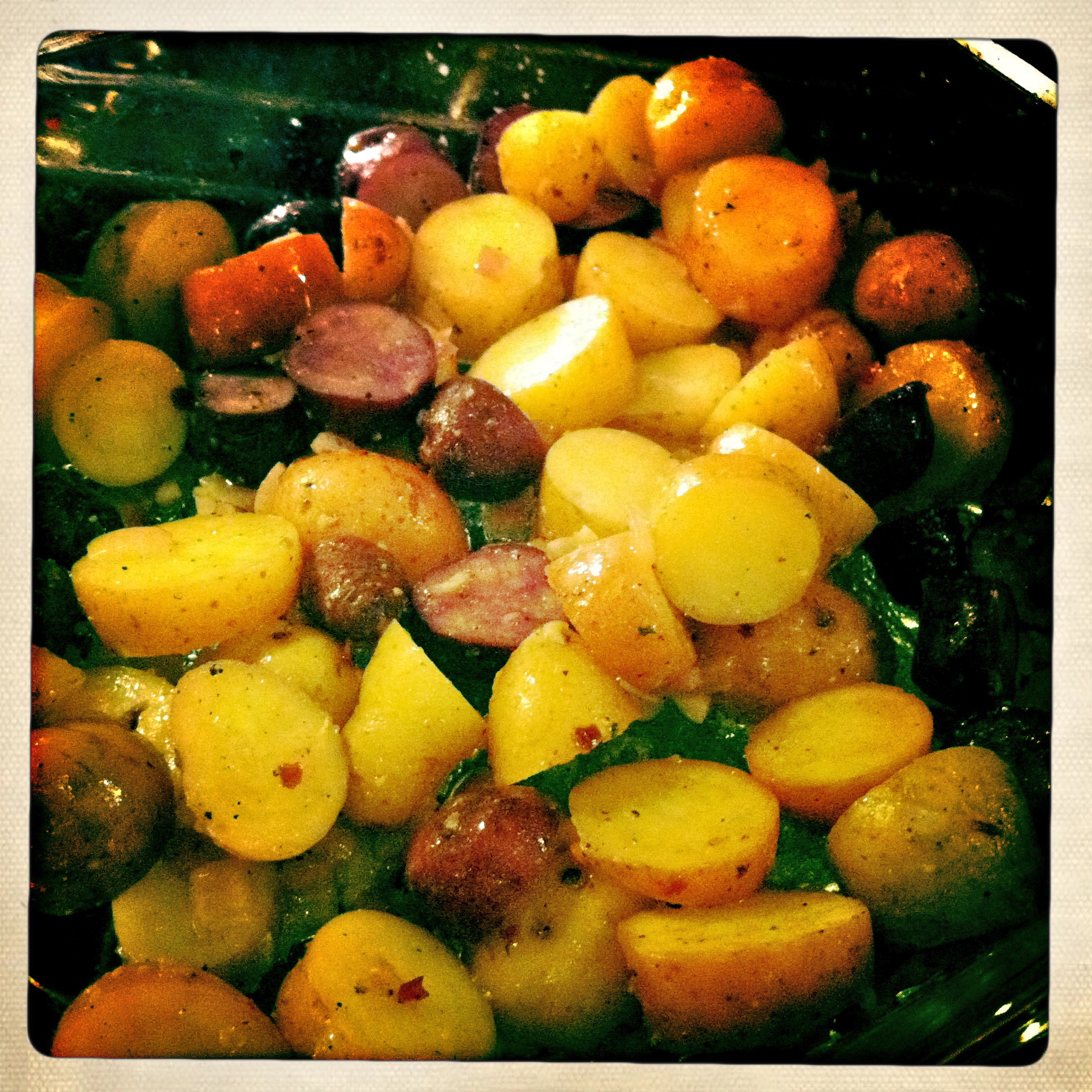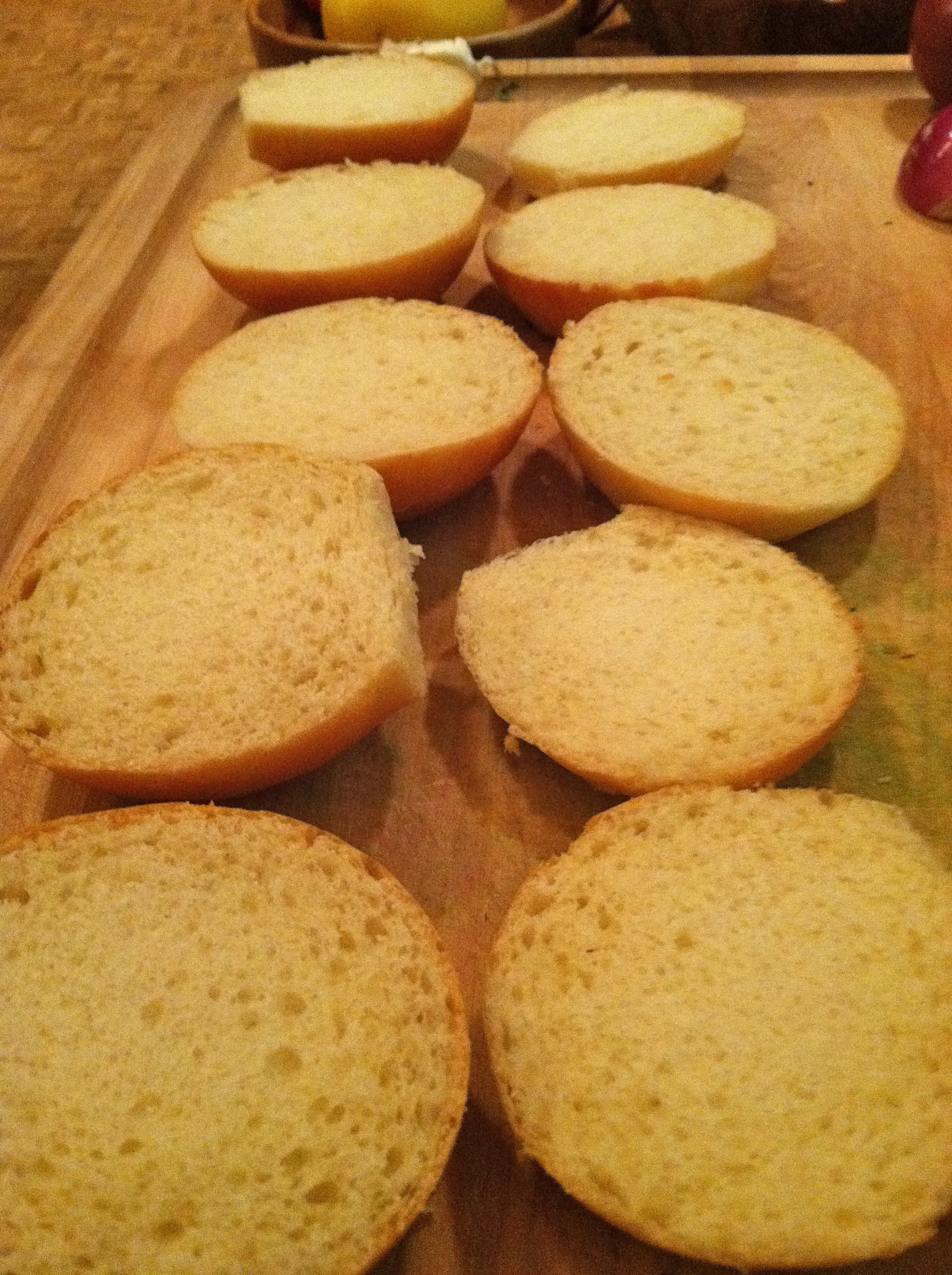 I think John added some chopped jalapeno into this batch, but the rest was basically the same. We found the challah slider buns at Whole Foods and popped some fingerling potatoes in the oven with chopped garlic and onion, too. The house started to smell scrumptious!