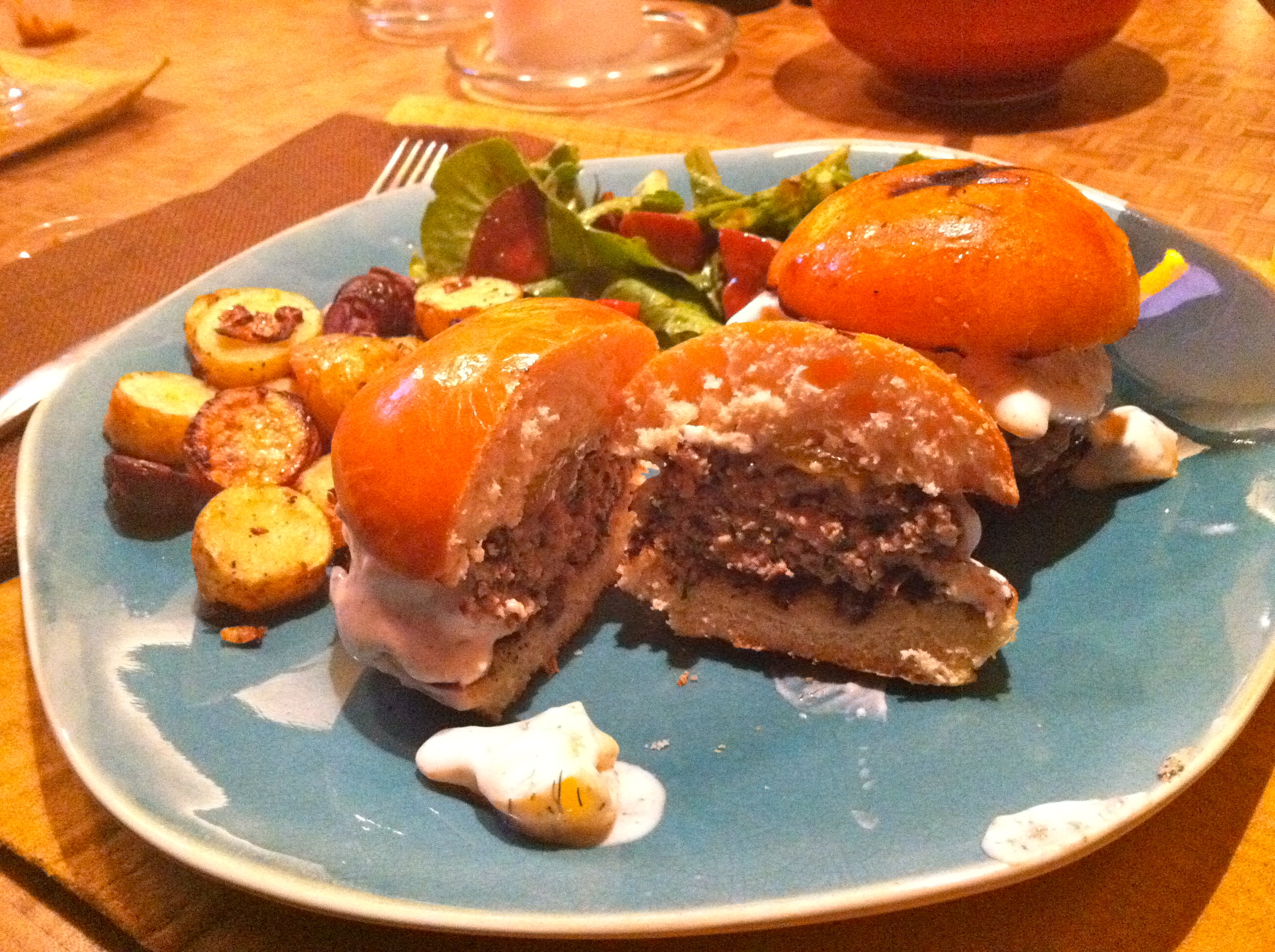 As we happily munched on our mini-burgers, John and I realized that with the exception of the buns, everything on our plates came from within 30 miles or so- the lamb, potatoes, onion, garlic, tomatoes, greens, herbs. I LOVE THAT.