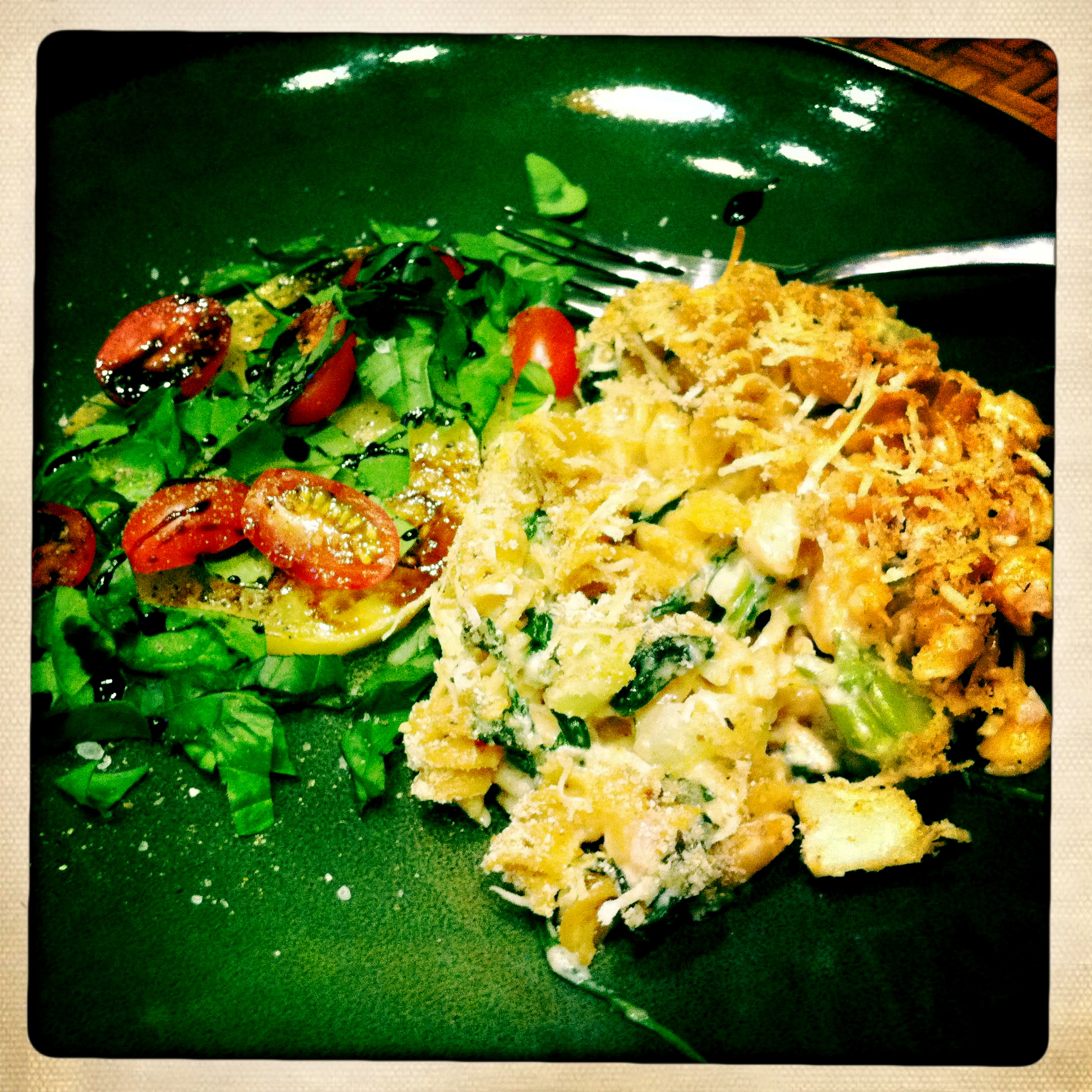 The result was tasty- very tasty. But I’m not sure I would call it a macaroni and cheese. To me, it felt more like a veggie casserole with a light cheesy sauce. I loved the addition of the veggies, and could see adding others- sundried tomatoes, maybe squash. The crunch of the toasty breadcrumbs was a must. We enjoyed it with a salad of heirloom and cherry tomatoes, shredded basil and chopped spinach.