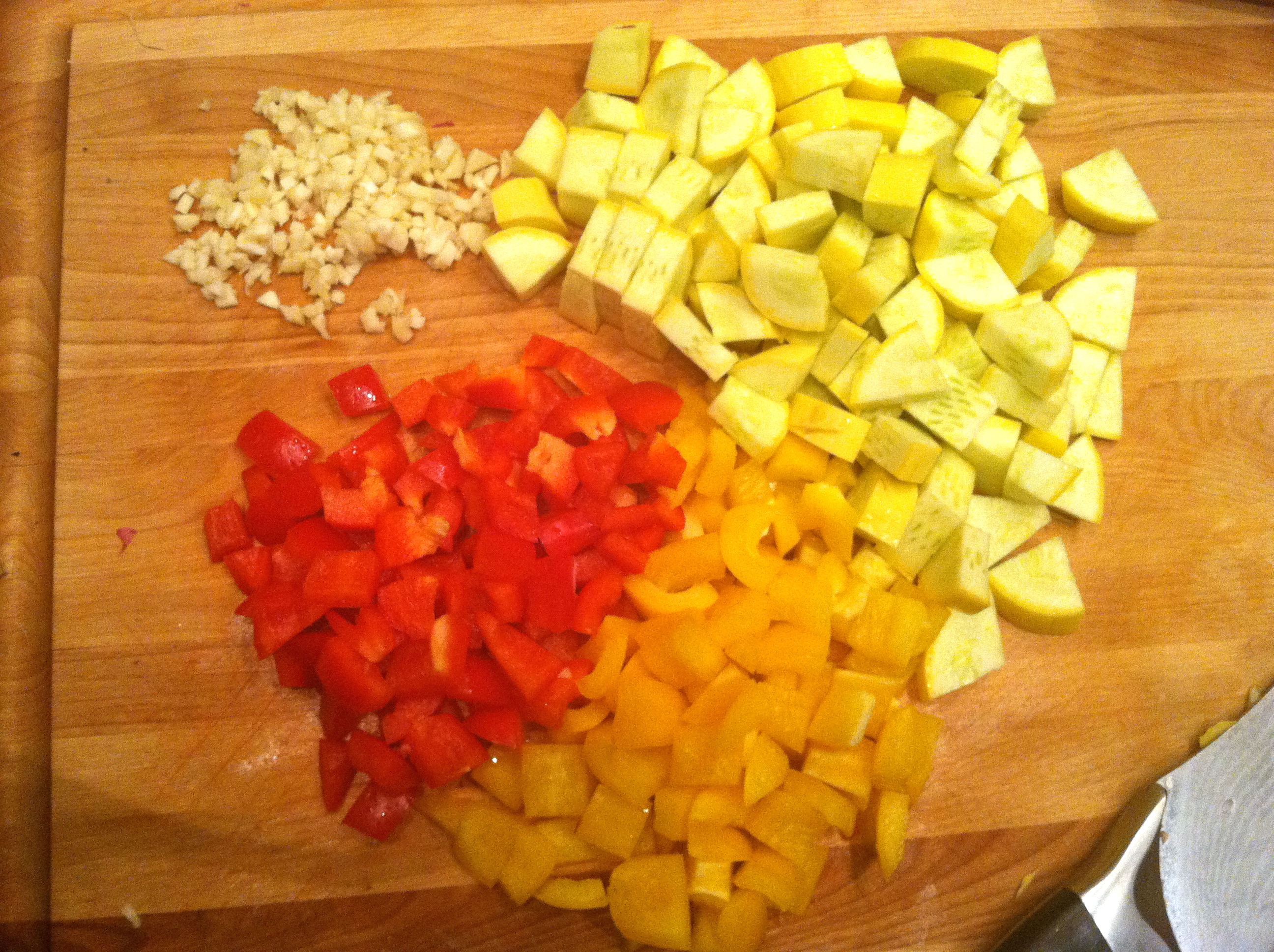 While the bacon sizzled away in a large stock pot, I chopped up lots of veggies- onion, red bell pepper, yellow squash, and potatoes. I got some garlic and jalapeno ready for action, too.