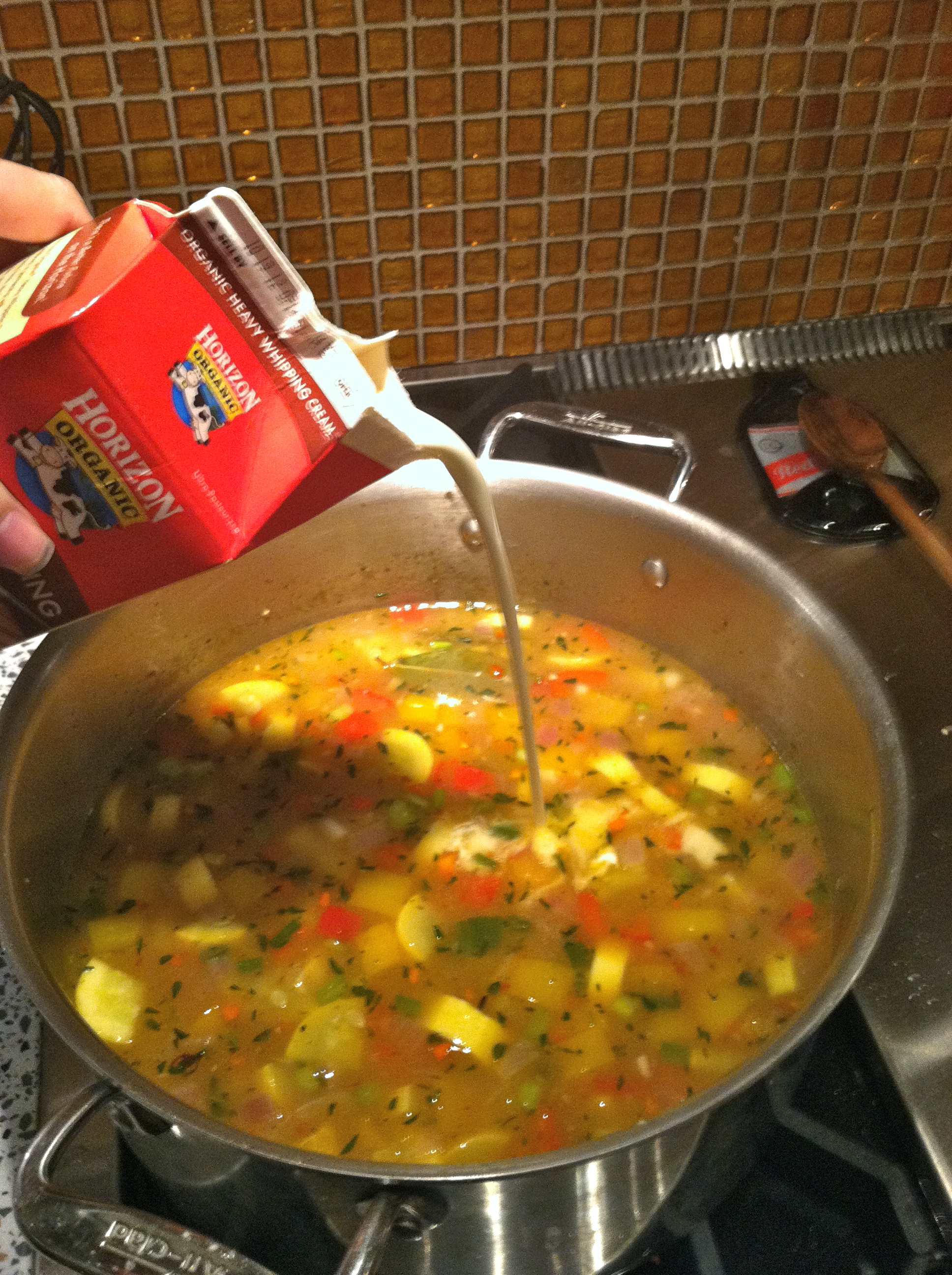 While the soup simmered on the stove, I chopped up the bacon and also some chicken (from a rotisserie bird). After the potatoes are done, it’s time to start adding the rest of the ingredients: a can of creamed corn, some frozen corn kernels, a cup of heavy cream, the jalapeno, the chicken and bacon, and some chopped green onions.
