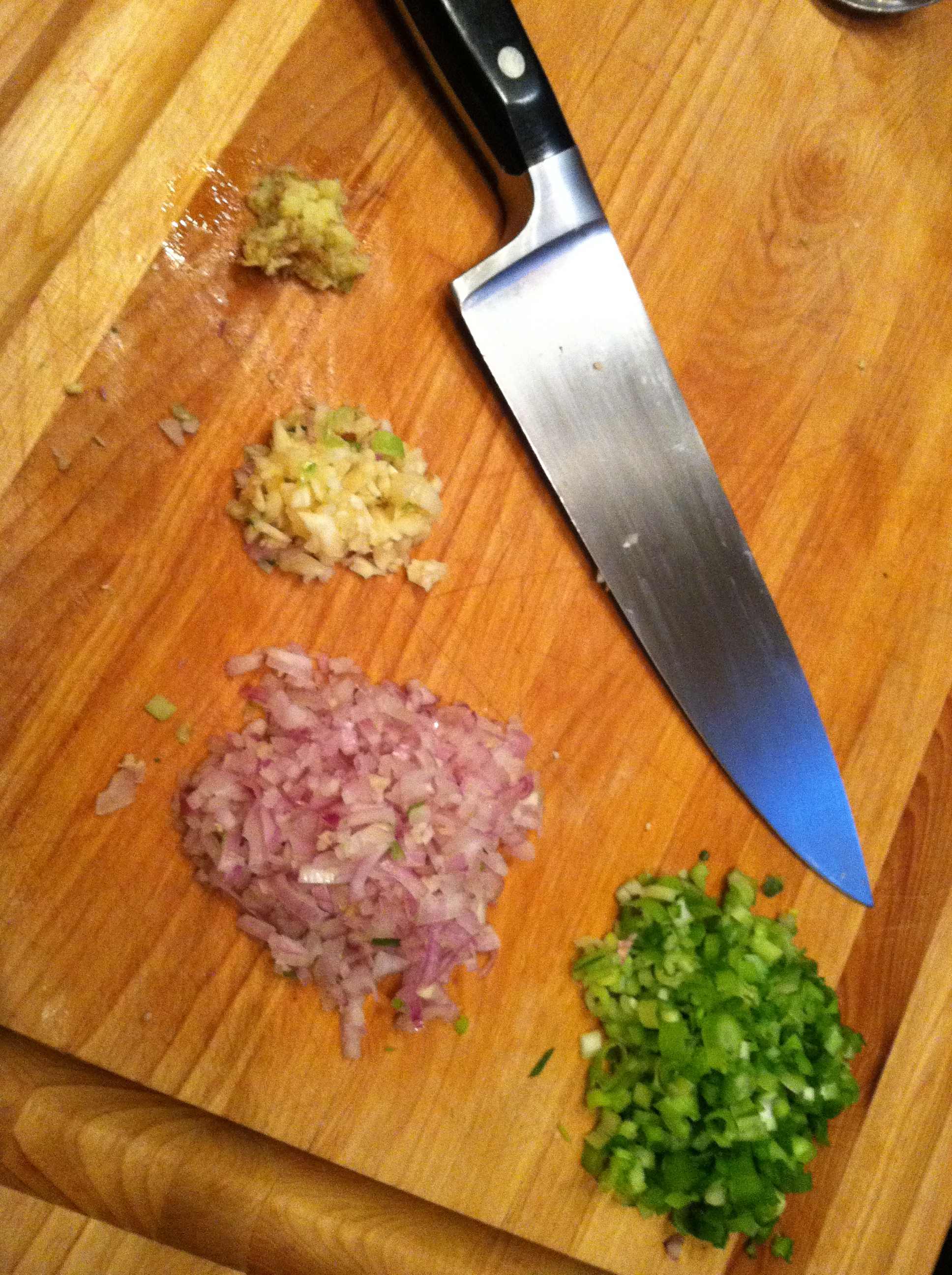 Minimal prep time included chopping up a shallot, some scallions, fresh ginger, and garlic. A can of pre-chopped water chestnuts made life even easier. Next, I brought out the condiments. I happen to keep a lot of Asian sauces on hand.