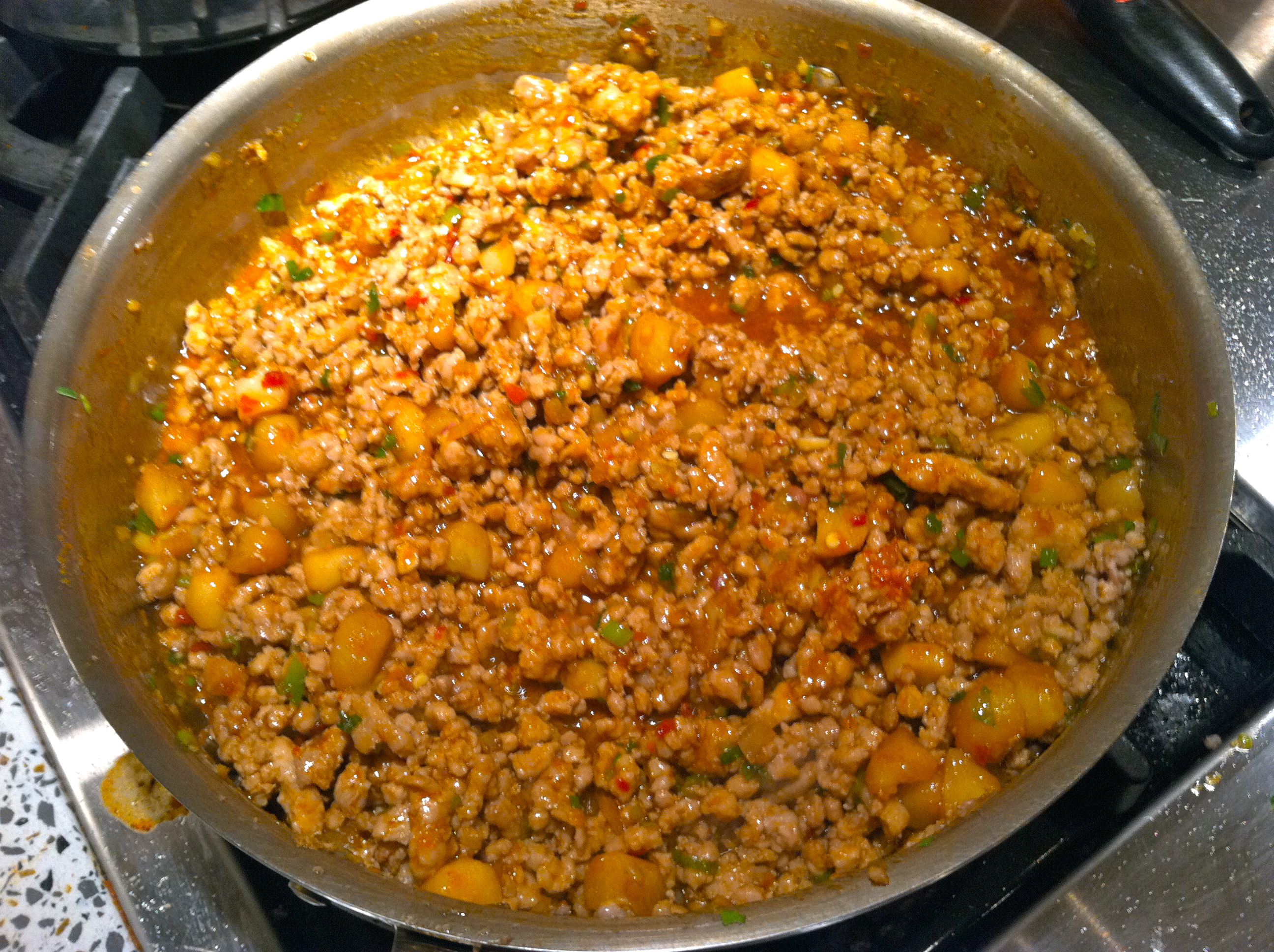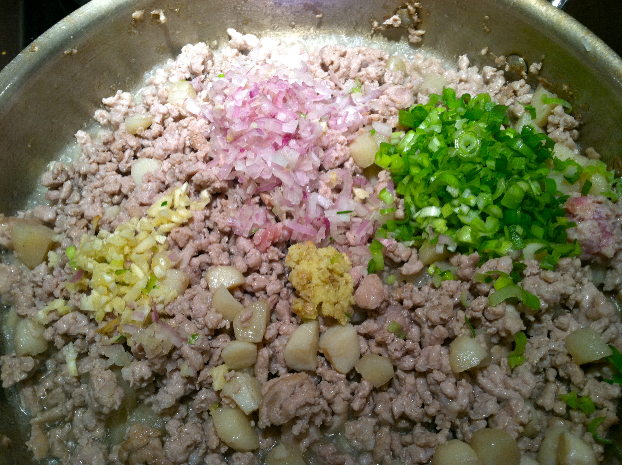 This all happened much more quickly than I expected- which was awesome, because I was starving! I browned the ground pork for awhile, added in the water chestnuts, and then the garlic, shallot, scallions, and ginger. The kitchen smelled delicious.