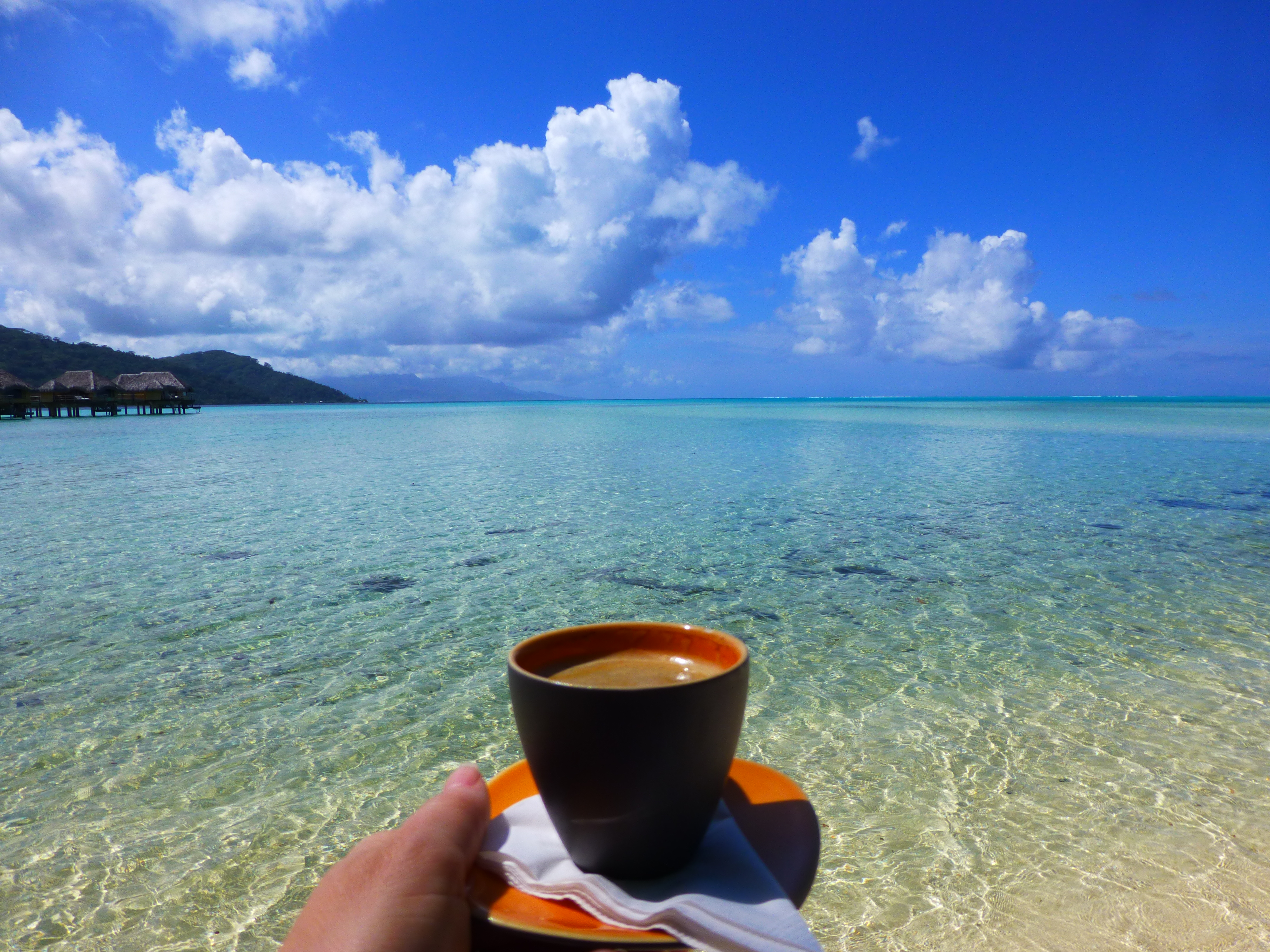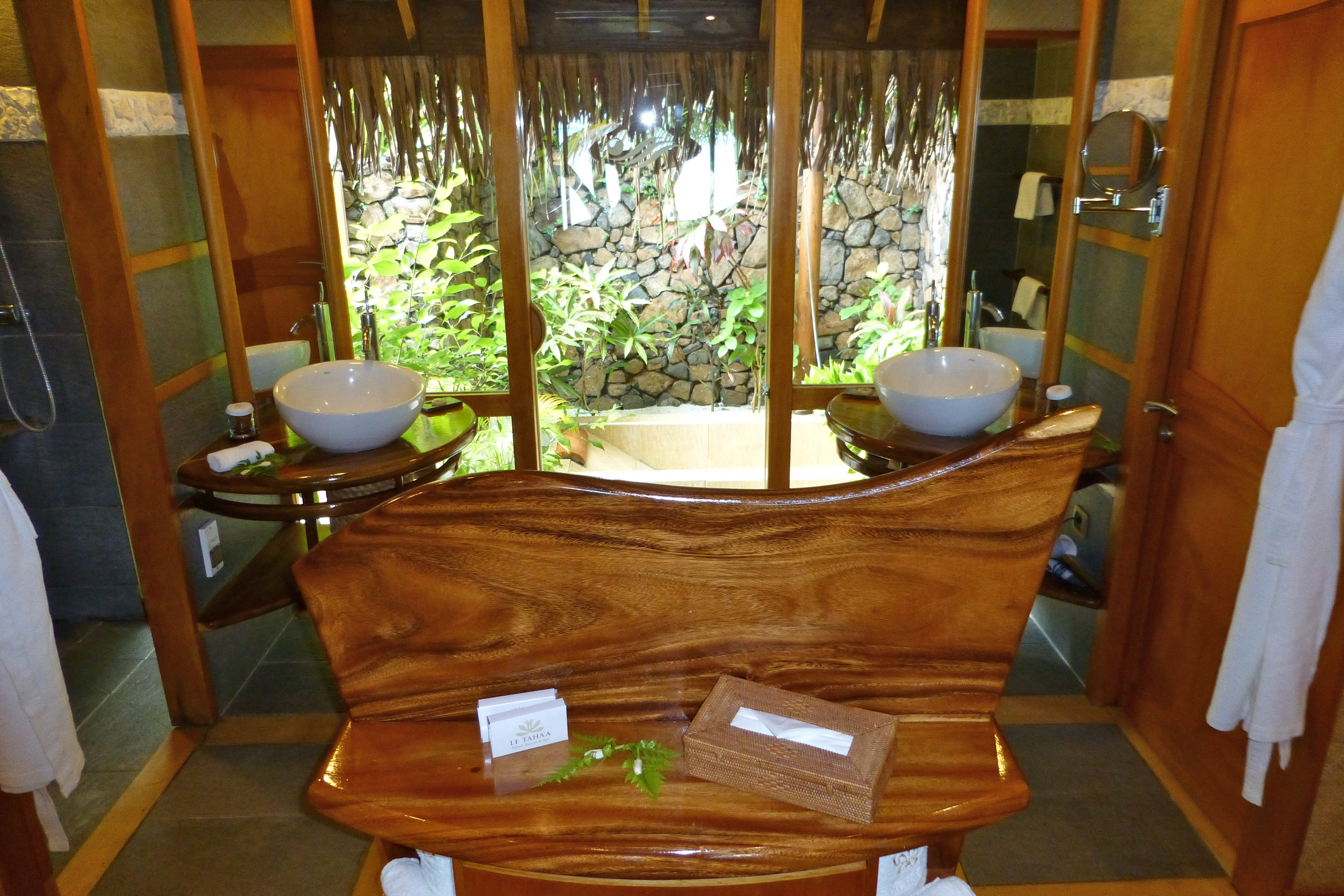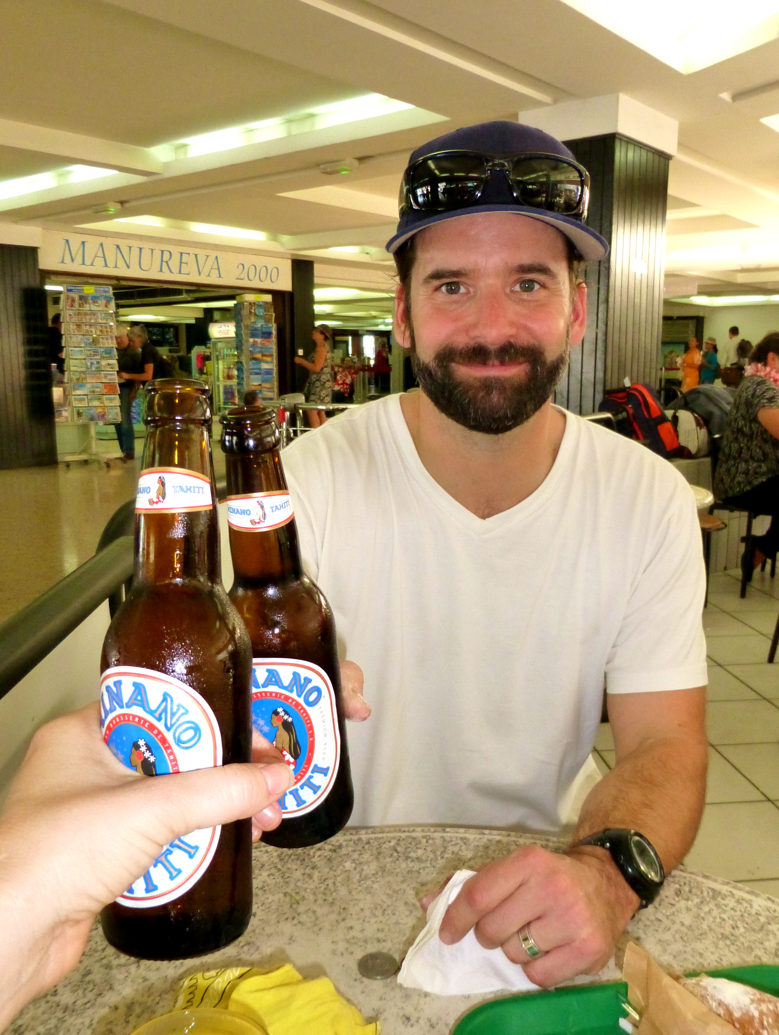 But by the time we landed in Tahiti, we’d forgotten all about the drama at the beginning of the trip. Our fantastic experience on the 8-hour overnight flight from LA had us floating on a champagne and fois gras cloud! I am still in awe of the food served in Air France’s first class section, and how nicely we were treated. They gave us each a little travel bag that contained socks, an eye mask for sleeping, a toothbrush with toothpaste, wrinkle-reducing face lotion, and freshening wipes. I clutched mine like Gollum with The Ring.