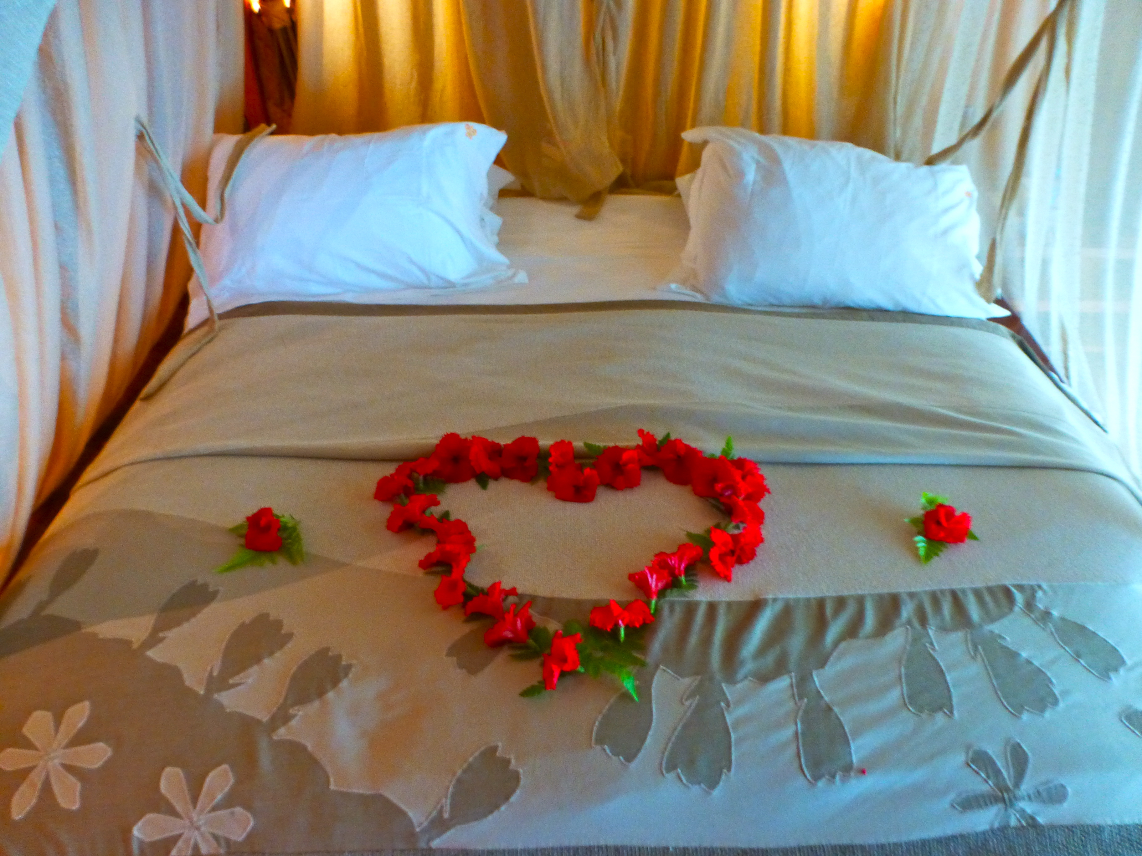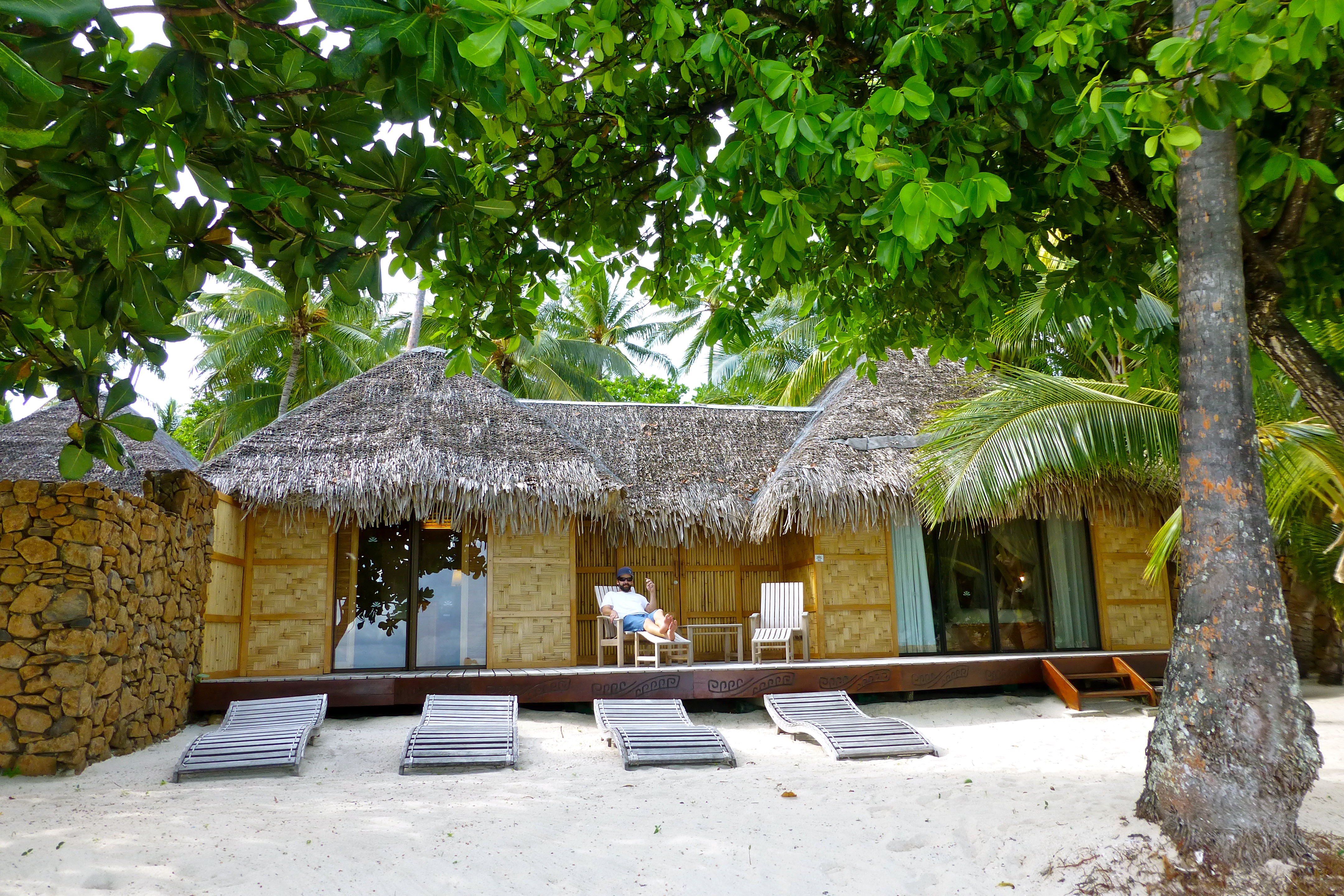I’d been stalking the website for the last couple of weeks, but I was unprepared for the fabulousness. Clear, teal blue water, the thatched-roofed overwater huts, and flowers- flowers EVERYWHERE. We were greeted with a cool towel and lemon water, and then led to our 2-bedroom beachfront villa. We gasped with each door that opened!