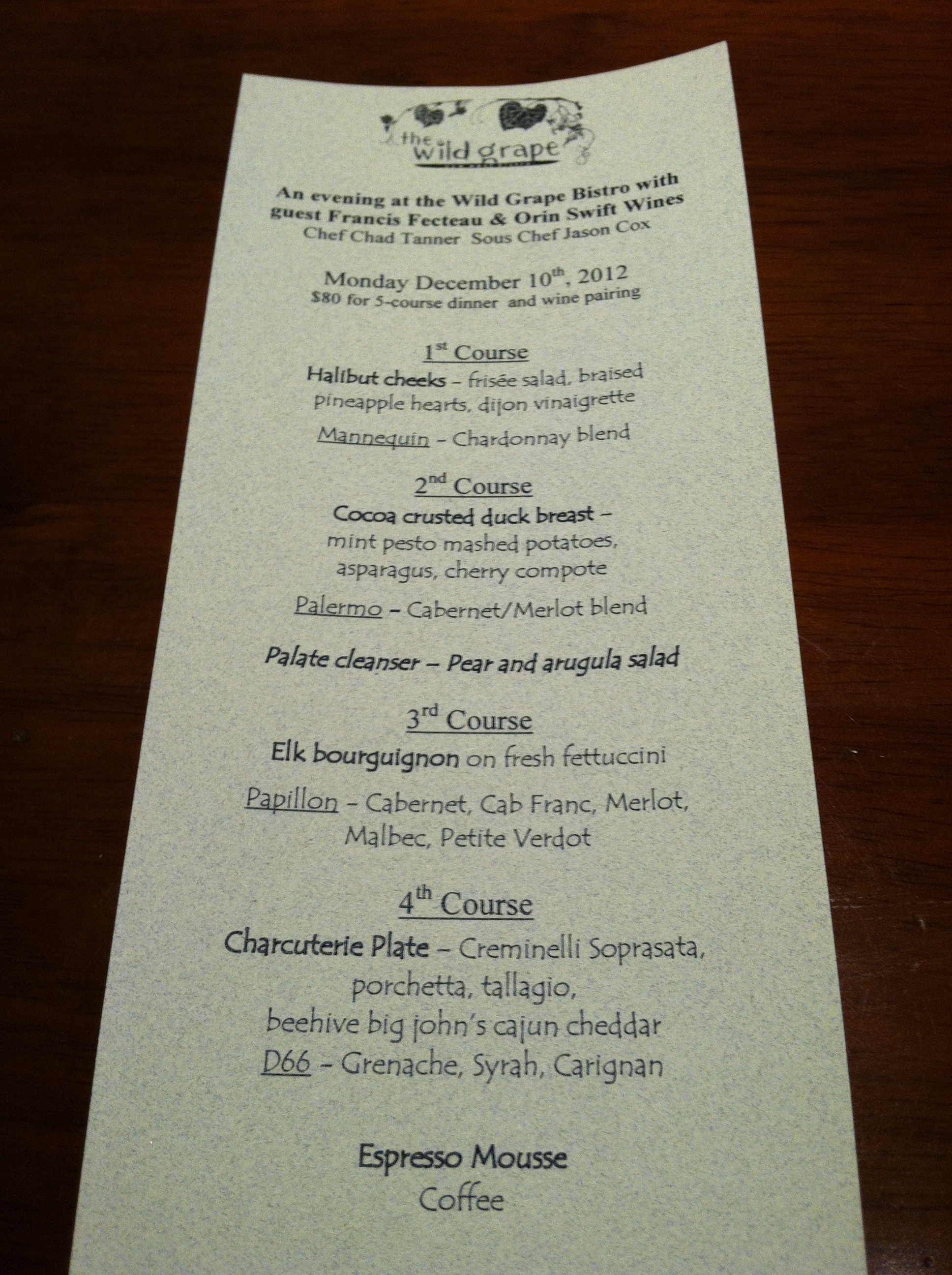 We sipped on a mulled wine cocktail (delish) and read over the menu for the evening. Halibut cheeks, duck, elk bourguignon, charcuterie, chocolate mousse…all paired with some of our favorite wines. This was going to be a GOOD DATE.