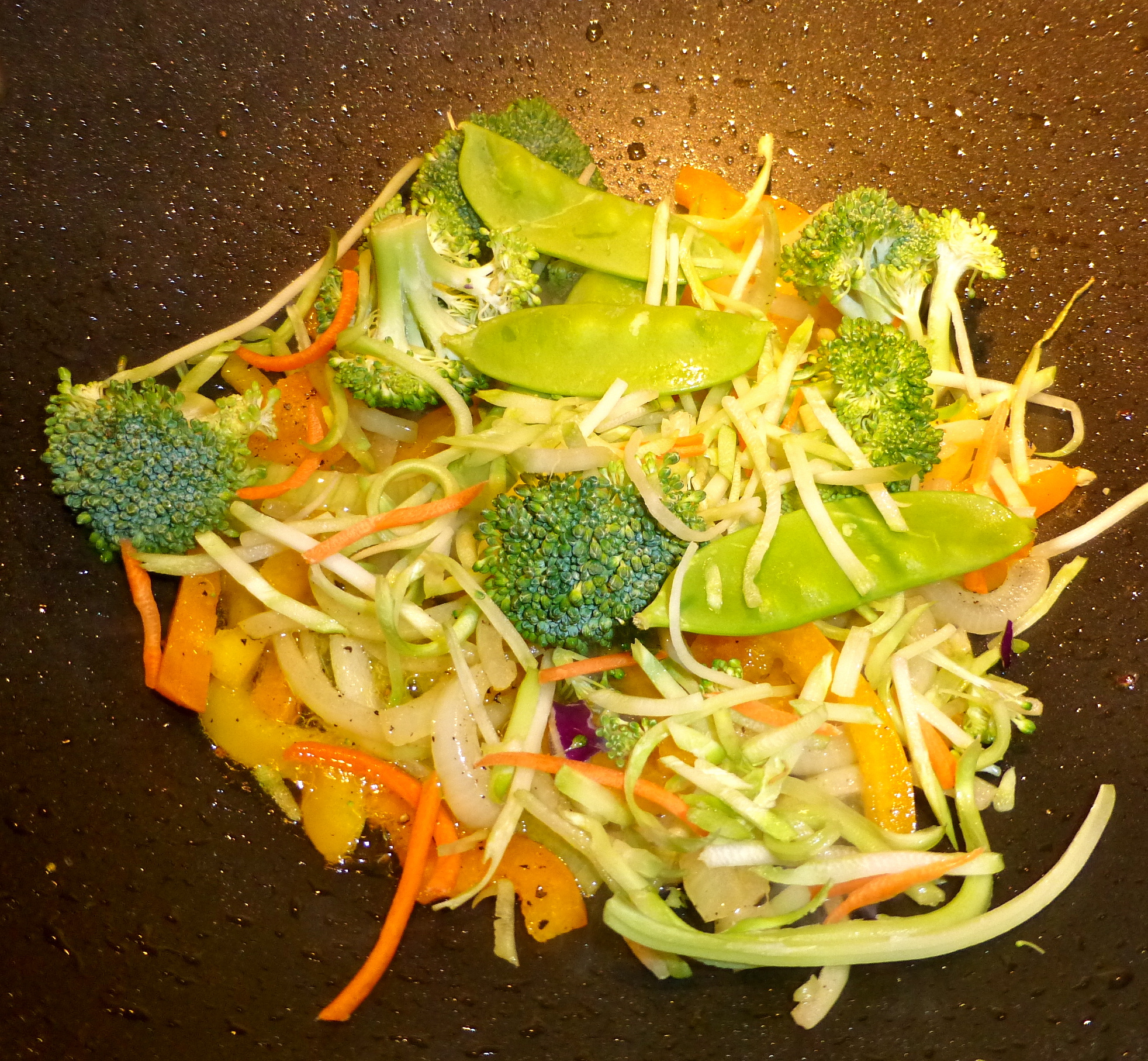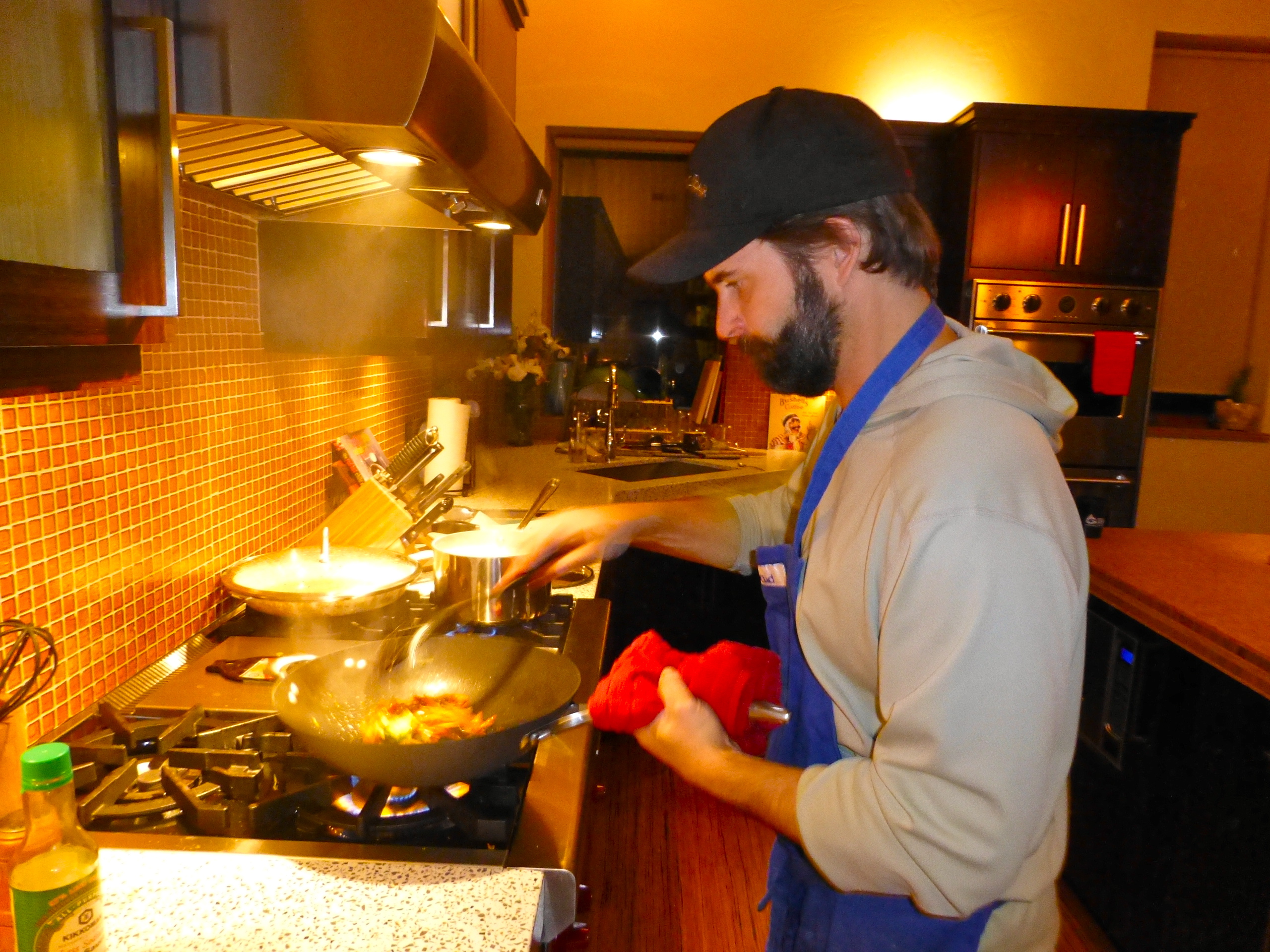 He explained his technique of creating a “flavor pocket” in the center of the veggies, where the chunks of garlic, slices of ginger, sauces, and herbs and spices marinate in the oils. Once the garlic is browning, he does his chef trick of flipping the veggies over and over until everything is coated in the deliciousness.