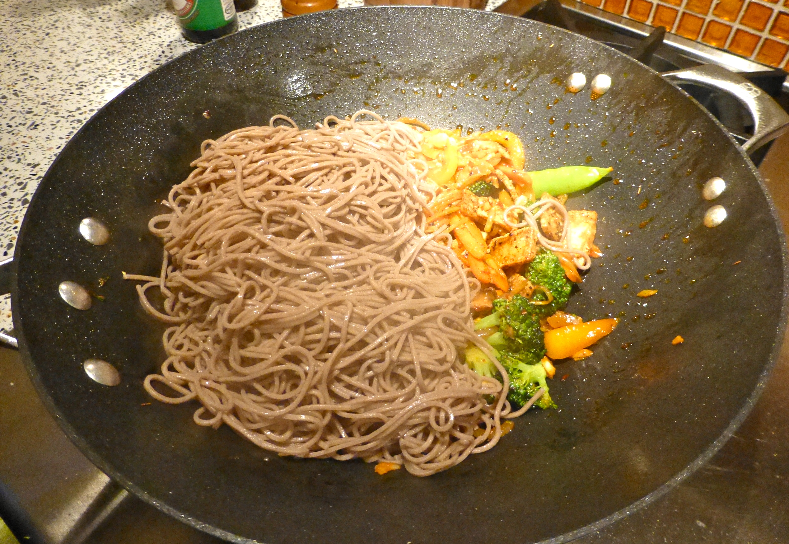 Into the wok go the soba noodles, and the countdown is ON to chow time.
