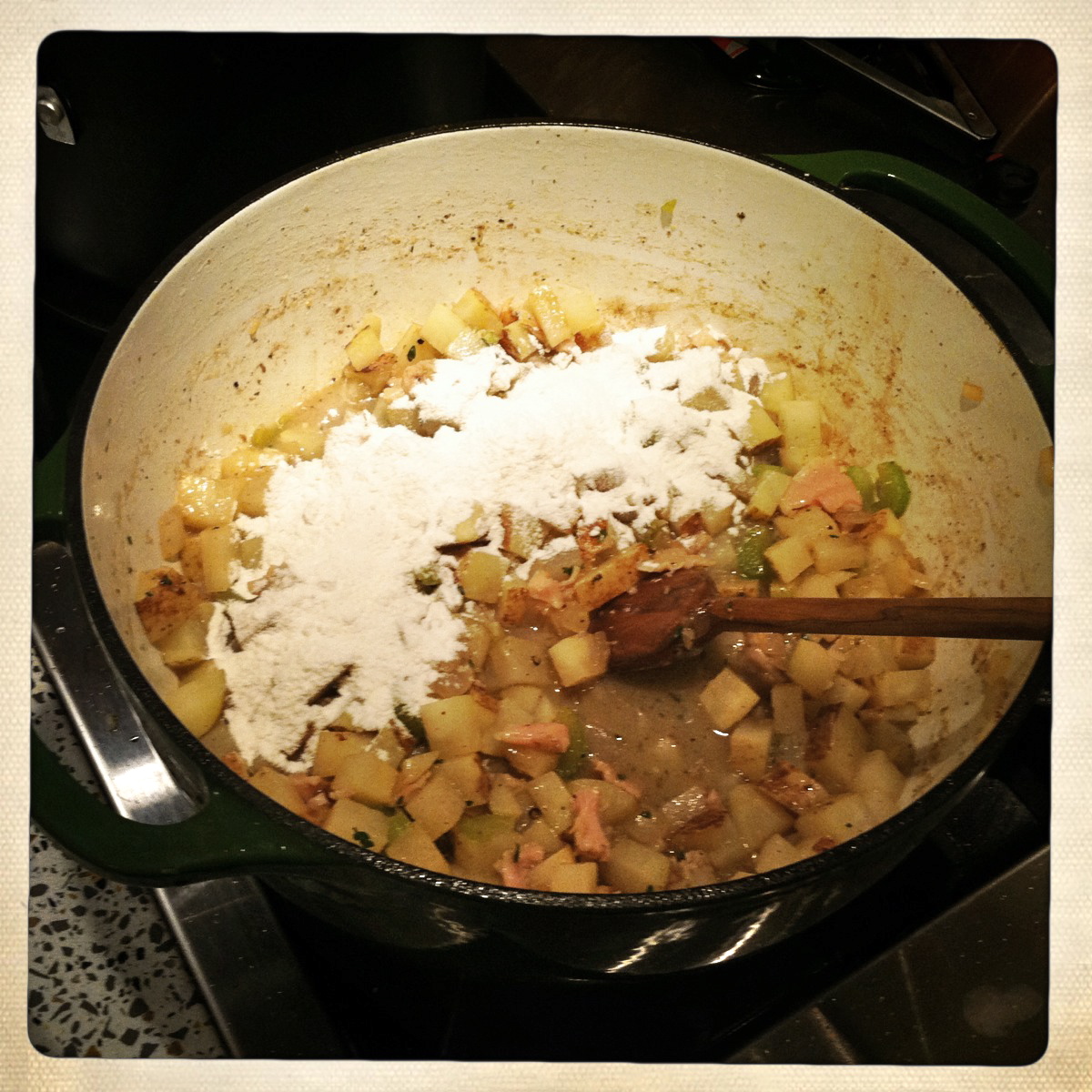 After the potatoes cook “a while” (maybe ten minutes, stirring occasionally), soaking in some of that bacon goodness, add in your clams. Be sure to include the clam juice! I used two cans, but the final product needed more- use three. Add about a cup and a half of water, too, and give it a stir. Now, shake in a handful of flour. It will mix with the starch from the potatoes and help thicken up your chowder. Stir the veggies well for a few minutes, adding more salt and pepper, and let it simmer for 10-15 minutes until the potatoes are totally cooked, stirring every few minutes.
