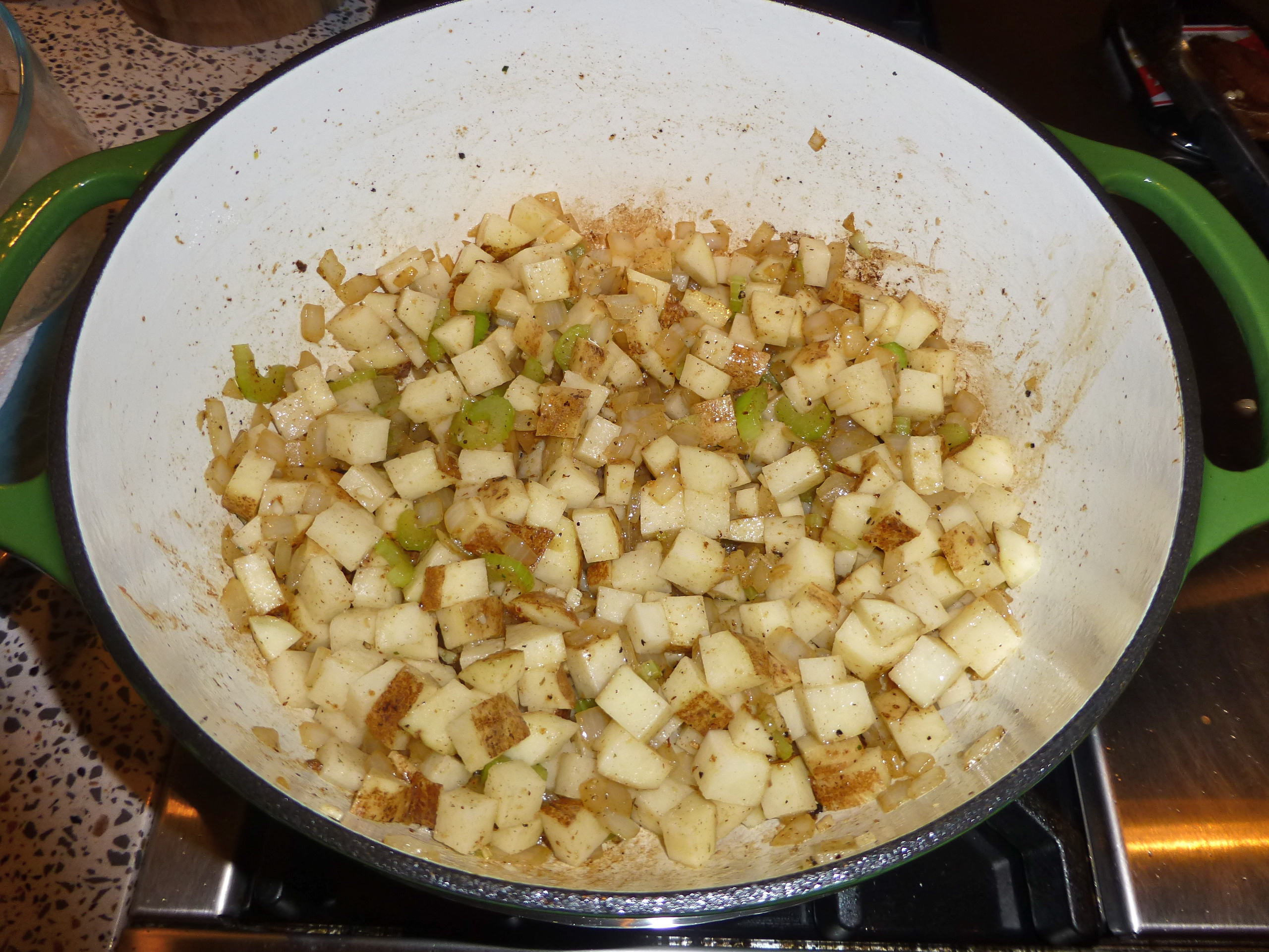 A good chowder needs TATERS. I picked up two large potatoes at the store, but it actually ended up being a bit too much. Two medium-sized ones would be better.  Dice up the potato and remember that the smaller the cube, the faster they will cook! Add the potatoes to the pot and some fresh chopped thyme.