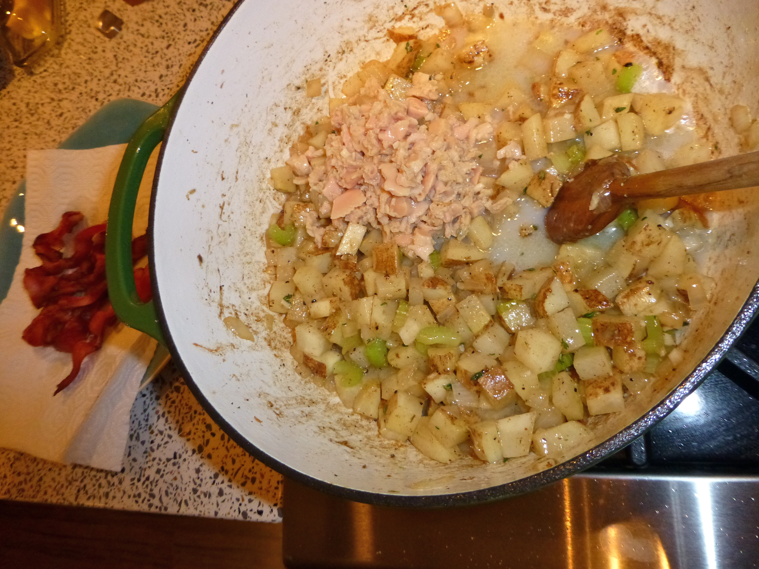 I added a cup of milk and a small can of evaporated milk to the pot. As it simmers, the chowder will get thicker. Toss in some more fresh thyme and your chunks of bacon.