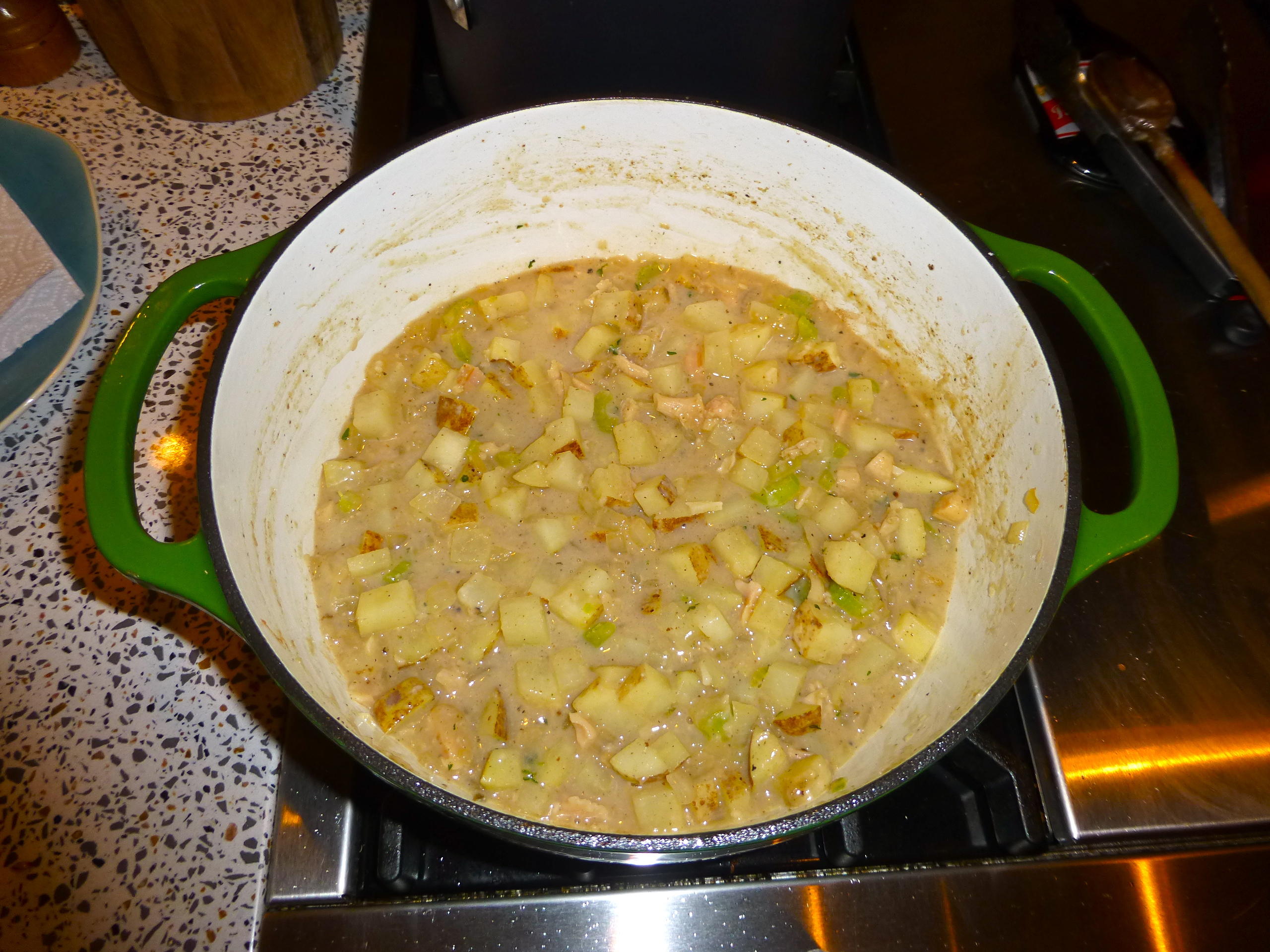 Test the taters for doneness- right in your mouth! The veggies will have cooked down and started to thicken up a bit- that’s what you want. If it doesn’t taste OVER-seasoned at this point, you might want to add more. Because it’s time to add the milks, which will dilute the flavor a bit.