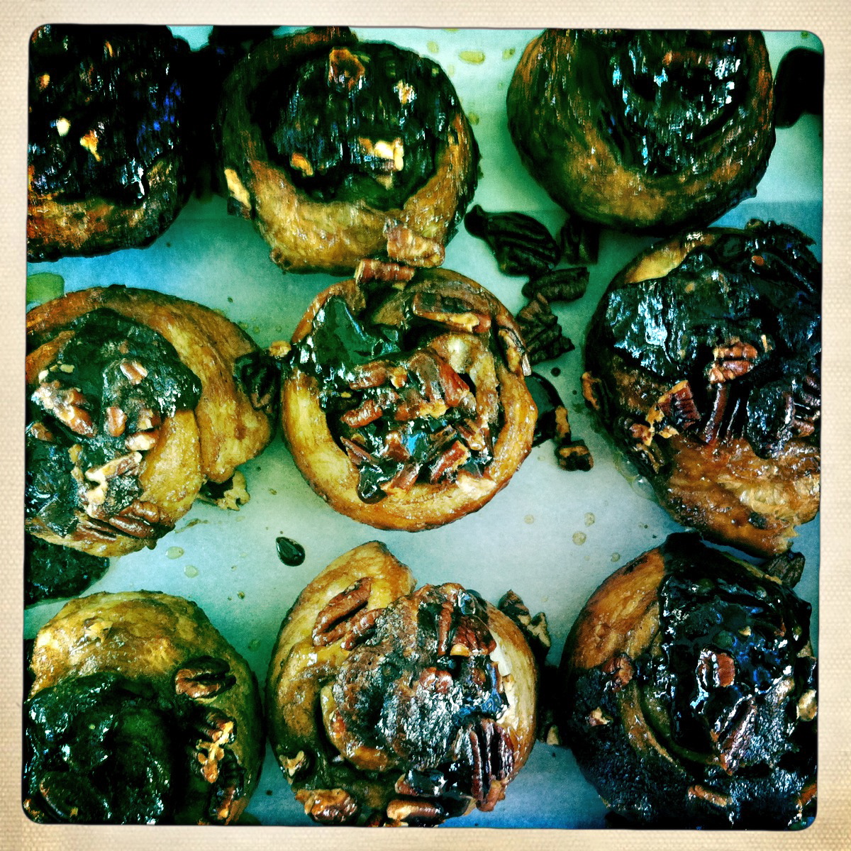 Let the browned muffins sit in the muffin tin for five minutes before flipping the whole shebang upside down- the sticky buns fall out onto the parchment paper, the oozy caramelized brown sugar and pecans dripping down over them. You might have to coax the sweet sauce out with a spoon- and be sure that you do. You’ll want every last bit.