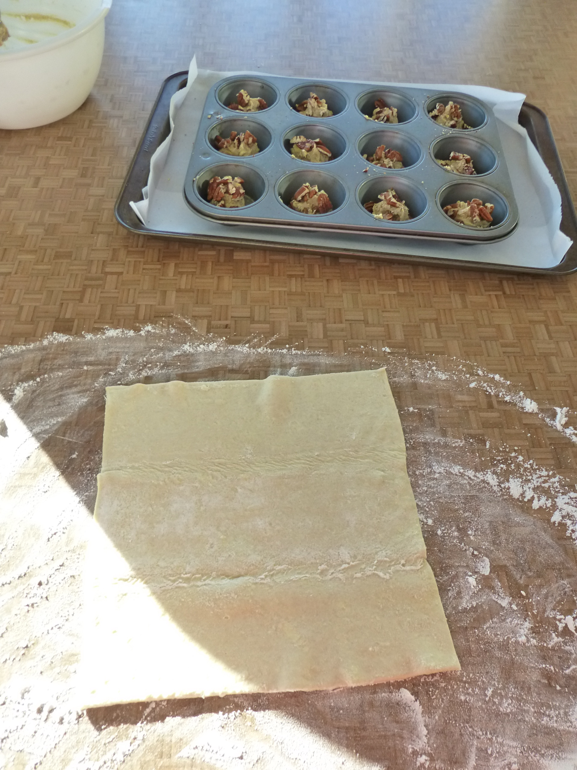 The genius part of these sticky buns is that you use refrigerated puff pastry dough! It comes out of the fridge ready to unfold and be covered in the delicious filling. Hint: it’s smart to have some flour on the surface before you lay out the dough.