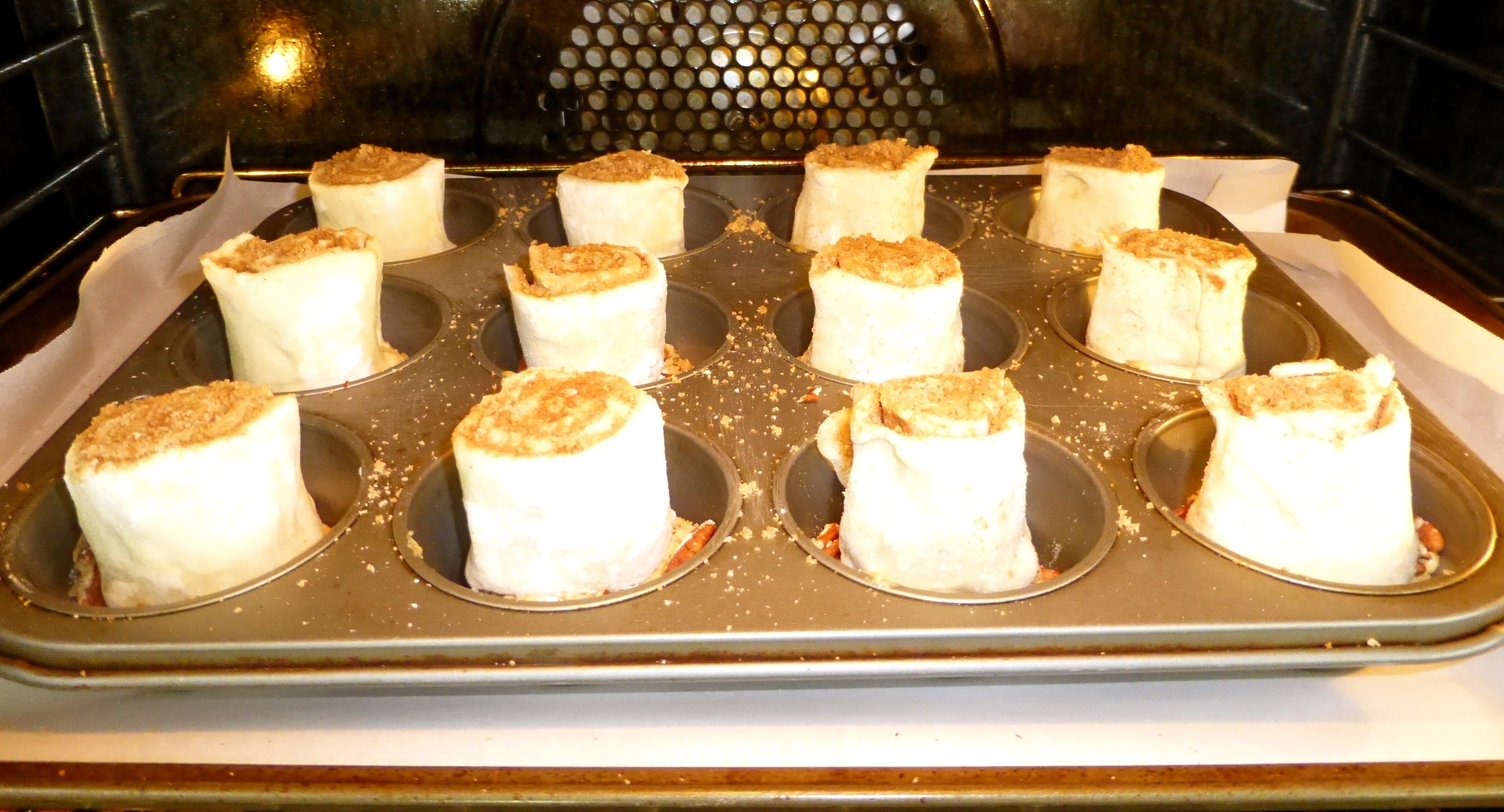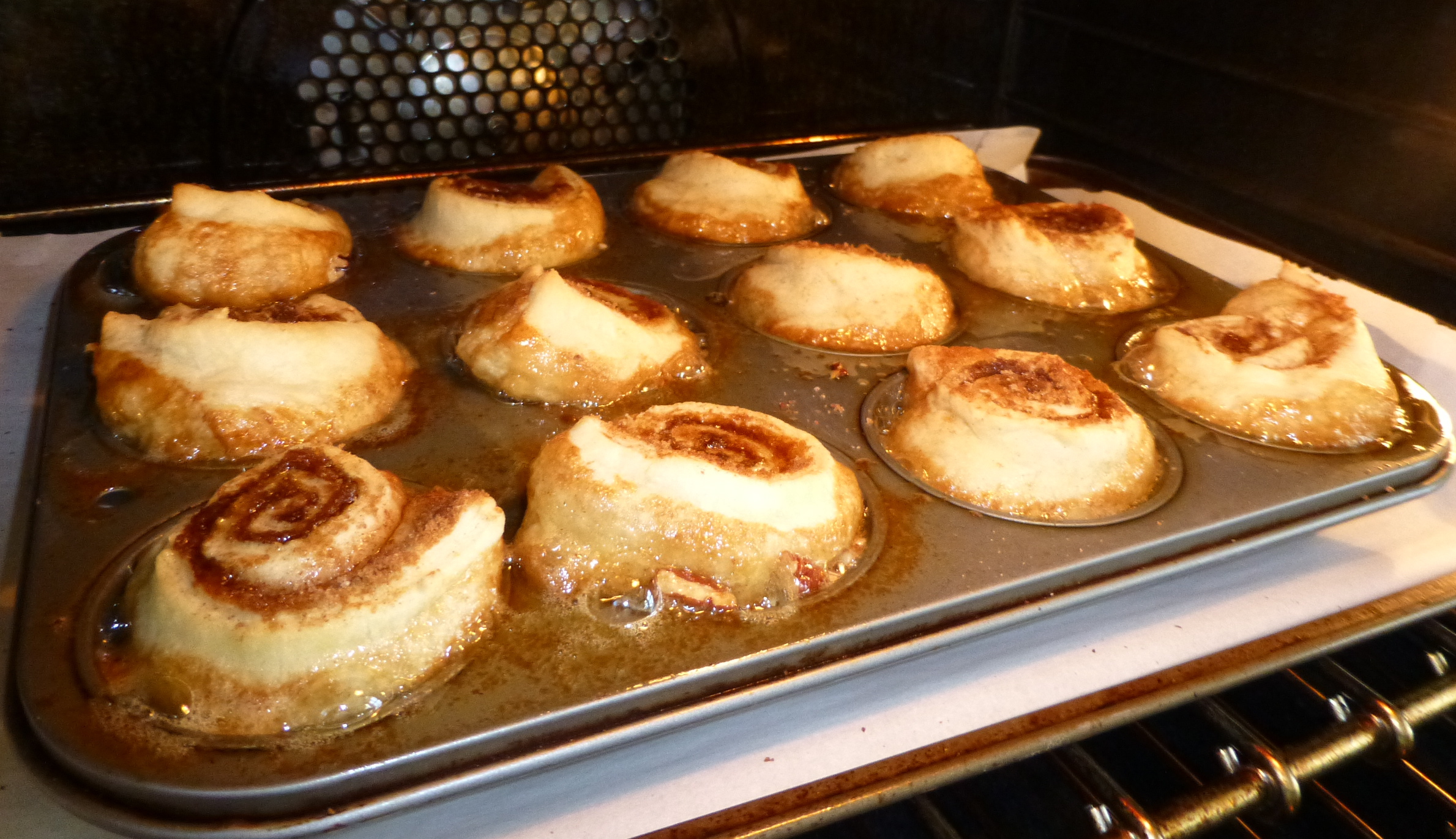 This gave me JUST enough time to bake the sticky buns! The muffin tin should be placed on a cookie sheet lined with parchment paper to bake- you’re going to want someplace for the sticky part to land! 30 minutes in a 400 degree oven is all it takes for AMAZINGNESS.