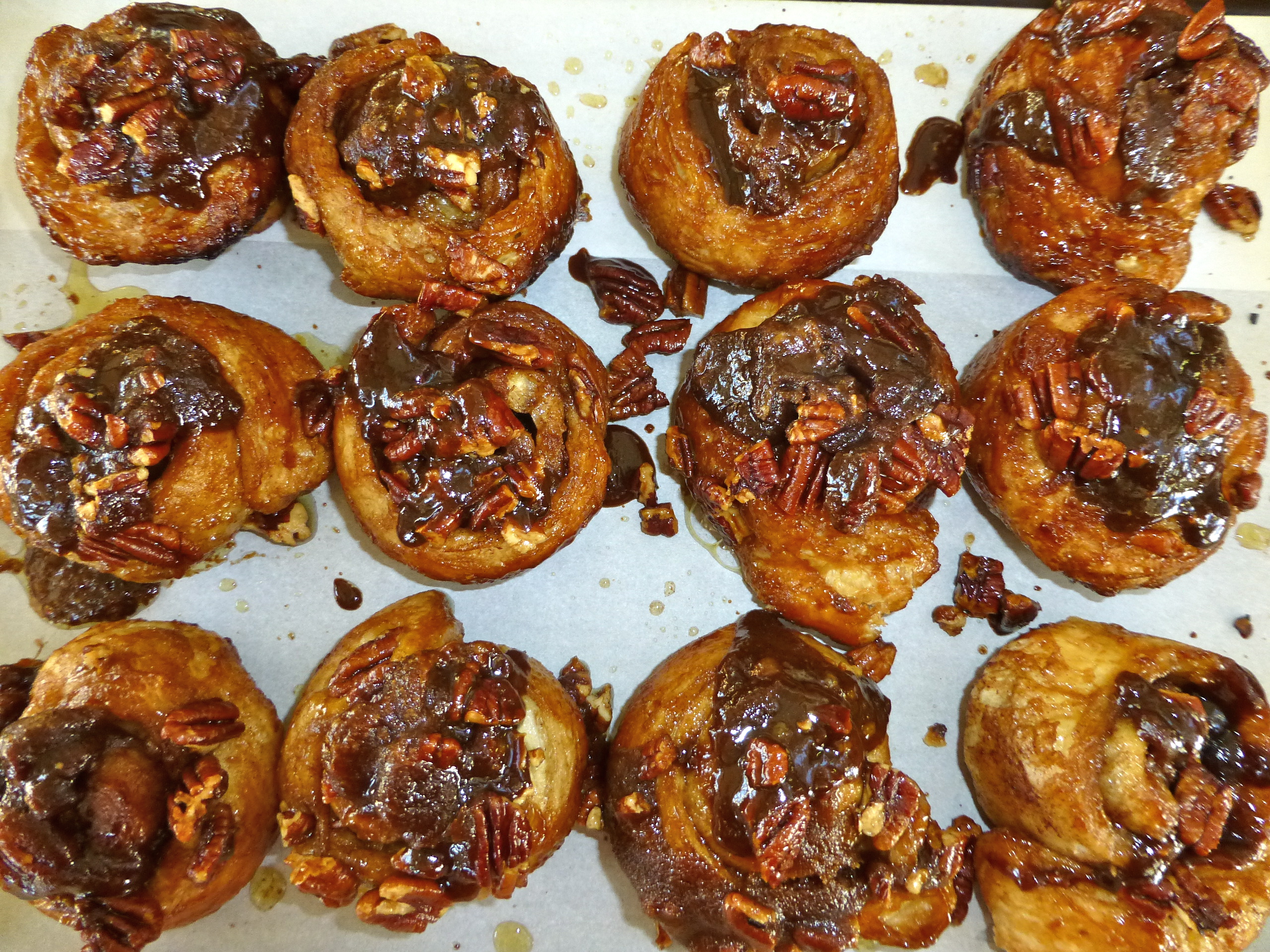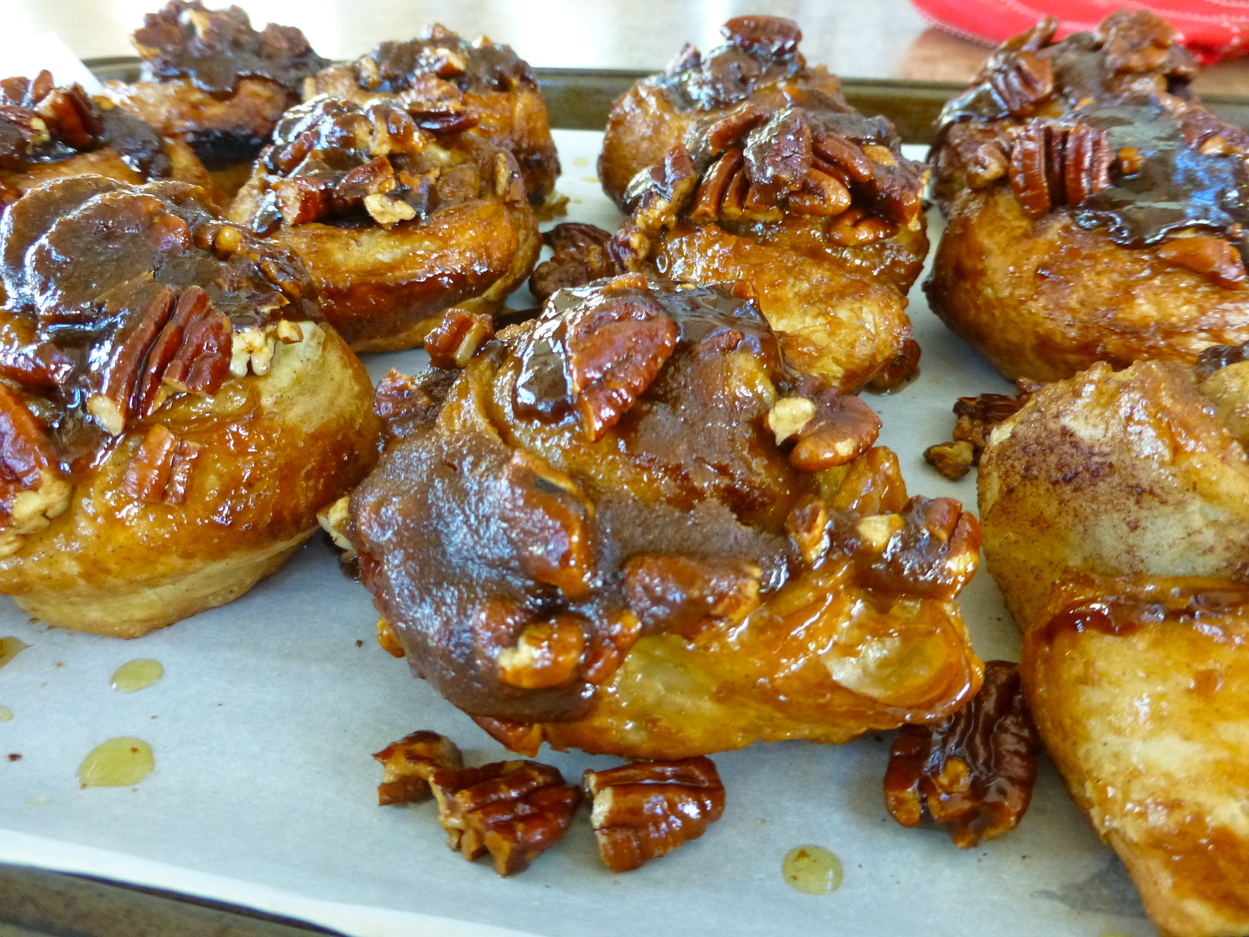 Bake for 30 minutes until the sticky buns are browned. Allow to cool for 5 minutes only, then flip the buns onto the parchment paper (ease remaining nuts and filling onto the buns with a spoon.