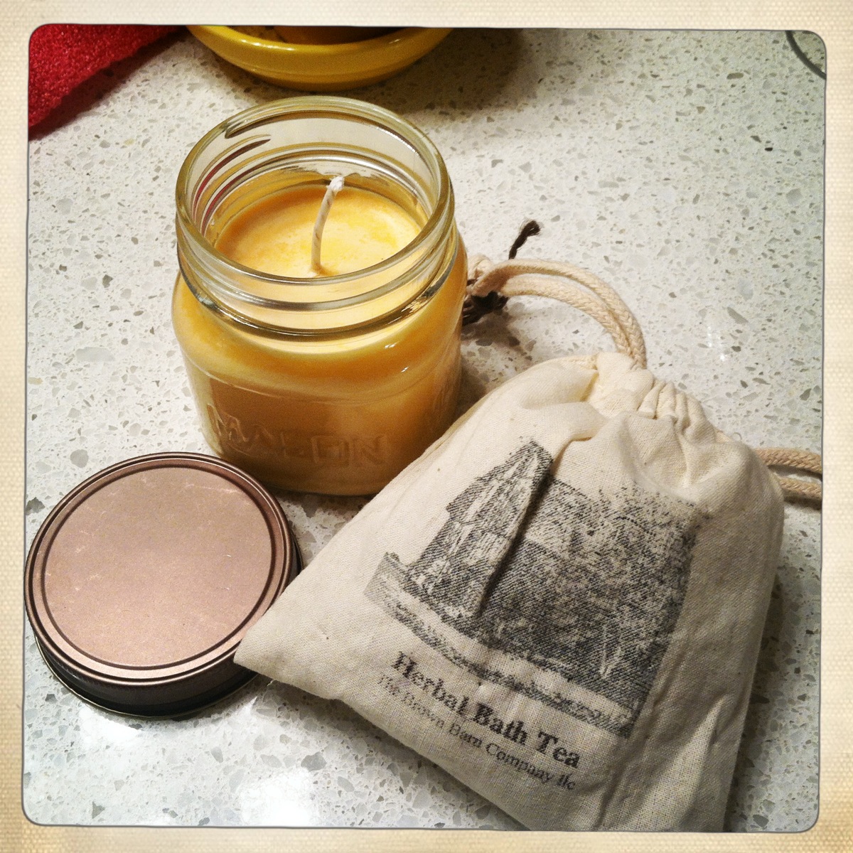 New bath time enhancers from Mom! The Mimosa candle is magical.