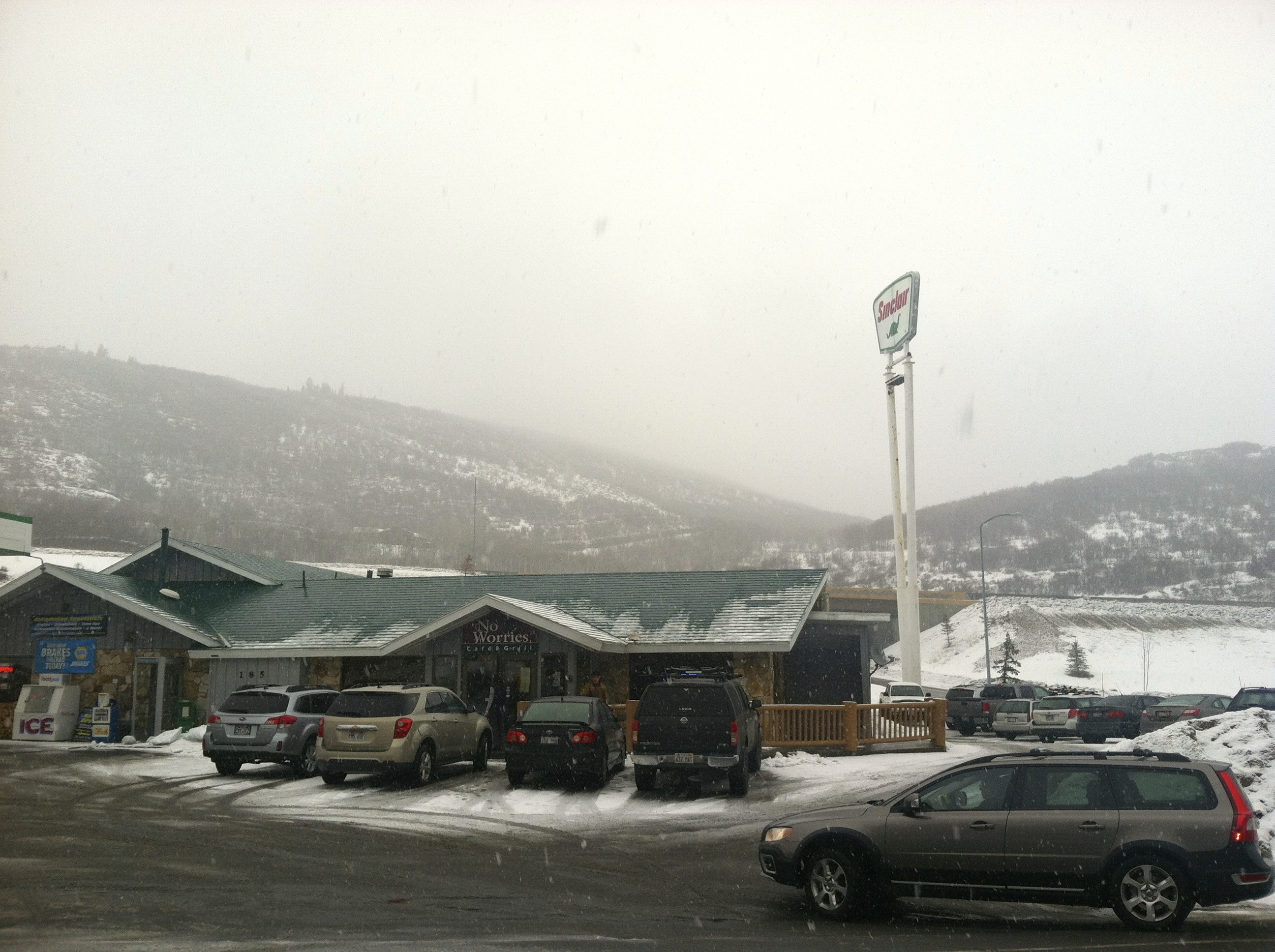 We’re lucky enough to have a cozy little spot for good eats nearby called the No Worries Café. It’s technically in Summit Park, which is the neighborhood on the other side of the valley from ours. (You might remember a few of my hikes from warmer months there. Remember when Cholula discovered squirrels?) The café is tucked in next to a Sinclair gas station, right off the highway. Aren’t the best diners always in the most random locations?