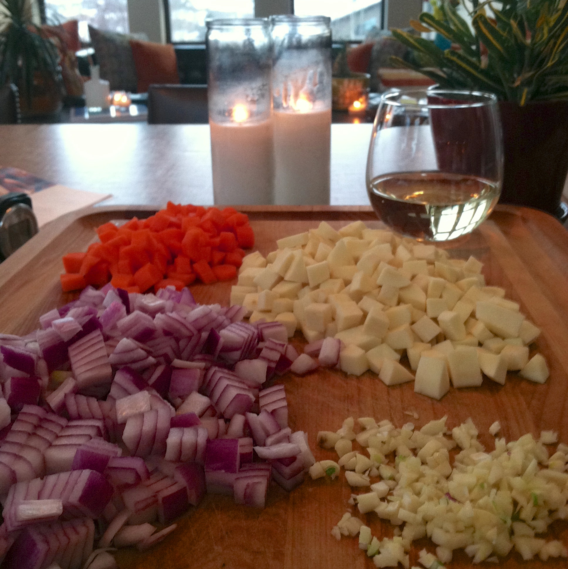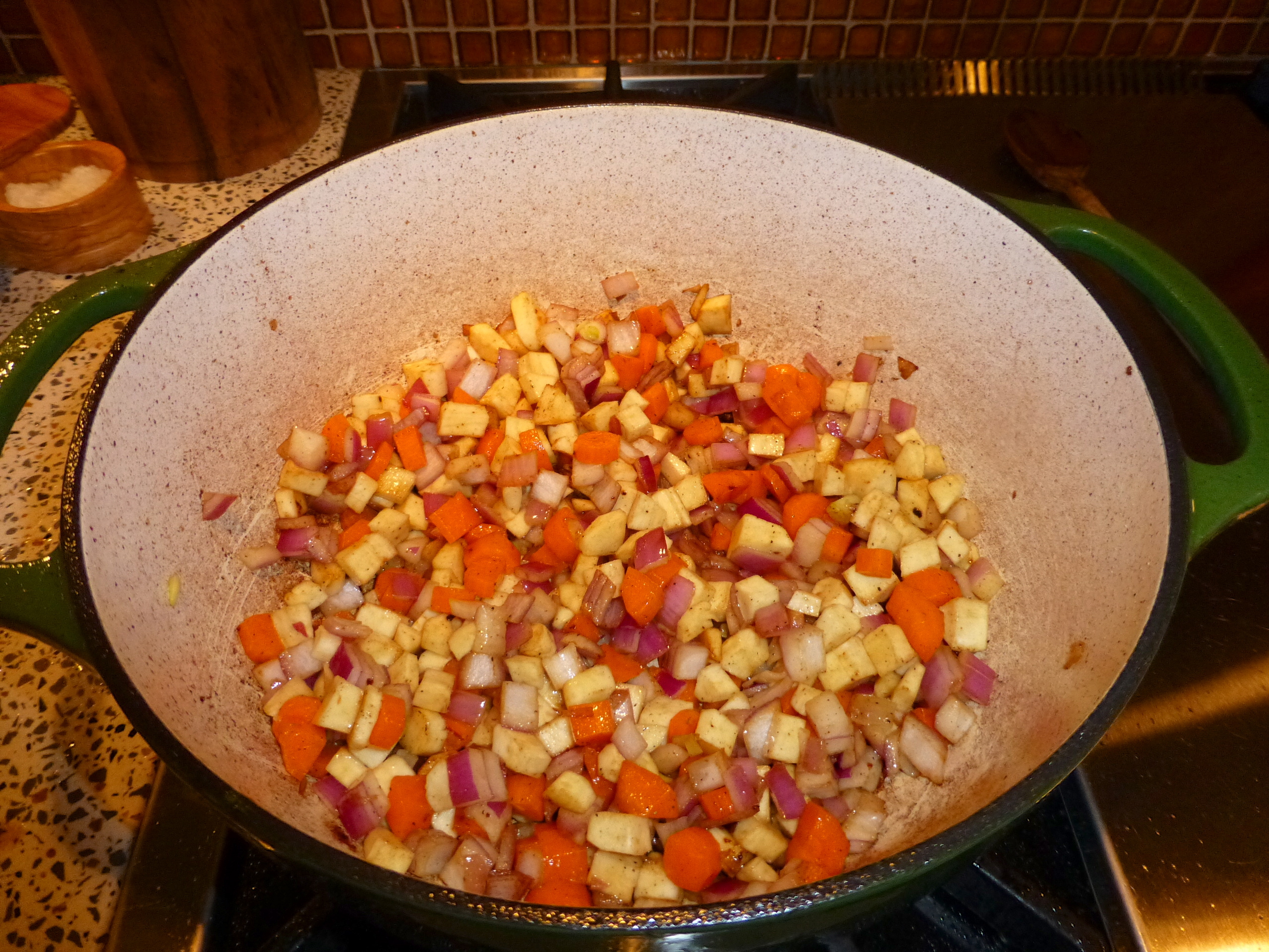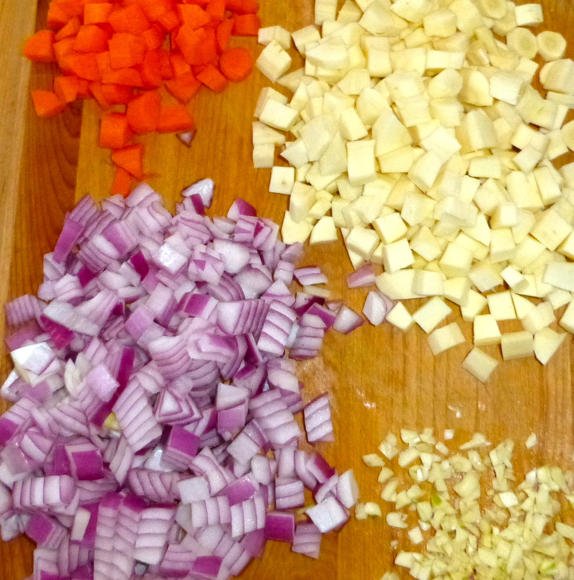 While the meat was doing its thing, I chopped carrot, the parsnips, an onion, and some garlic. (As usual, I used more garlic than the recipe called for. Such a rebel.)
