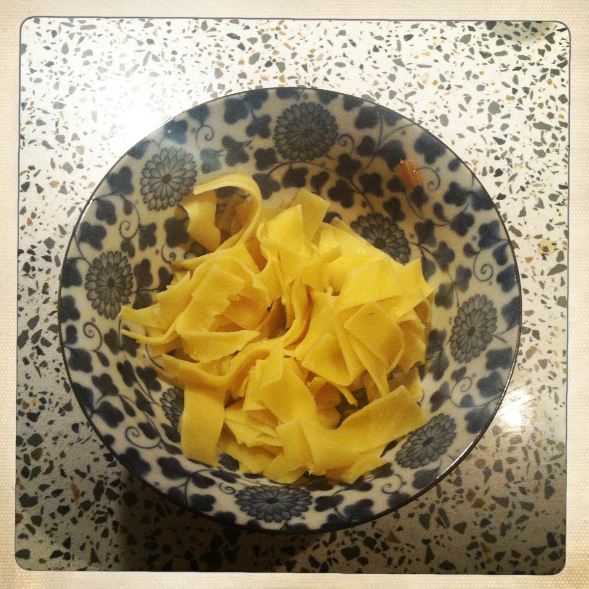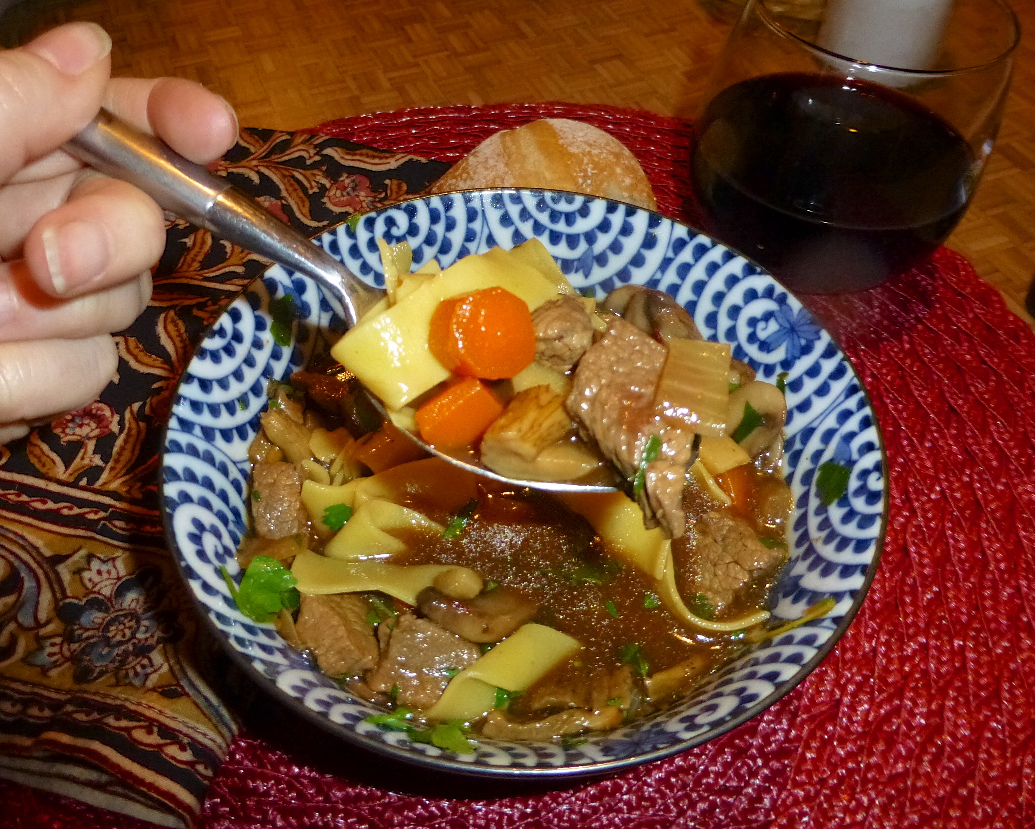 Instead of stirring the noodles into the stew (and risking mushiness later), I put some in the bottom of each bowl and spooned the stew over them. A sprinkle of parsley on top, a plate of cute little ciabatta rolls on the side, and a glass of red wine- we were ready to eat.
