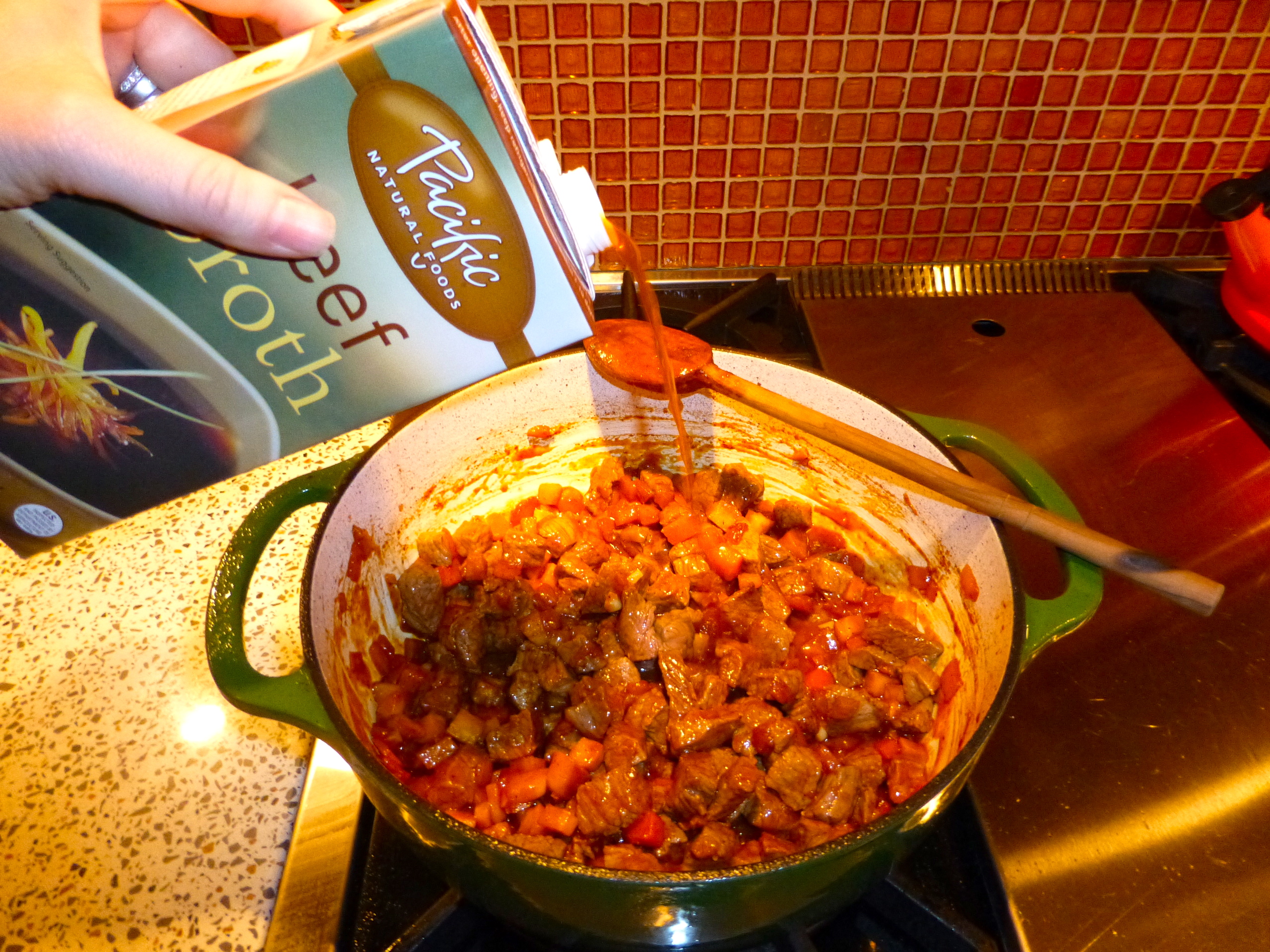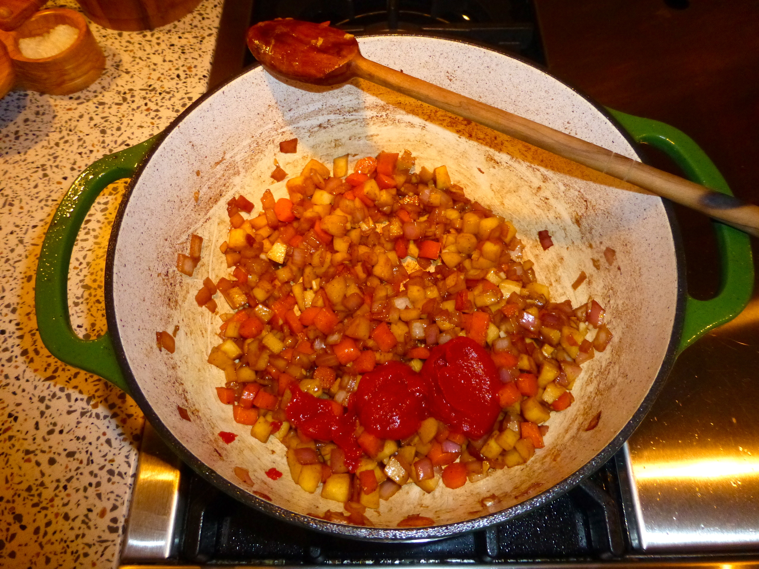 The browned meat came out of the pot for awhile and the veggies went IN. I added some fresh thyme, just because I thought it sounded yummy. I scooped in some tomato paste, gave it all a stir, and let it cook for a handful of minutes.