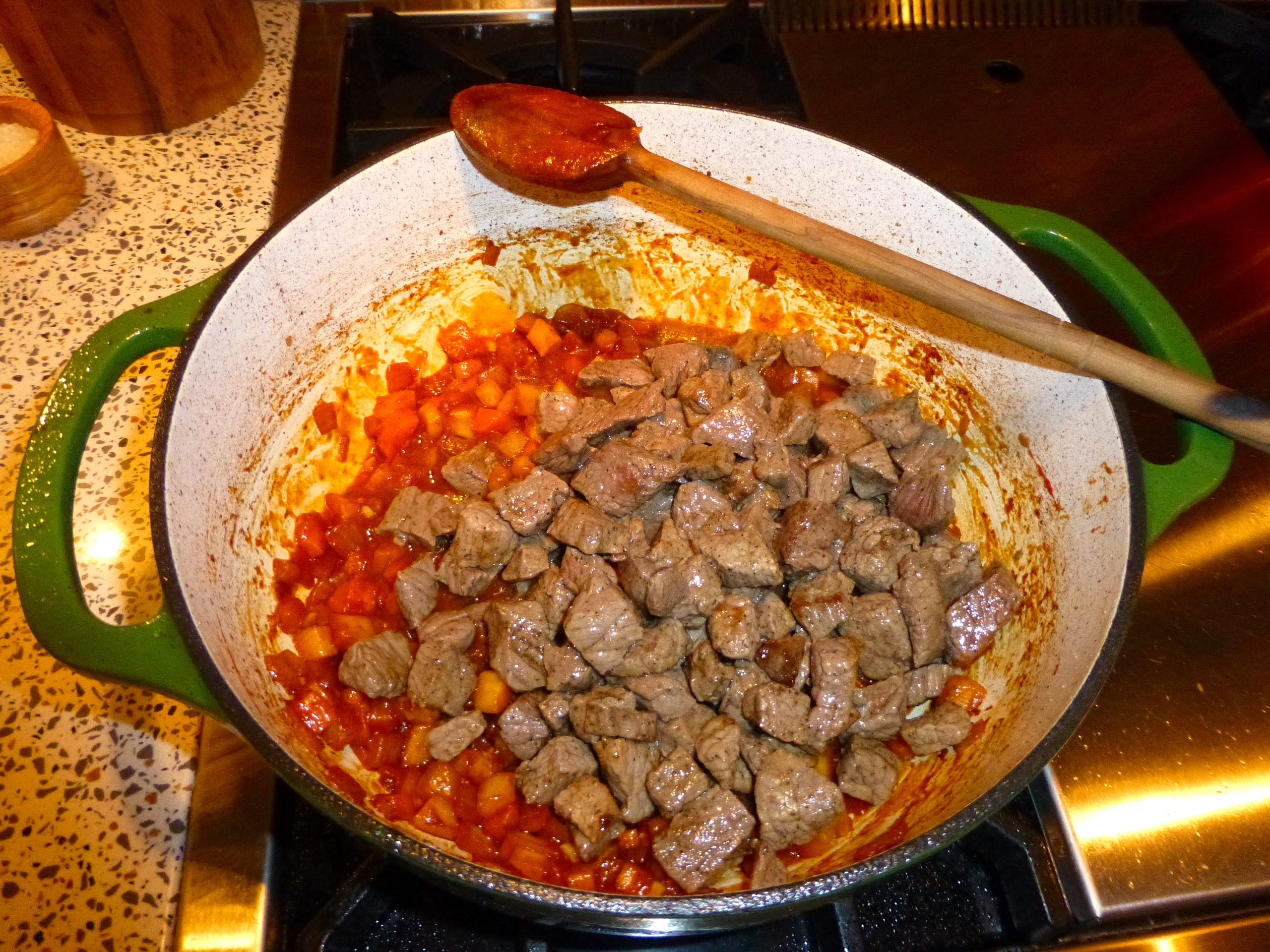 Next, I spent a little time with the stew meat. My butcher provides meat just for stews, already cut into bite-sized pieces. How convenient! In batches, using incredibly long tongs, I browned up the little chunks in my favorite green soup pot.
