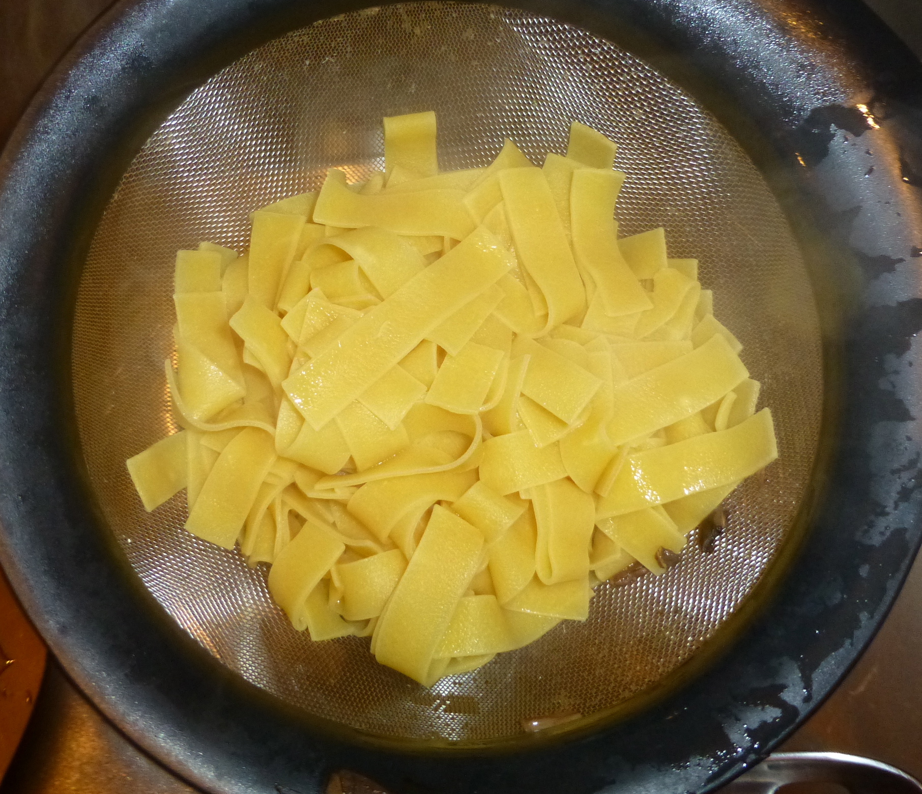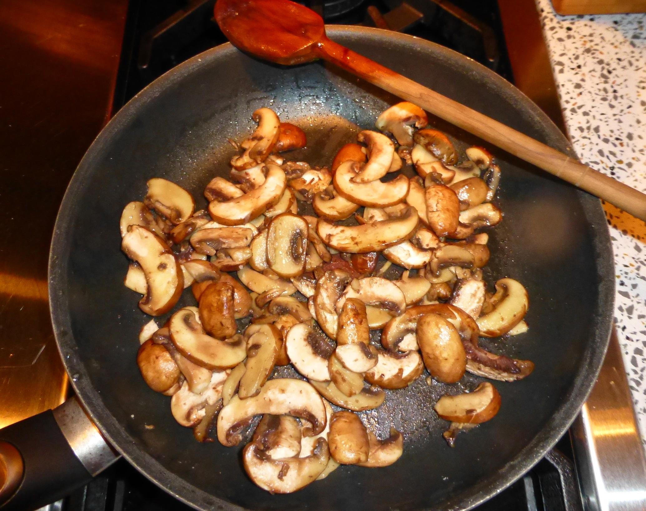 We were getting close! I sliced up some fresh mushrooms, and chopped more thyme and some Italian parsley. I cooked up the sliced mushrooms with some seasonings and got a pot of water boiling for noodles. In this kind of stew, only egg noodles will do. John agrees. We are so perfect together.
