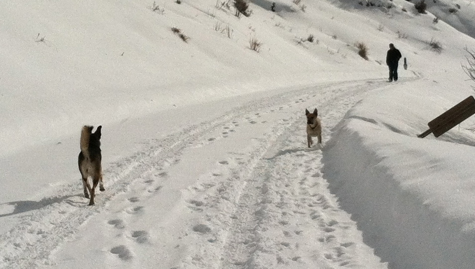 Cholula encountered a friend on the way back- a feisty, pointy-eared thing named Bo. As we got closer to the end of our walk, the sun warmed me enough to unzip my jacket. Cholula sensed our fun trail time was limited and had a crazy burst of energy.