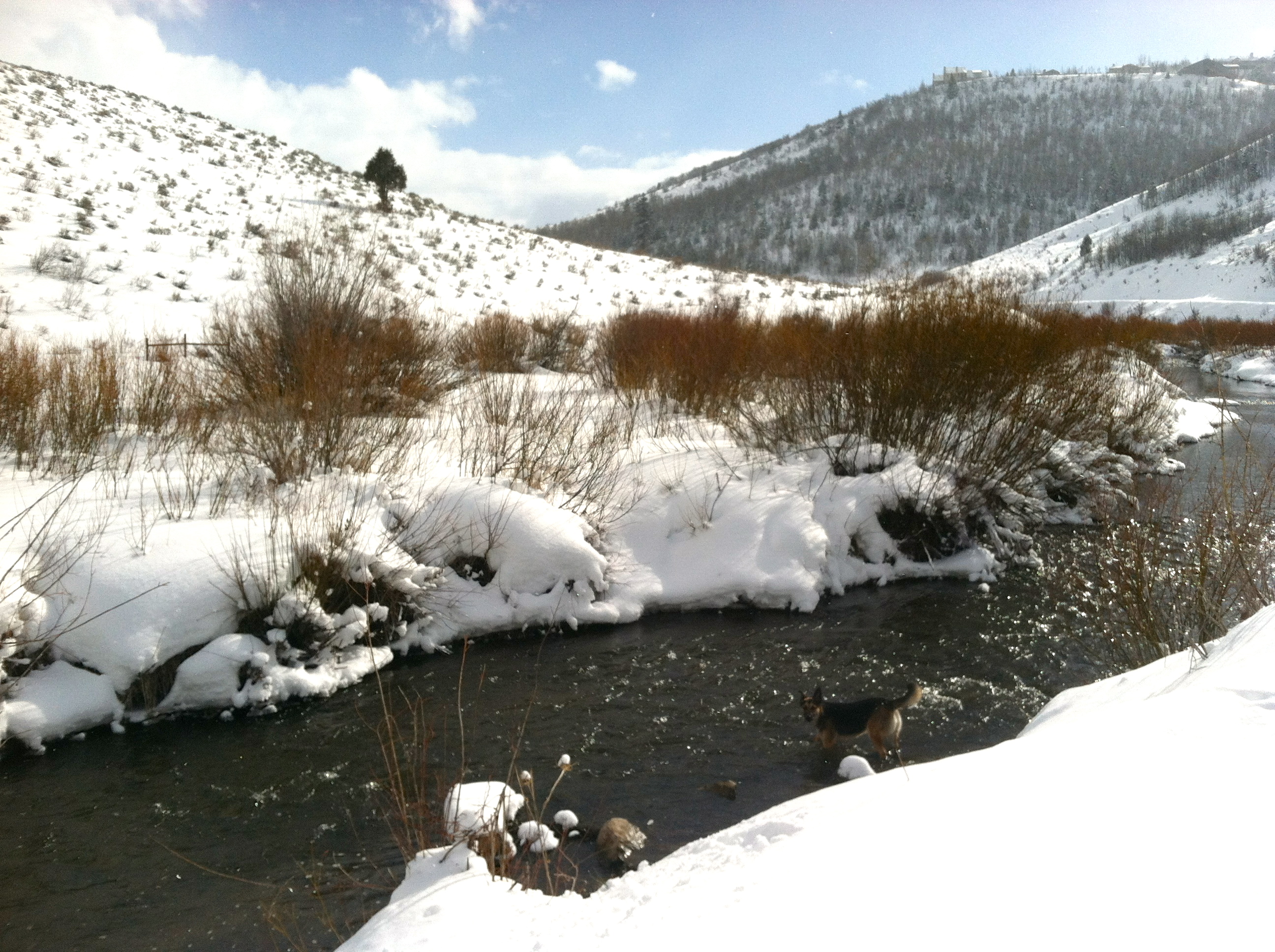 At one point, we both stopped to gaze at a cluster of houses along the river, smoke puffing from one of the chimneys. I think Cholula and I shared the same farmhouse pioneer daydream right then. She’d make a great ranch dog.