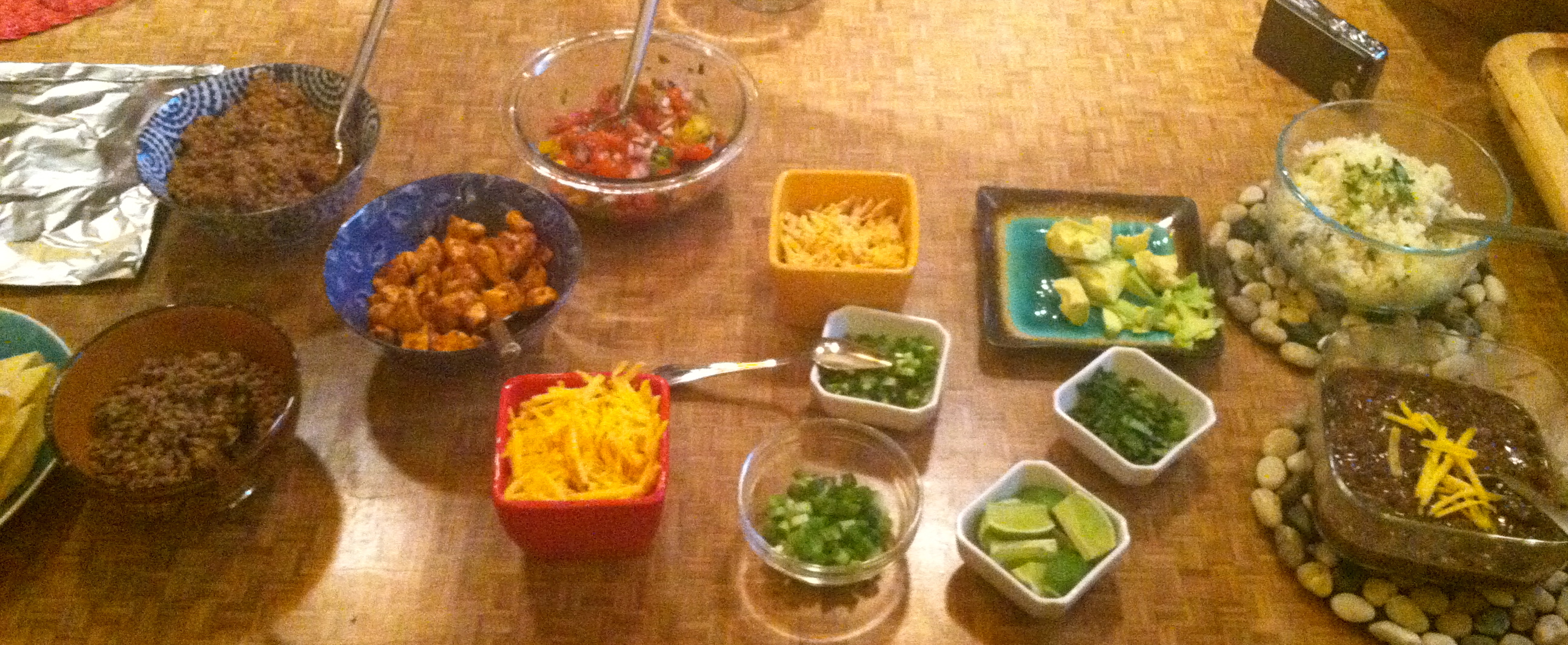 After my hike with Cholula, as the sky outside lit up and darkened and lit up again, I started prepping for Make Your Own Taco Night. One thing I’ve learned by watching friends with children is that kids like options. I figured each person could choose their own taco shell (crunchy or hard), taco meat (season or plain ground beef, seasoned chicken), and then I’d provide a rainbow of fixings and a couple of side dishes. Make ‘em just the way you like!