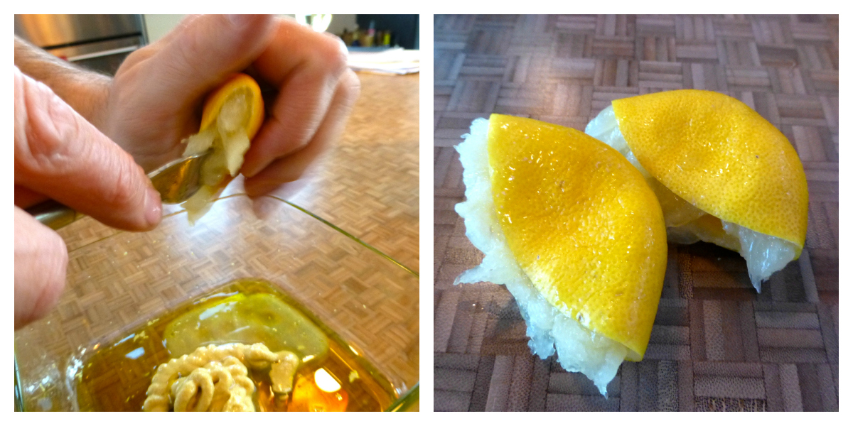 I find John’s method for juicing a lemon adorable. He slices it in half and sticks a fork into the lemon, squeezing and twisting the fork. One lemon’s worth of juice is whisked into the oil and mustard until it’s combined.