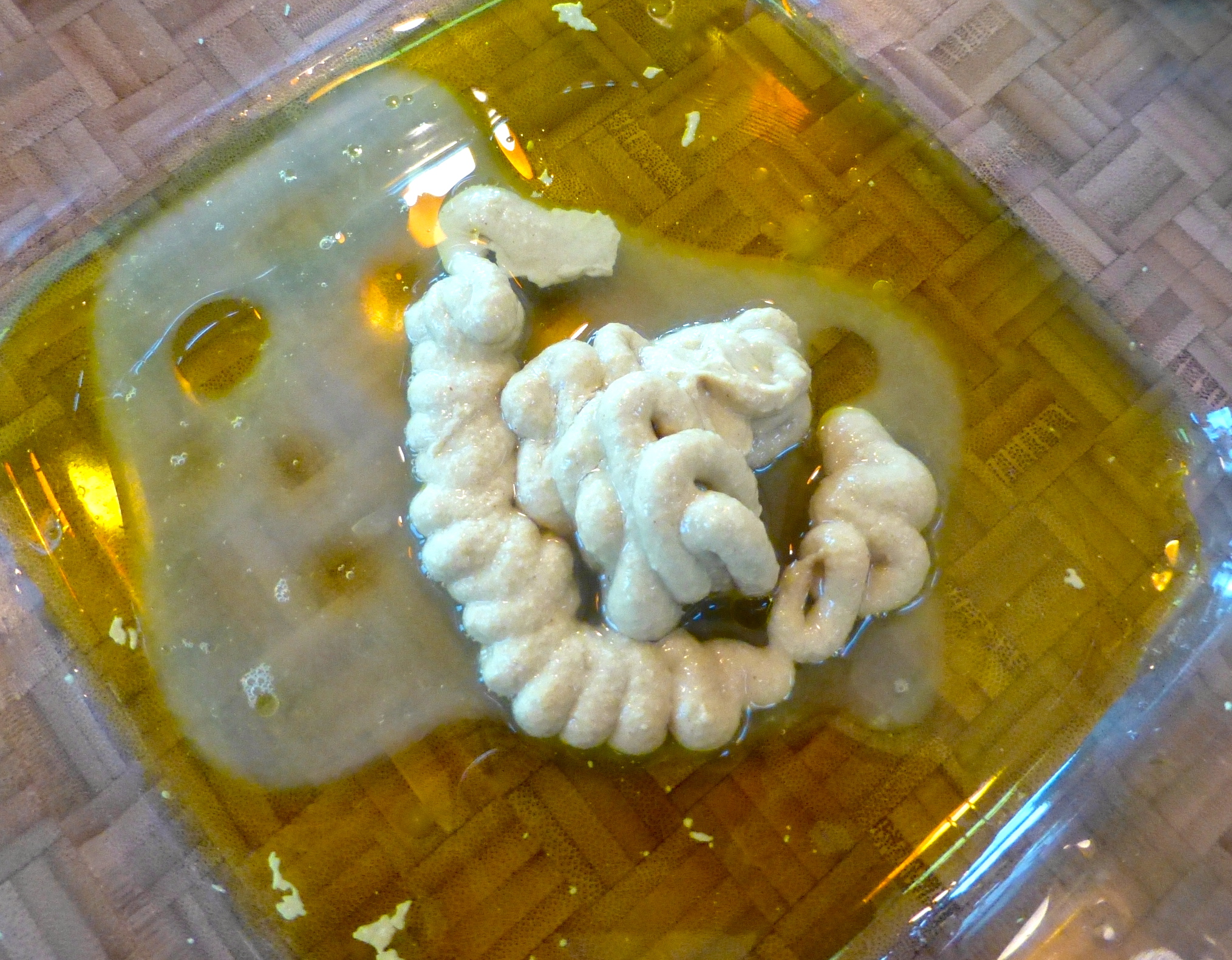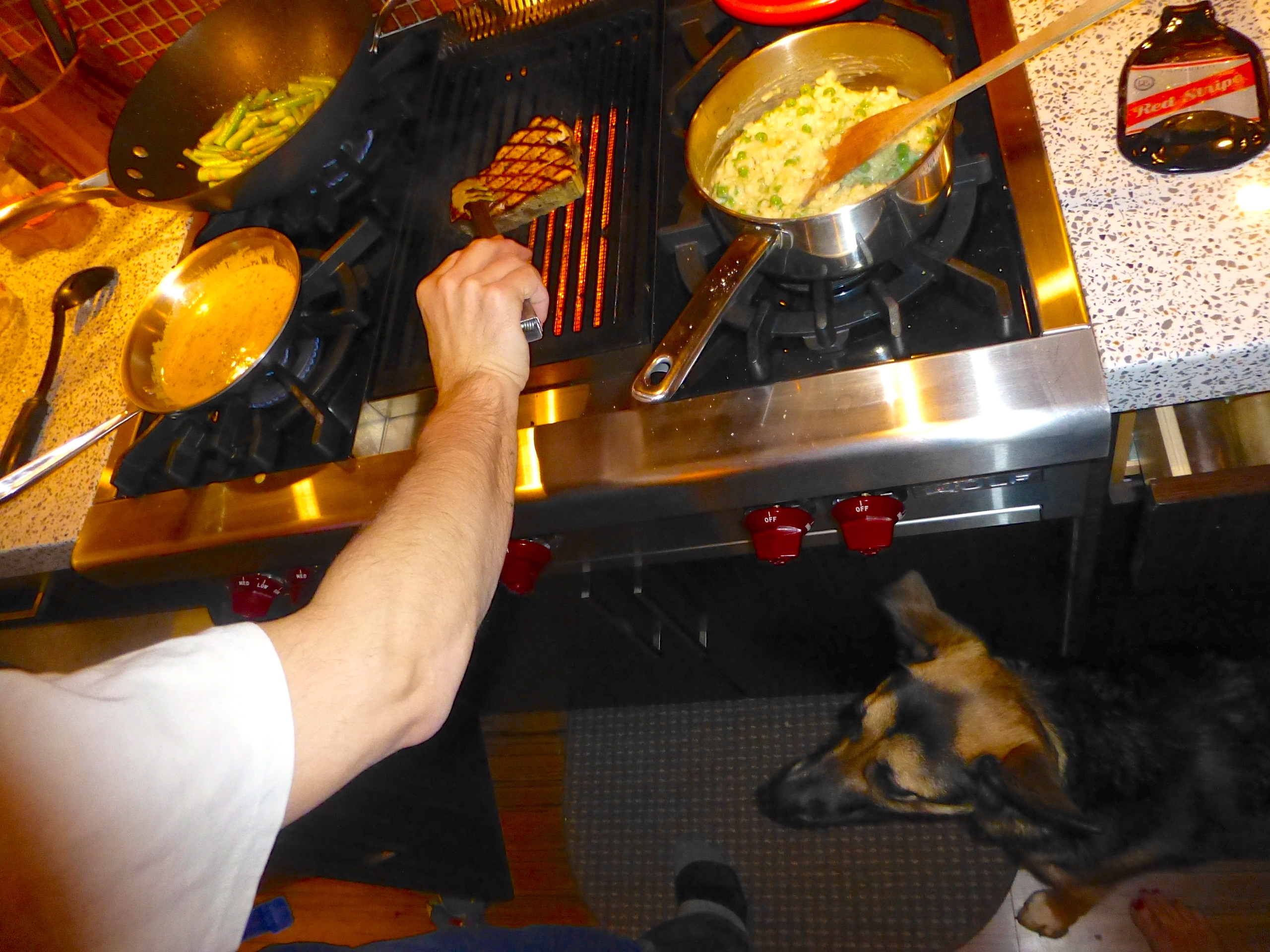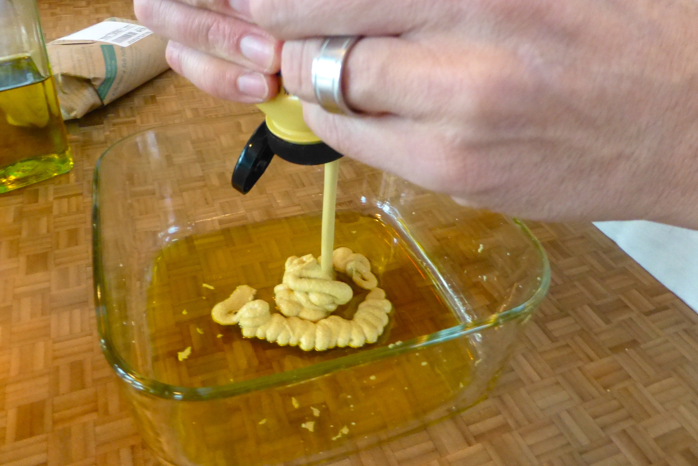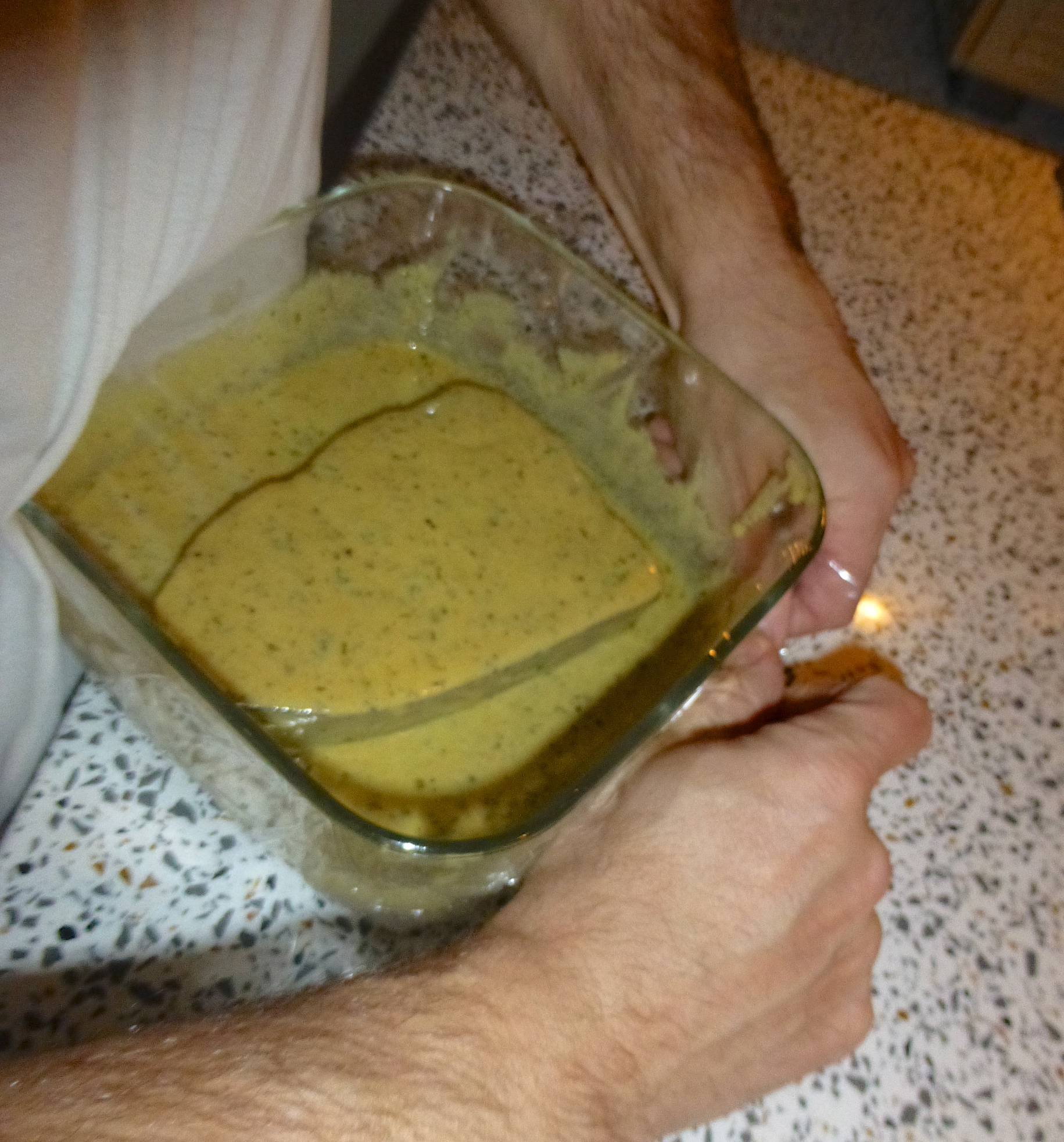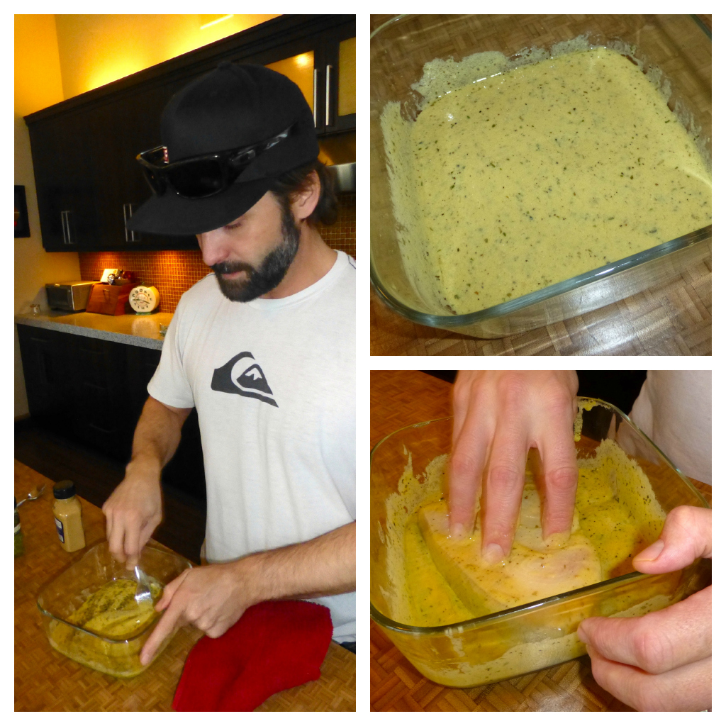 In a shallow dish, John started with a few swirls of olive oil. Into the oil, he squirted a few tablespoons of Dijon mustard. About this time, it became clear that Cholula’s kitchen assistant contract is not exclusive to me.
