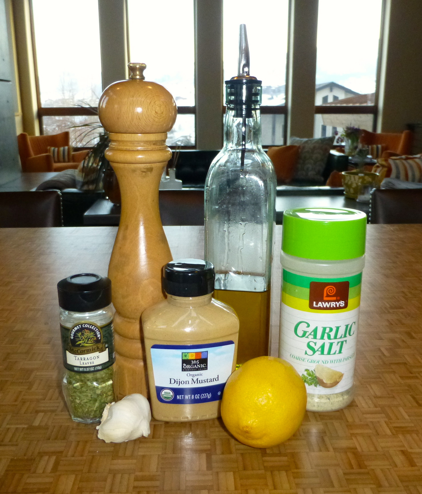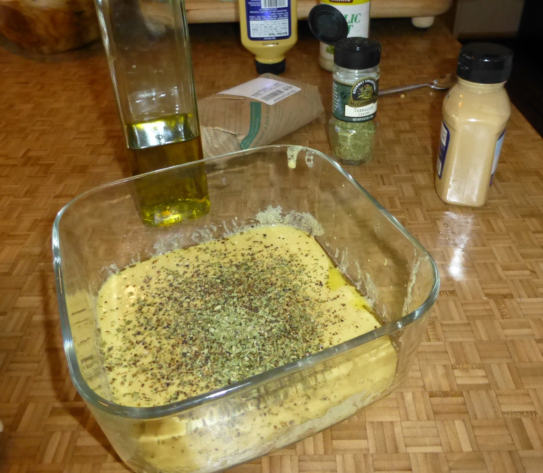 All that’s left is the seasoning. Garlic salt, fresh cracked black pepper, and the key– a palm full of dried tarragon. A dip of the finger reveals a tart, tangy flavor with an earthly bite from the herb. This isn’t a subtle marinade.