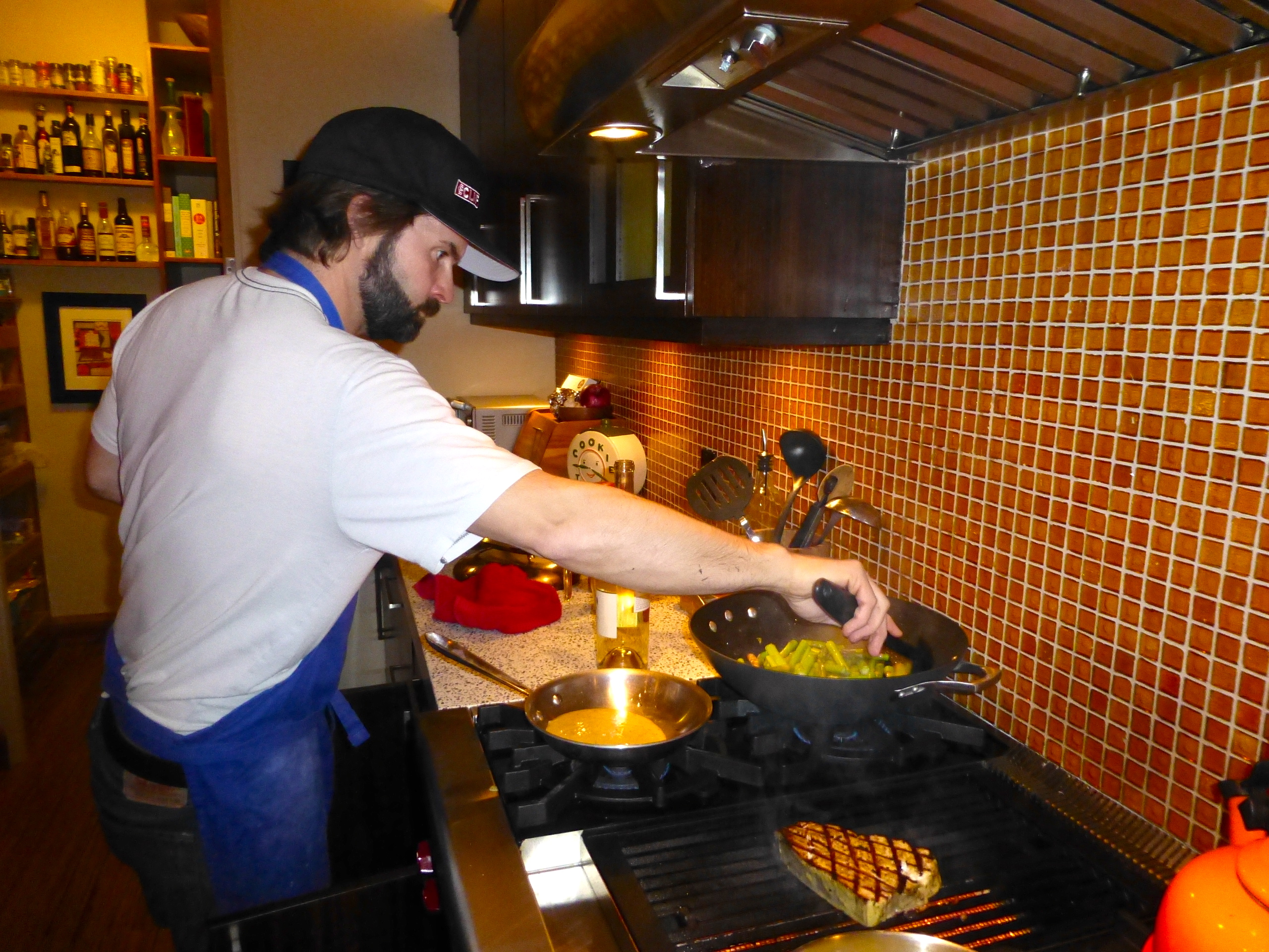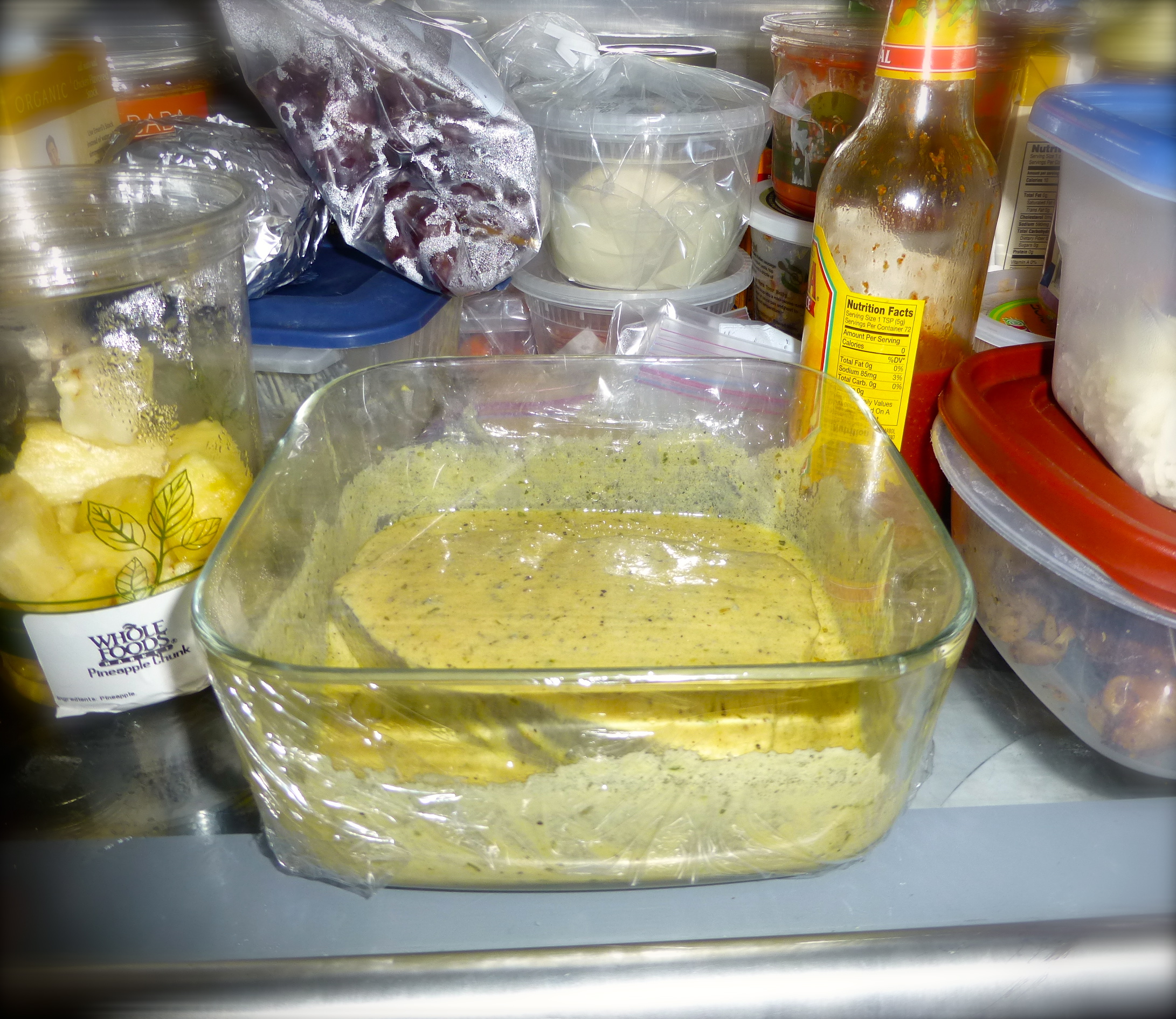 Into the sauce went the swordfish steak. John was careful to coat all sides of the fish, flipping it a few times, before wrapping it tightly with plastic wrap. With fish, it only needs to marinate for about an hour. With poultry, longer is better- even overnight. Cholula took careful mental notes.