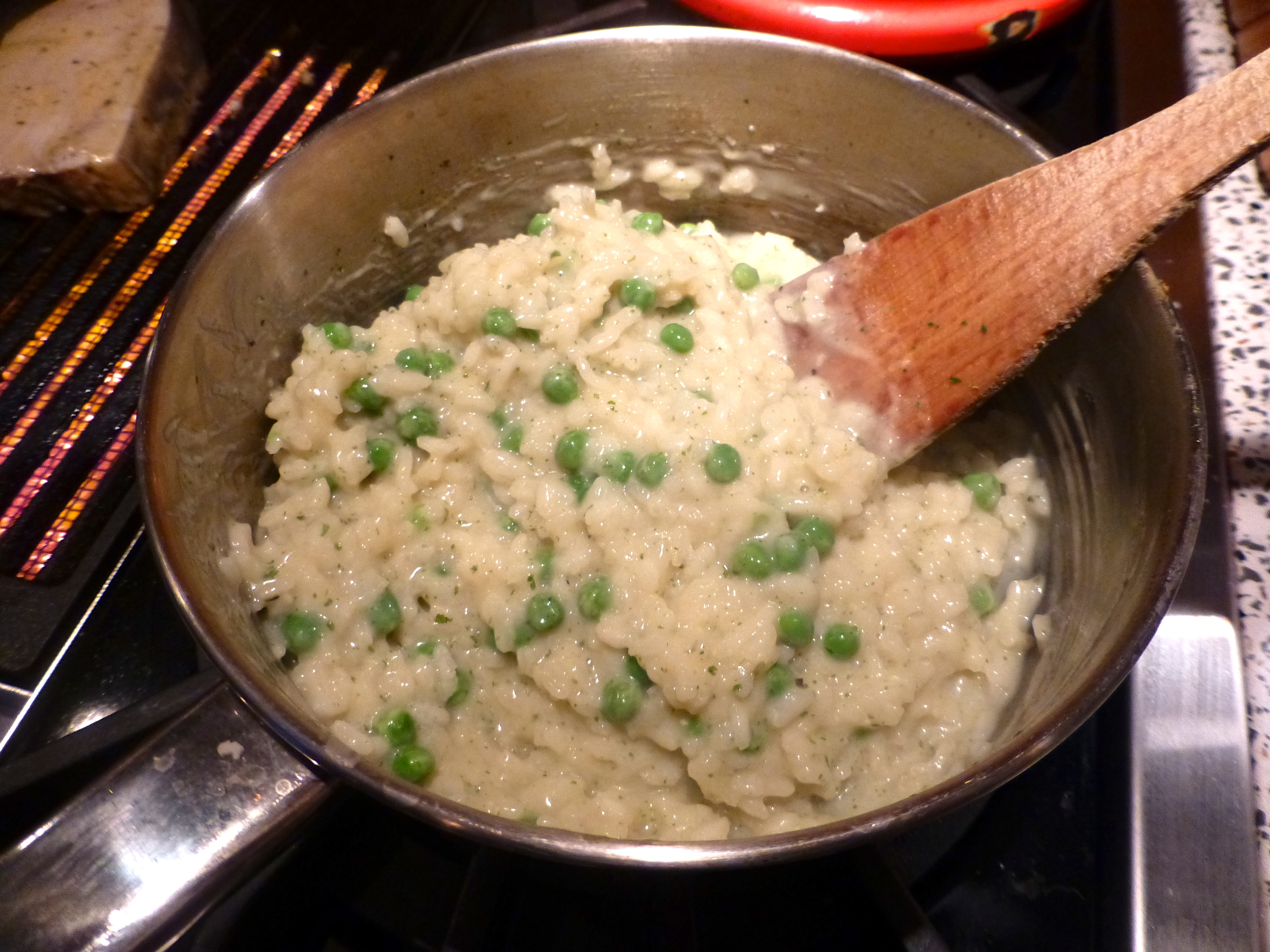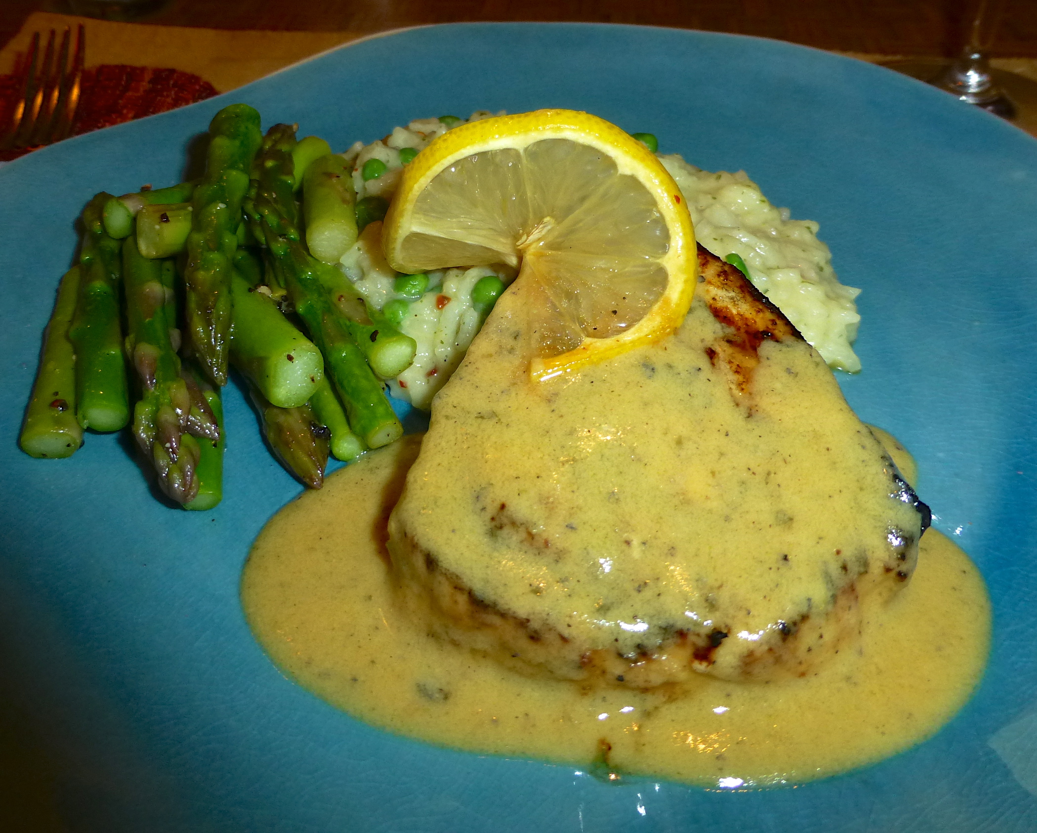 Last night, we served the fish with a parmesan-pea risotto and asparagus. While I got to work on those things, John grilled up the swordfish. The marinade is thick enough that it clings to the fish, which makes it delectable with a little char from the grill.