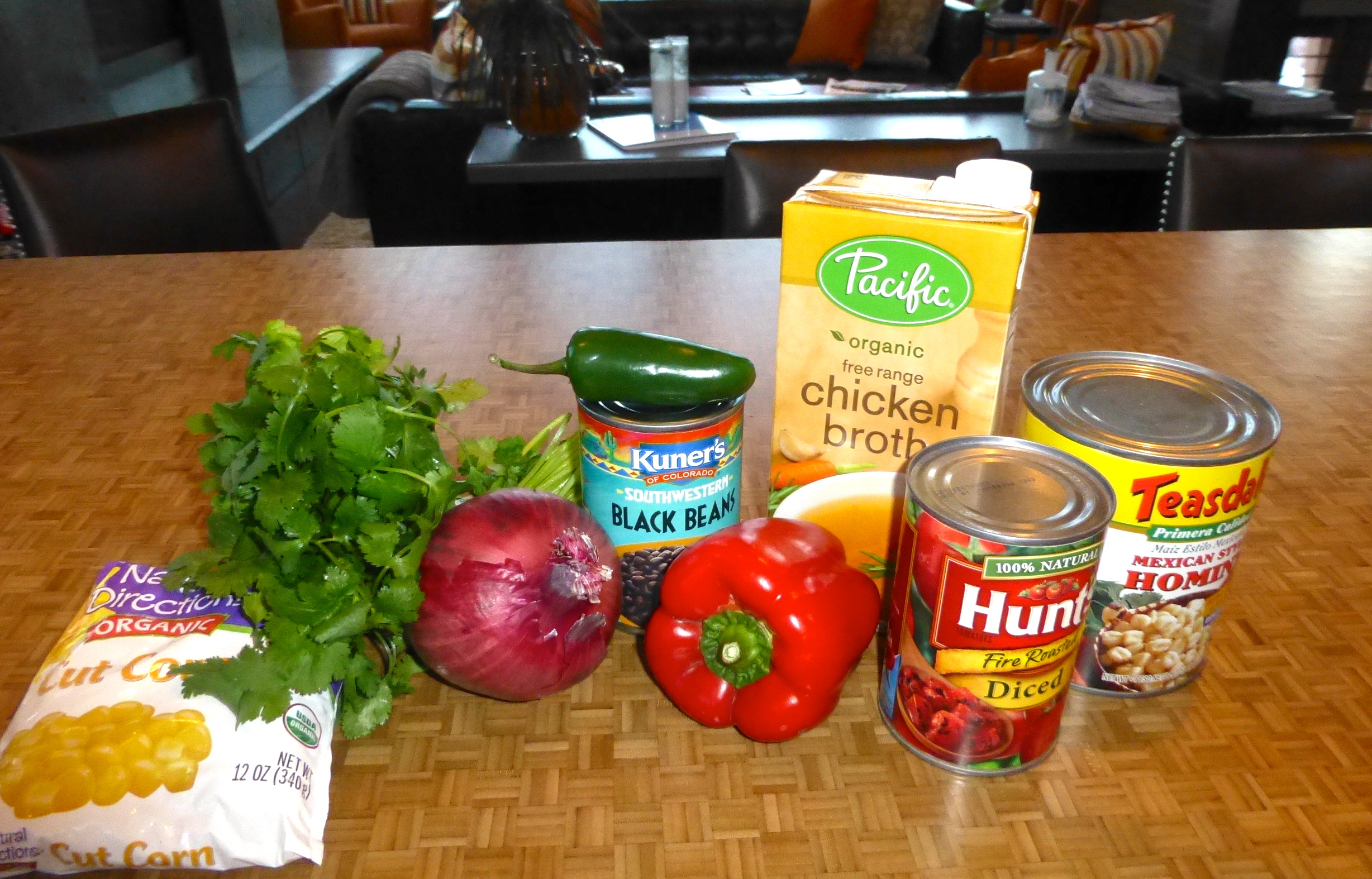 *Tortilla soup variation: Omit hominy. Before serving, stir 1 cup of crushed tortilla chips into the soup. Top with more tortillas before serving.