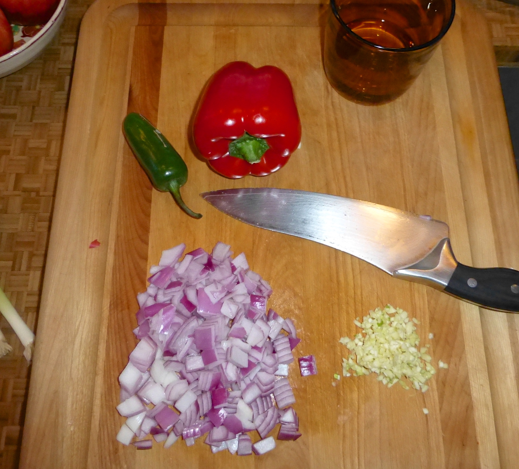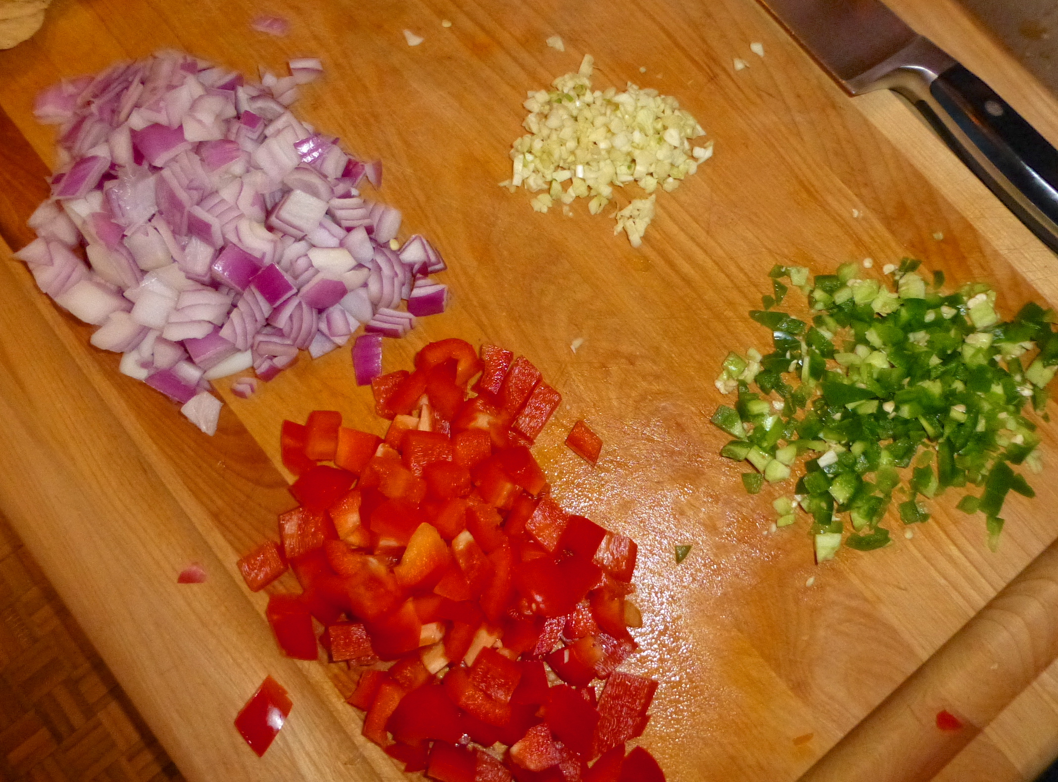 I start by chopping up the basics of any good soup: onion and garlic. A key for this soup is also a full jalapeno, seeds and all, for extra HEAT. For texture, I included a crunchy, vibrant red pepper. Not a bad start!
