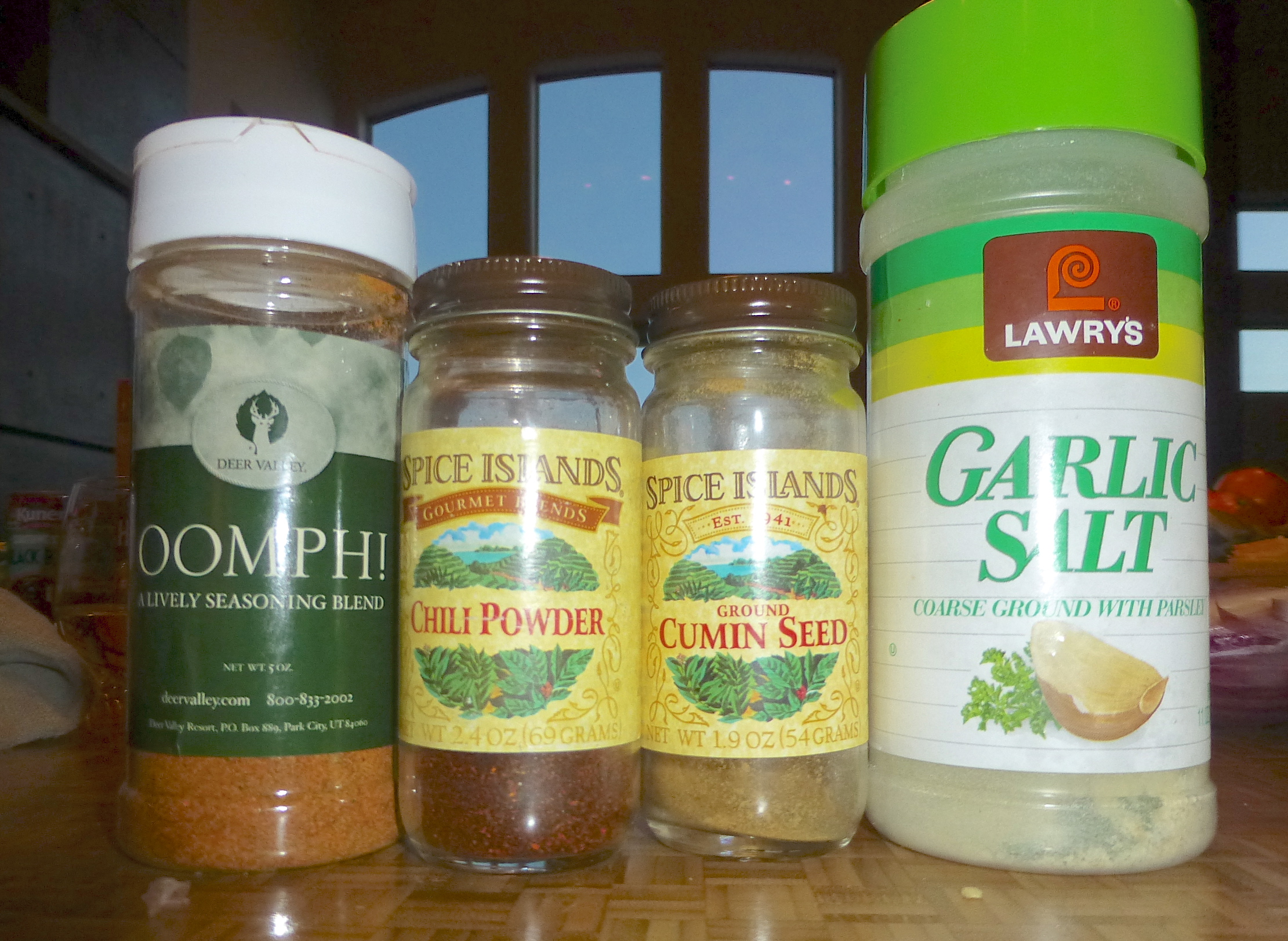 The seasonings are pretty basic: cumin and chili powder. I also added some of the “Oomph” seasoning I have (a blend of Mexican spices) and my trusty garlic salt. Not pictured is crushed red pepper, which I also shook into the pot for a different kind of spicy.