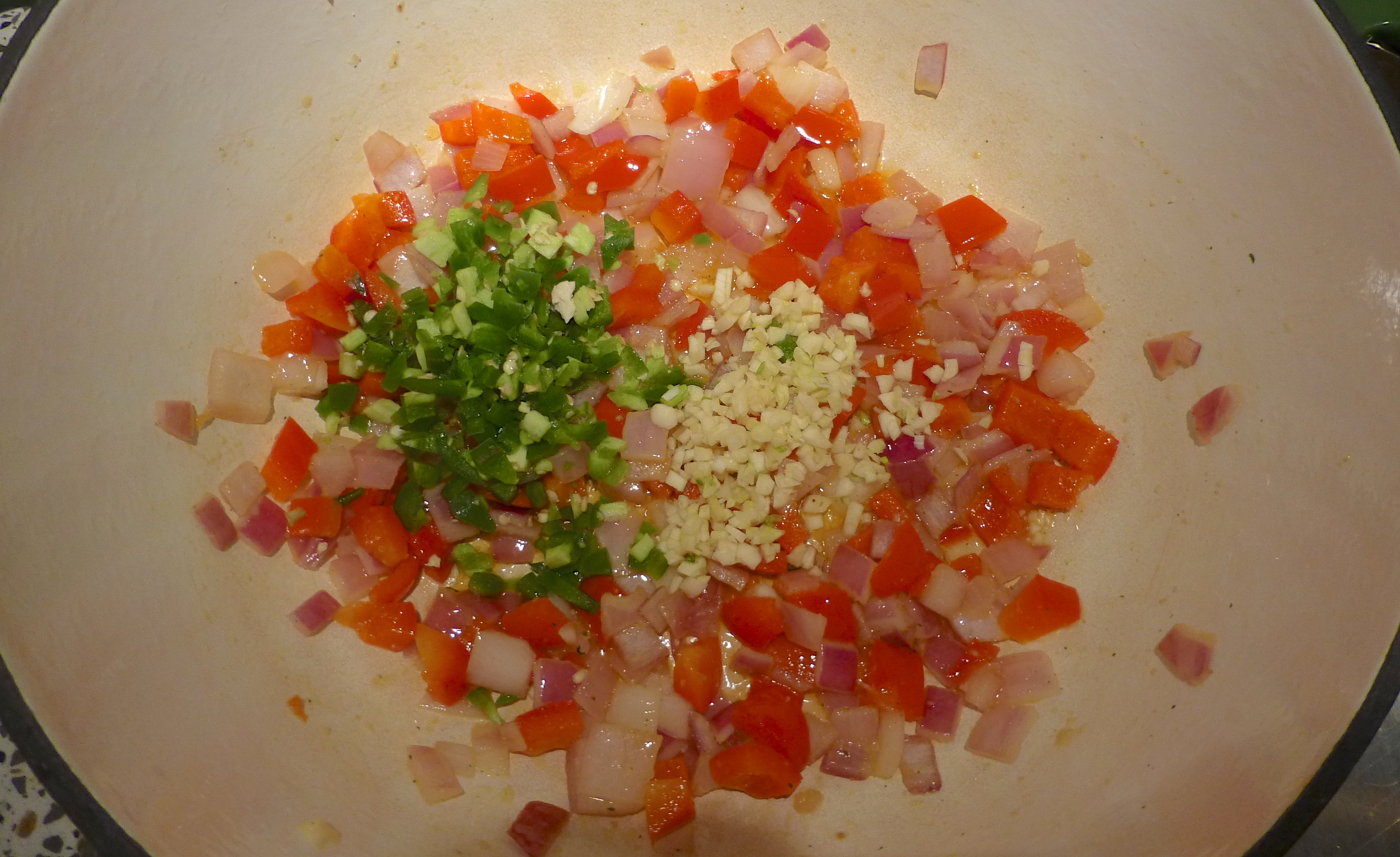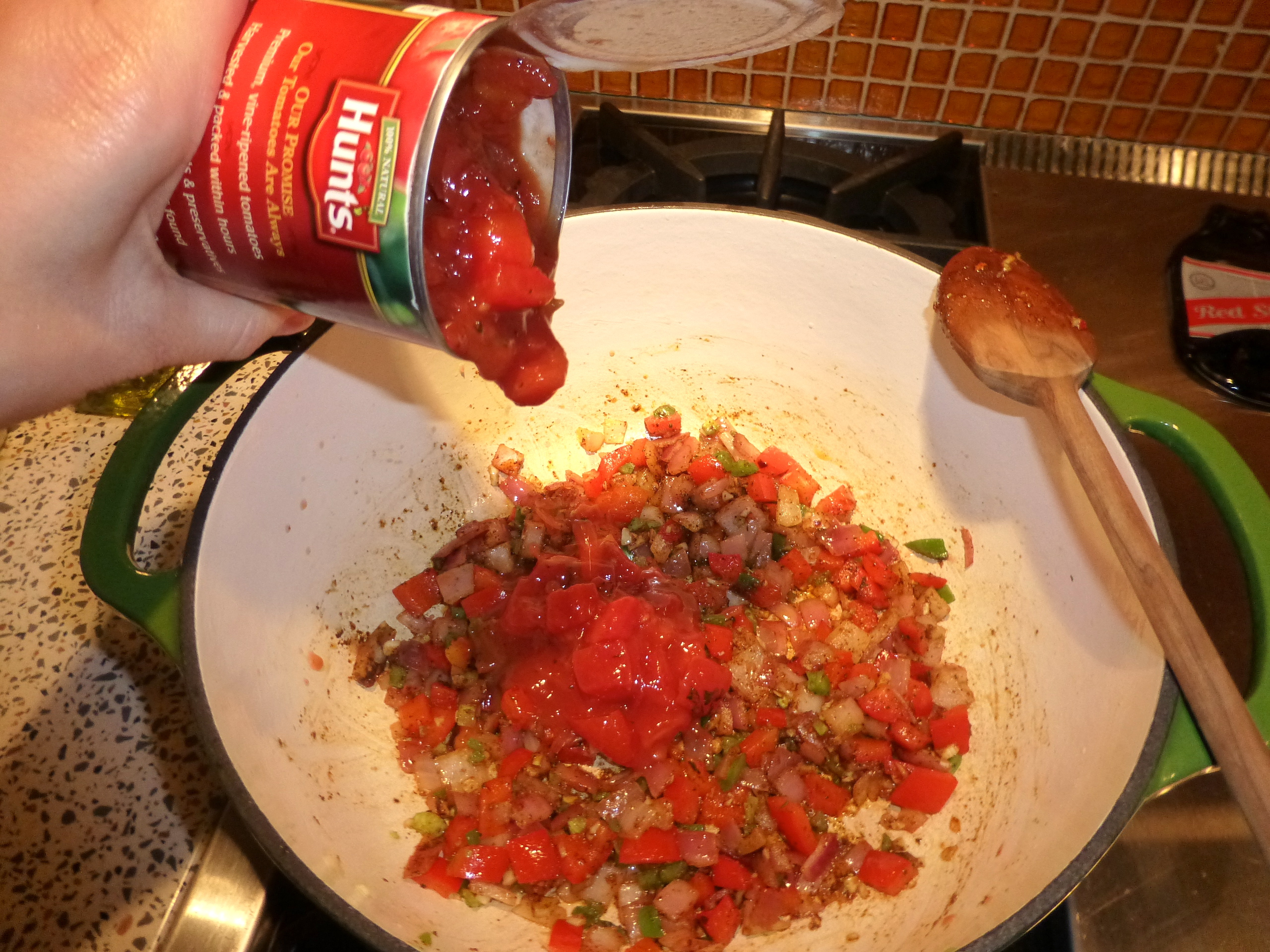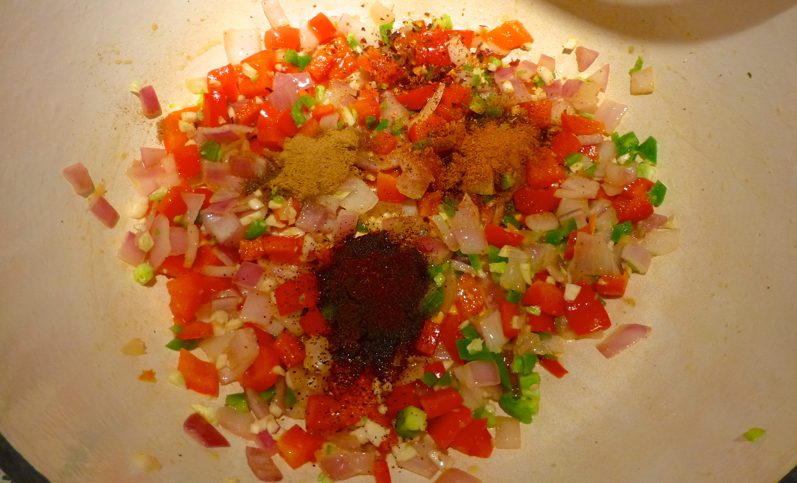 I sauté the onion and pepper in a bit of olive oil over medium heat for a bit, to soften them up. Next, I add the garlic and jalapeno. Fragrant and delicious!
